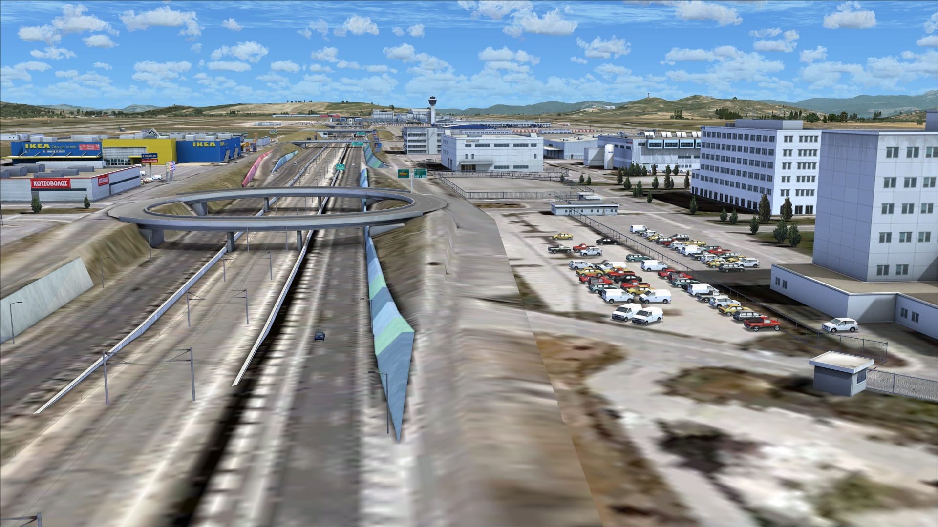 Athens has something that most airports do not have and that is taxiway and road bridges joining the two sides of the airport. If when you installed the scenery you enabled 3D bridges and set your mesh resolution to the required setting (this is also noted in the manual) you will see the bridges that span the Attiki Odos roadway and rail route which splits the airport in two.
