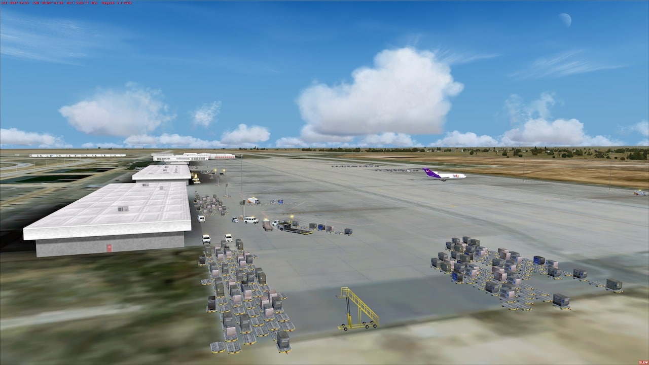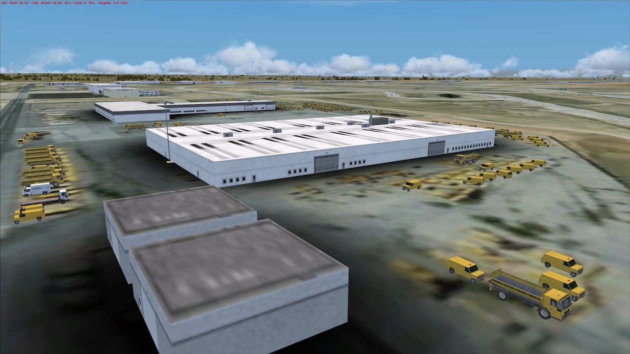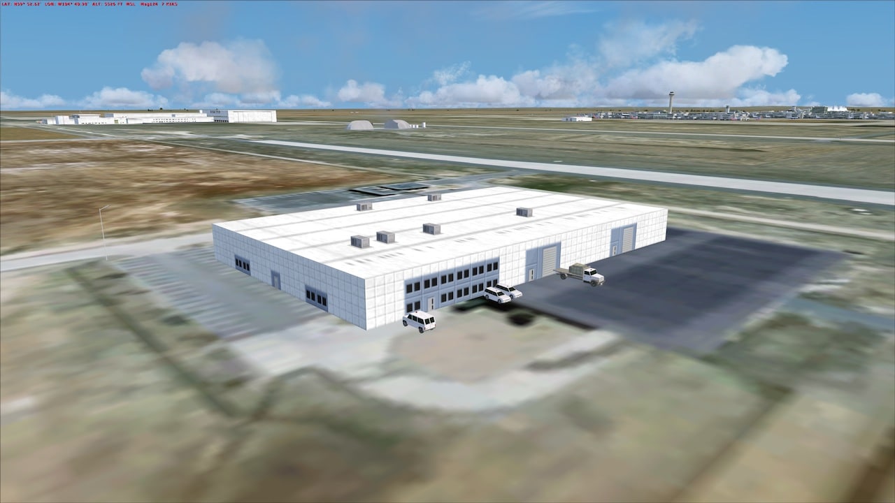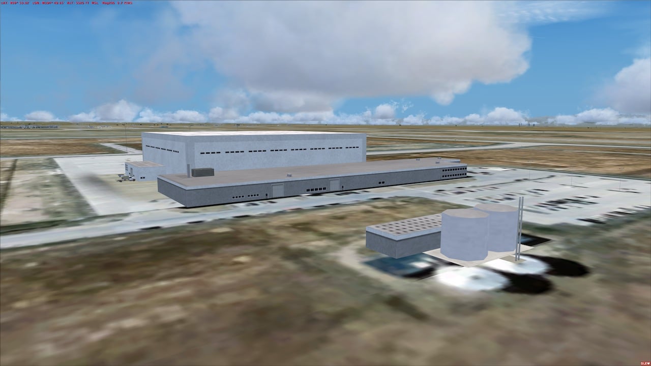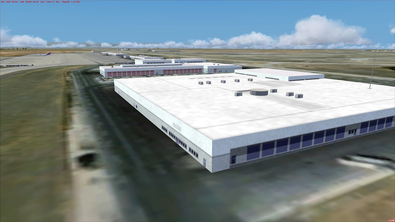 To be honest, I’m not quite sure what happened in ImagineSim’s representation of the cargo apron, because when I reference Google Maps, I get a rather different picture of the area (Google maps image data from 2011). While the positioning of the various buildings is in broad terms okay, there is one little building in ImagineSim’s KDEN that I see nowhere, not on Google Maps and not on other photographs. Perhaps I couldn’t find an up-to-date photograph, otherwise I can’t really explain the addition of this little building.