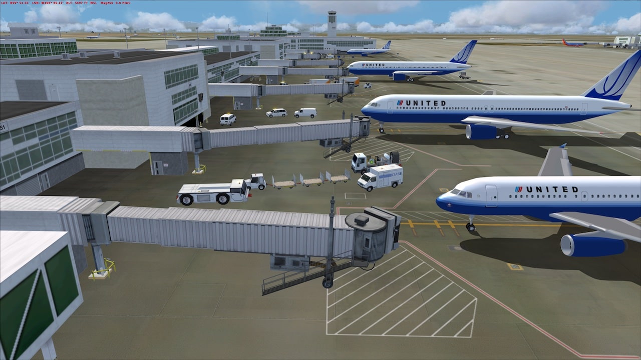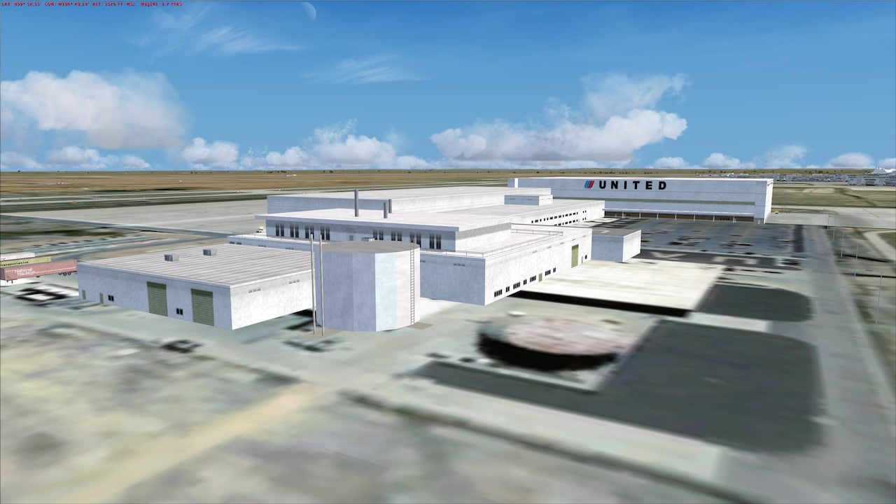 One of the most prominent buildings besides the terminal, is the really big United hangar you see in the above shot. The modeling is good overall, and the texturing is also okay. Notice the details, also: the ladder along that silo (wish the silo was rounder), and the fences on the roofs. That said, it isn’t too accurate. Look at the ground scenery, and you see a big white square with black around it. The black is usually a shadow, signifying that there should have been something here, yet we see no building modeled.
