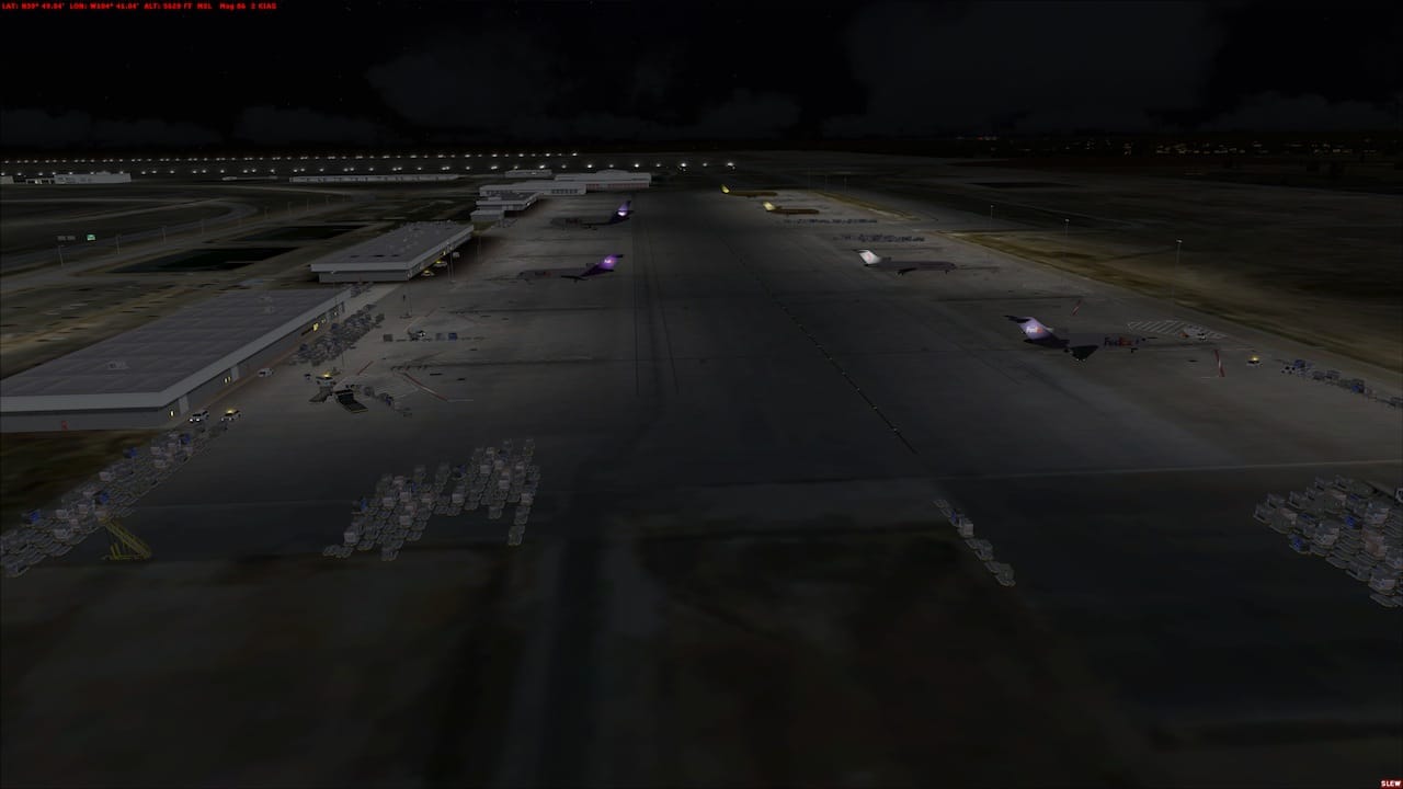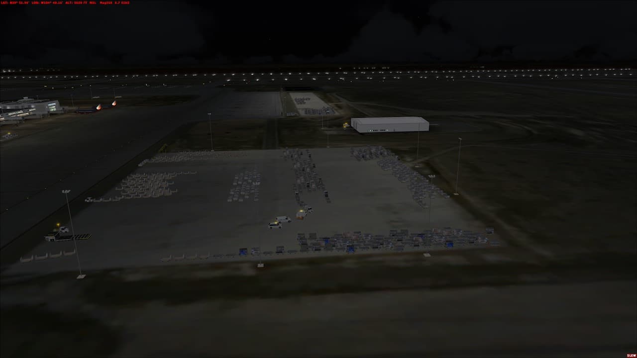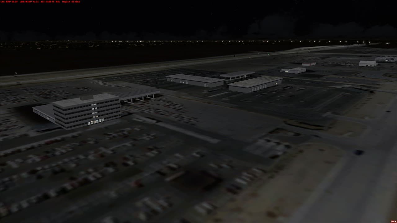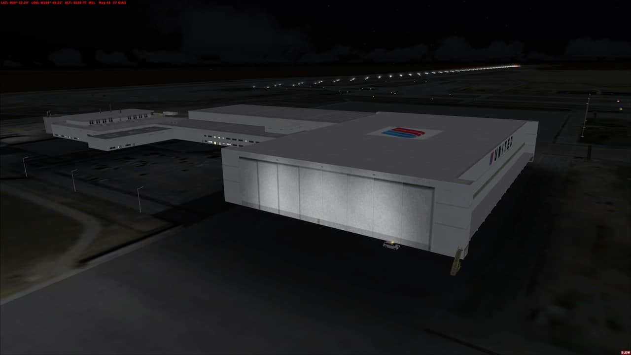 to be honest, I have seen better night lighting. The night lighting at this scenery is the sort that lights up everything, even walls. The lights on the lamp posts having also don’t clear effect. It’s there, you just have to look a bit for it and you’ll see there’s a lighting difference. it should probably be more obvious. As for the walls lighting up, the entire terminal seems a bit bright at night (see screenshots below), as if the walls have a soft fluorescent glow. Some structures, like the big United hangar, do have better night effects. Also the cargo apron has relatively nice night effects that actually look rather genuine (although the buildings are also weirdly lit). I just wish that the passenger terminal would be of the same quality.