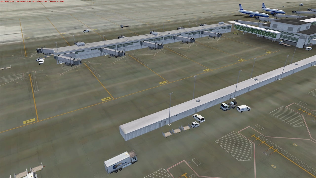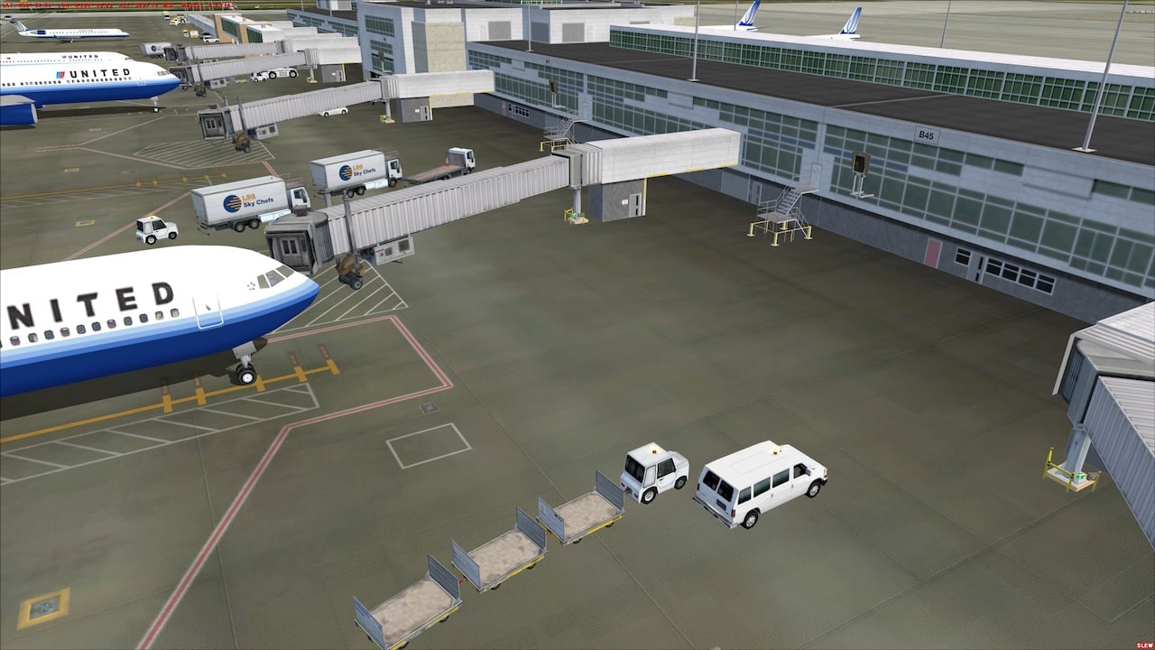 The above shot gives something of an overview of concourse B. First things that catch my eye are the rather nice modeling of the concourse itself. All kinds of stuff seems to be included, for example some air fans on the roof. Secondly, the texturing isn’t my favorite, again. Also, the amount of ground equipment is again huge, and finally, the ground textures appear rather blurry from this point of view. We shall go and look from closer by now.