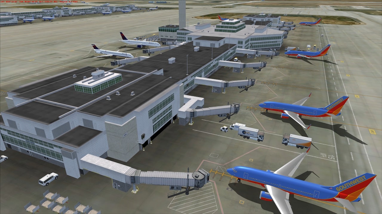 On to concourse C now, and it’s the smallest of the three concourses. As you can see, it facilitates operations of Southwest, for one. Much of what would have been concourse C is actually a large parking area for ground equipment, and ImagineSim made sure to place lots of it. I really like that, because it gives you a very good impression of what the area is used for. That said, the texture quality of this area really doesn’t seem very good, although the roads you see laid out halfway the grass do include some nice details, including white markings. So, the resolution should be okay. I’m therefore not really sure what constitutes the blurry look of the grass. We will now go to look at the concourse from closer by.