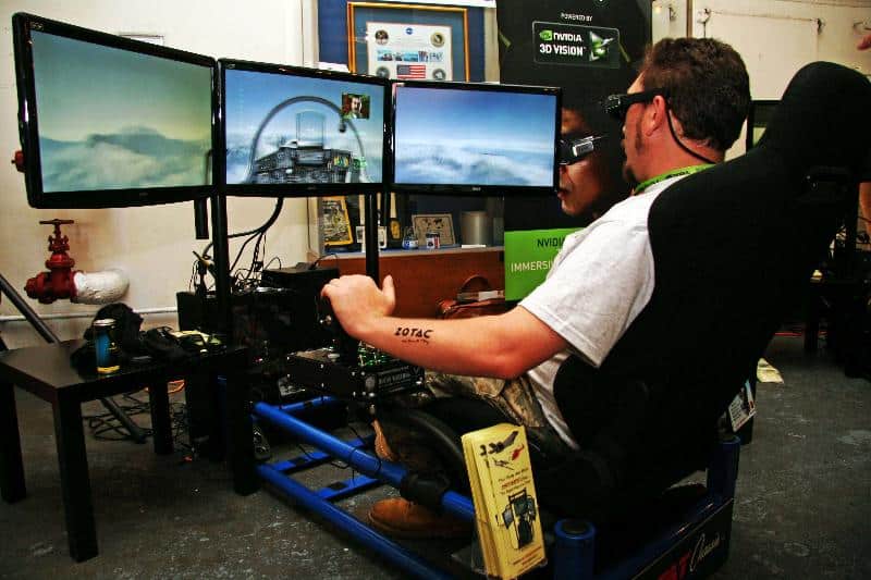 “Partnering with Nvidia’s new 3D video system displayed on 3 27″ 3D monitors the HotSeat Combat Sim delivers a compelling visual experience flying with the newest A-10 controls. Stop by Booth 2189 for a test flight.
