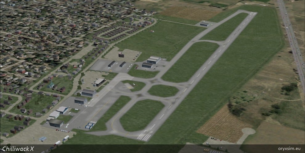 In fact, Chilliwack airport in British Columbia is a popular GA and commercial field, with around 75 aircraft based there and a terminal capable of handling small airliners up to 19 seats. In addition to the airport itself, OryxSim’s rendition includes corrections to the surrounding roads and adds the adjacent settlement.