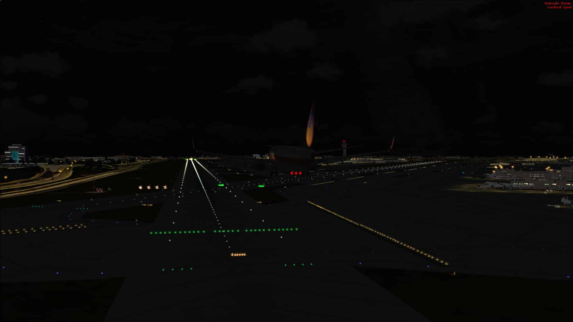 Night time at Miami is also a busy time. The lighting was well done for the most part. Building lighting along with apron lighting was good and gave the airport a realistic feel. Where I had a problem was with the ground lighting for the runways and taxiways. On the approaches everything looked fine, good intensity colours but once on the ground and taxiing to the terminal the lighting looked more like solid blobs of colour rather than the glow of lights, this was especially true for the green center line lights. As I was taxiing I also noticed that sometimes the green colour would disappear as I taxied along and then they would suddenly reappear.
