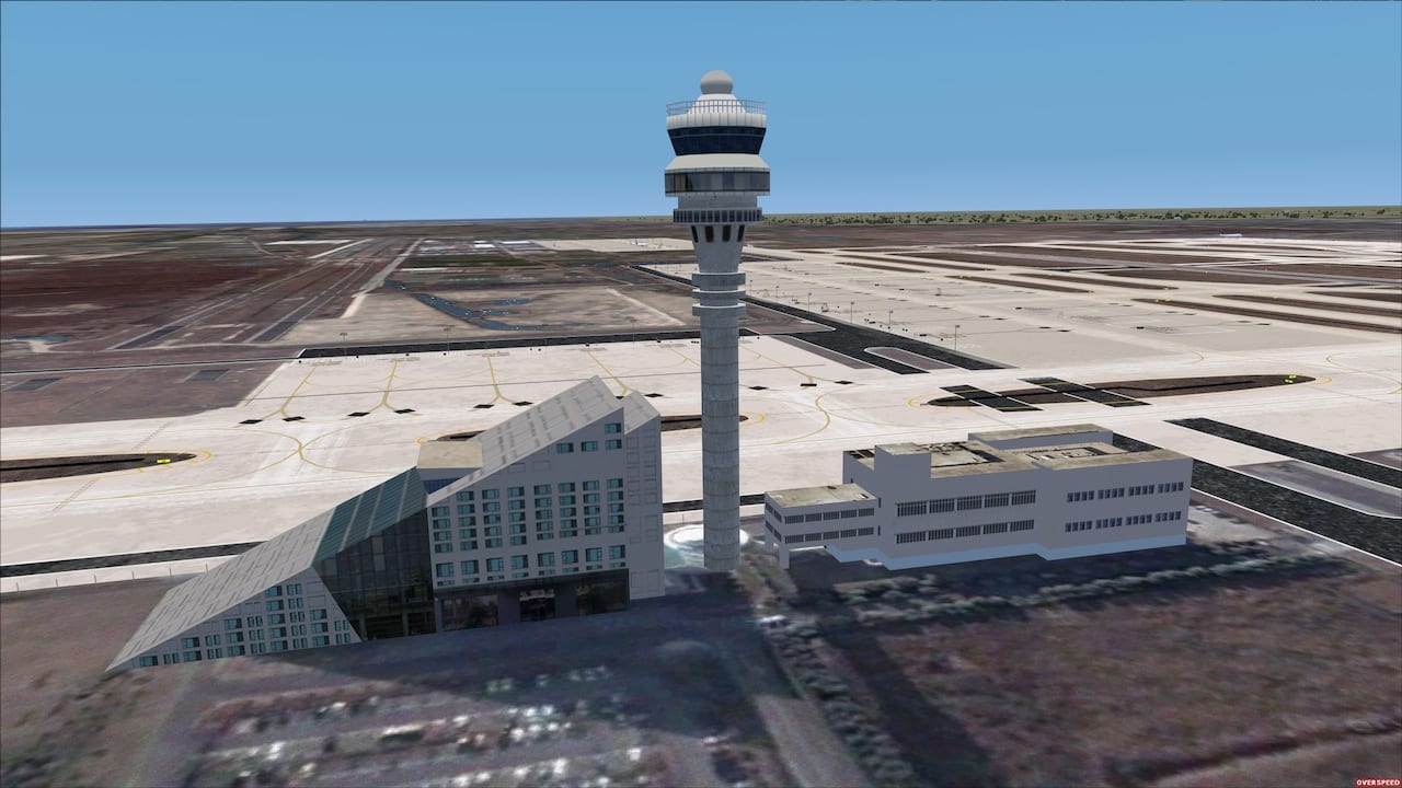 The control tower has much the same fate as the previously looked at buildings: modeling is very nice, texturing is equally good, but the positioning isn’t entirely correct. Furthermore, it might have been a good idea if some of the ground textures here would have been adapted a bit so that you don’t get a flat ATC tower on the ground, with the actual 3D model sticking out of it. It looks a little strange. With Photoshop it wouldn’t have been very hard to alter the satellite imagery a bit to get this corrected.