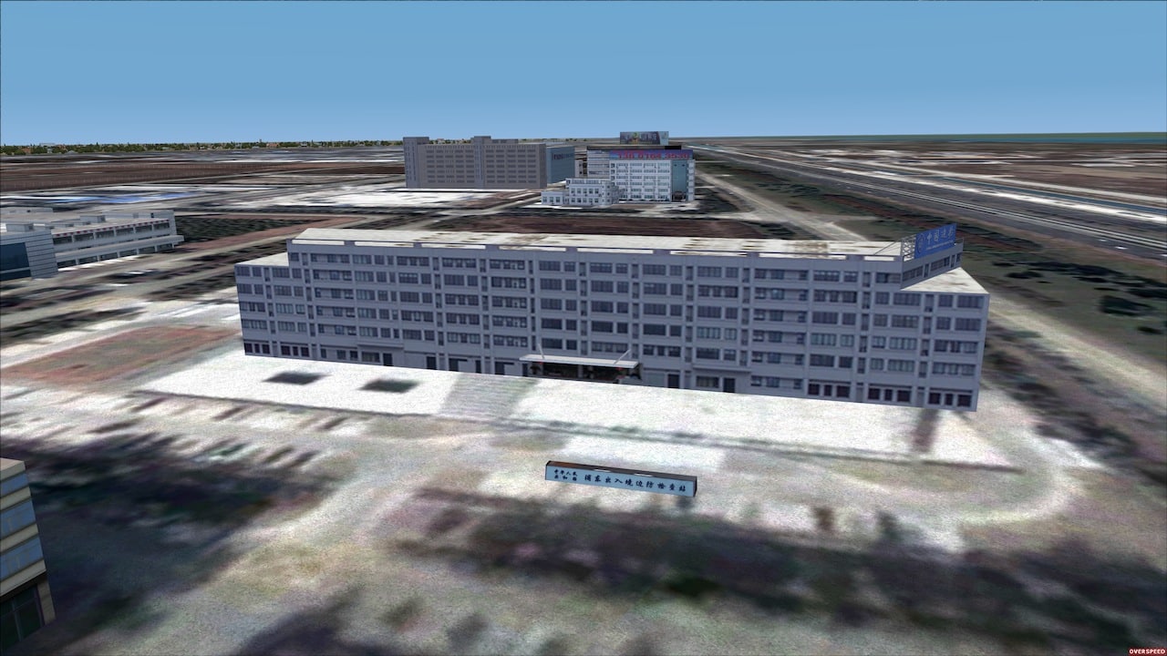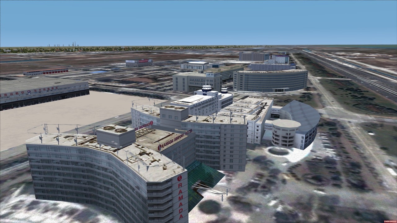We move somewhat closer, until we hoever above one of the roads leading up to the drop-off point of terminal 2. We see some road signs which appear to be real ones, even though they are unreadable (even if they wouldn’t have been blurry, I can’t read a word of Chinese anyway). The drop-off point itself looks somewhat nicely modeled, even if it is void of any activity whatsoever due to the lack of cars. Granted, you can’t see them anyway when flying in and out of ZSPD, so it’s not much of a loss, but at least moving traffic going to and away from the drop-off point would have been a big plus.