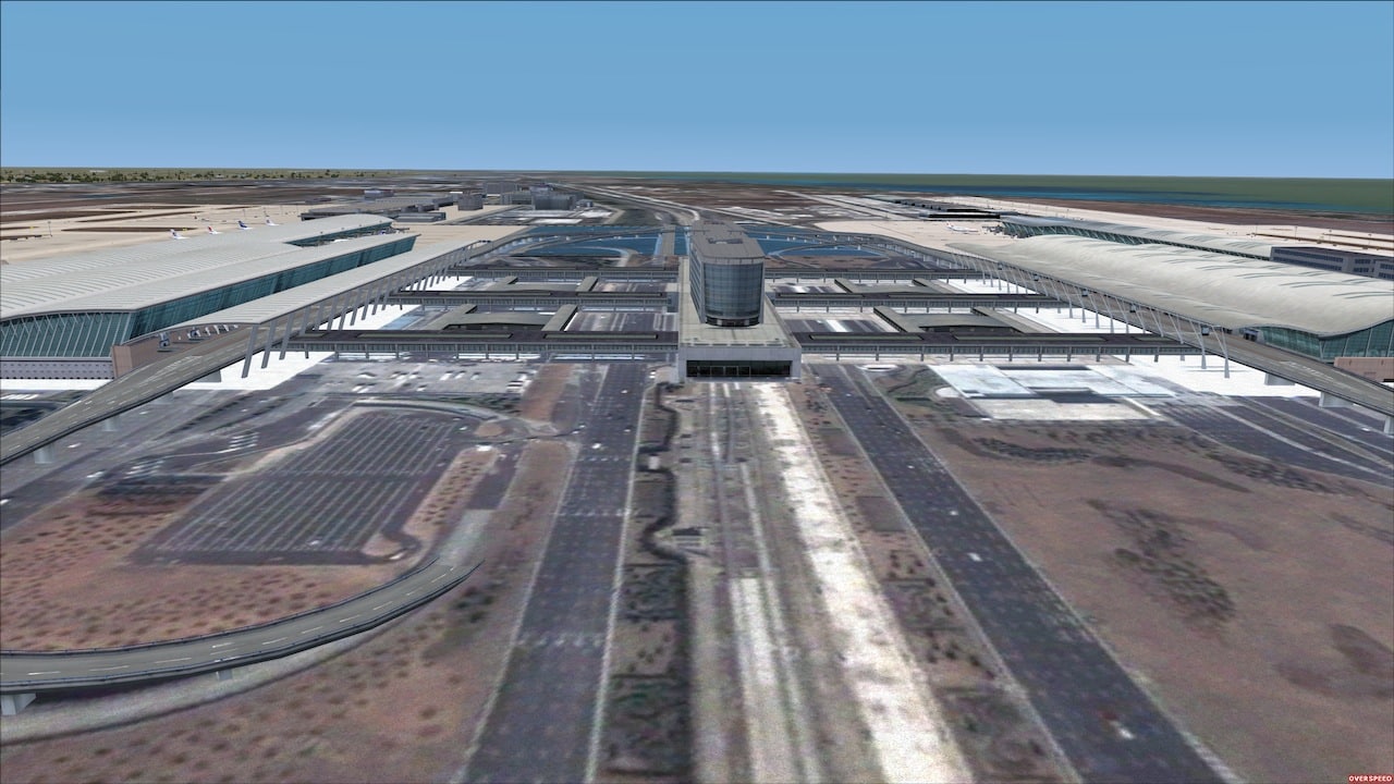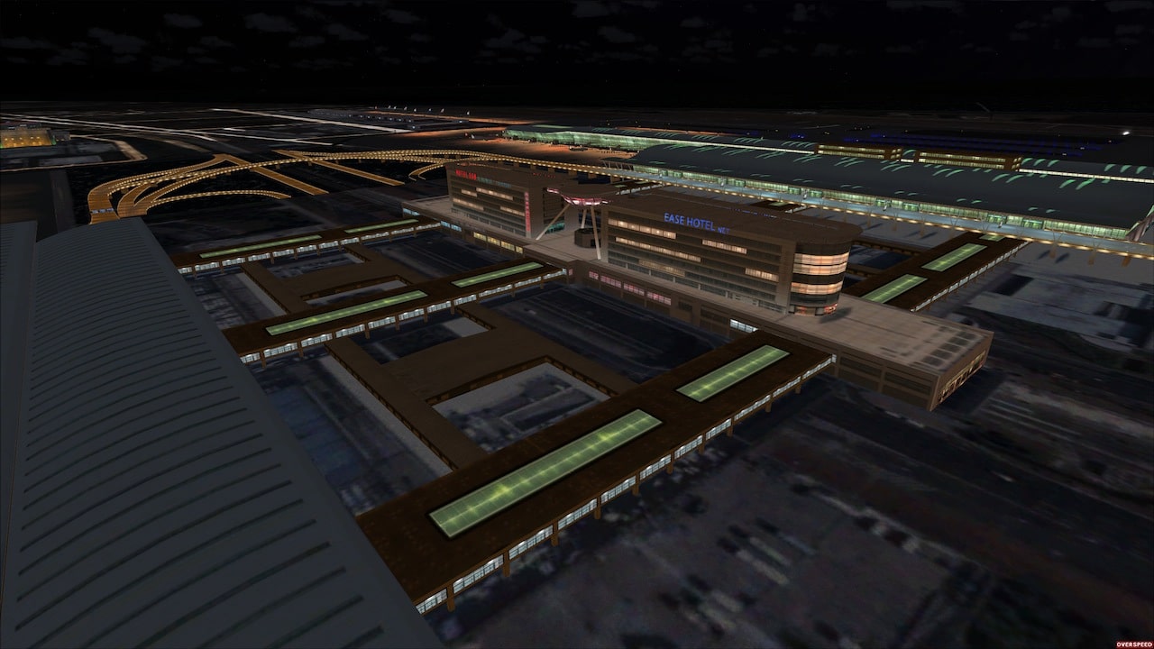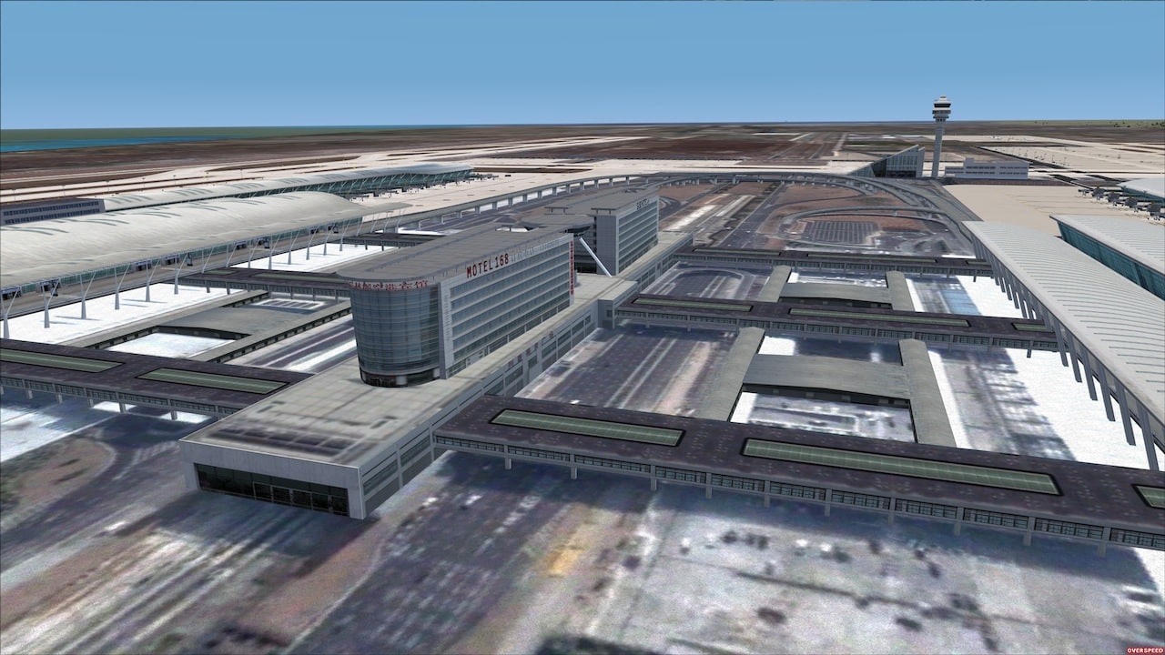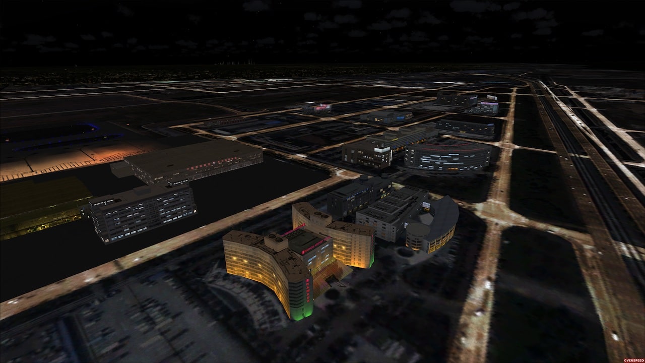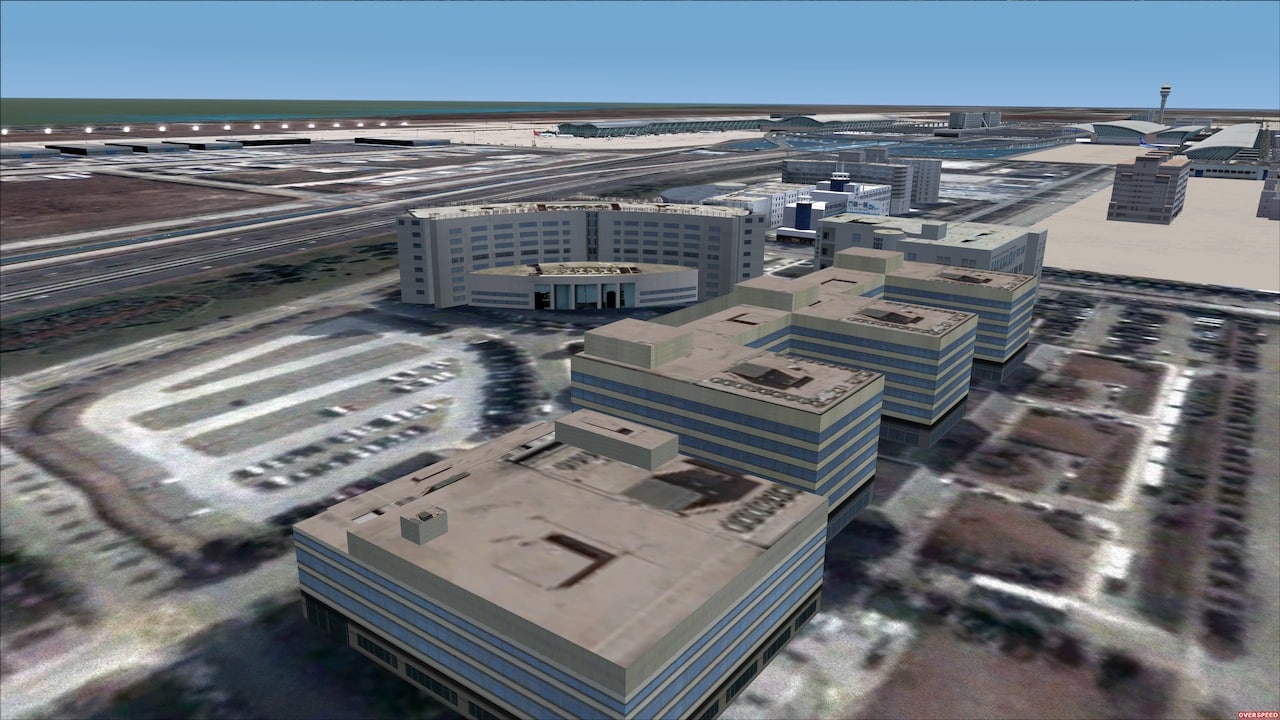 Moving a bit closer, we get a better look at the hotels and the walking bridges that connect them to the terminals. In principal the modeling here is quite okay. The texturing also looks quite nice, and the ground textures are a satellite photo, which adds realism. All in all it looks quite okay. It’s however the details which are sadly missing. The glass roofs on the walking bridges look like they should have been protruding from the roof. There are no cars at all on any of these large roads running in between the terminals. It seem to me like a lot of missed opportunities to make the airport a truly special scenery.