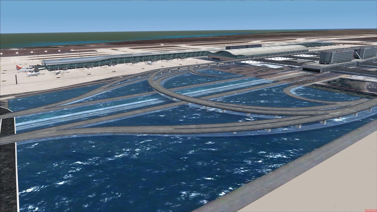 Some of the roads are elevated. These are interchange roads, bringing cars to and from the drop-off points of the terminals. While this is a very nice addition, I would have really wanted to see that the roads of the satellite image would have been removed. We now see “double” roads: one is flat on the ground, the other is 3D model hovering above it. Not only does this look somewhat sloppy, it adds a new issue: it’s easy to see now that some of the elevated roads aren’t correctly modeled and placed. If you look closely, you’ll see 3D roads only barely connecting to their 2D counterparts, often being a few meters too much to the left or right.