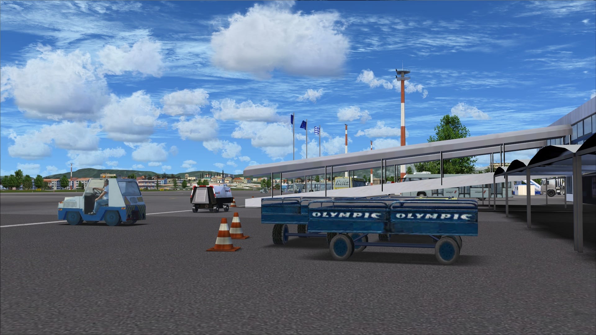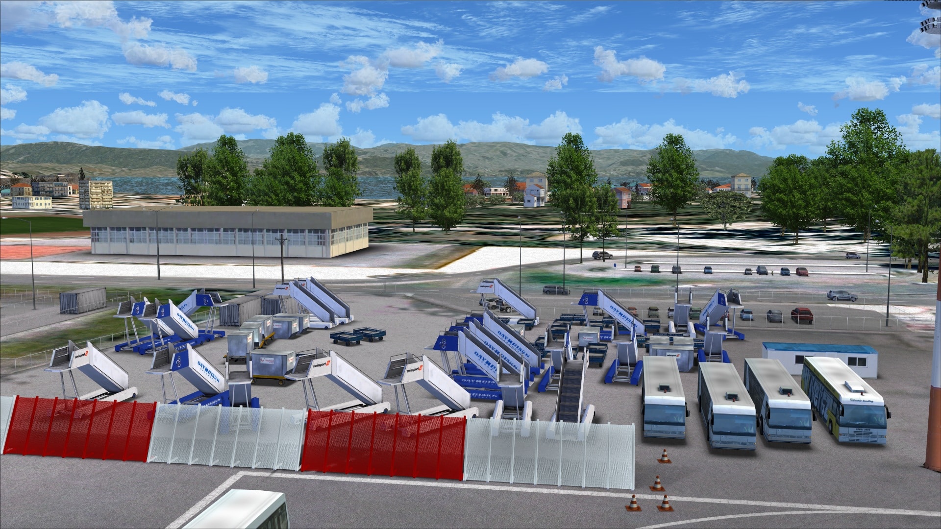 Strategically placed in front of the main terminal buildings there are some static vehicles along with several portable power units and then some smaller miscellaneous objects. These elements combined give the main apron a look that there is some activity happening.