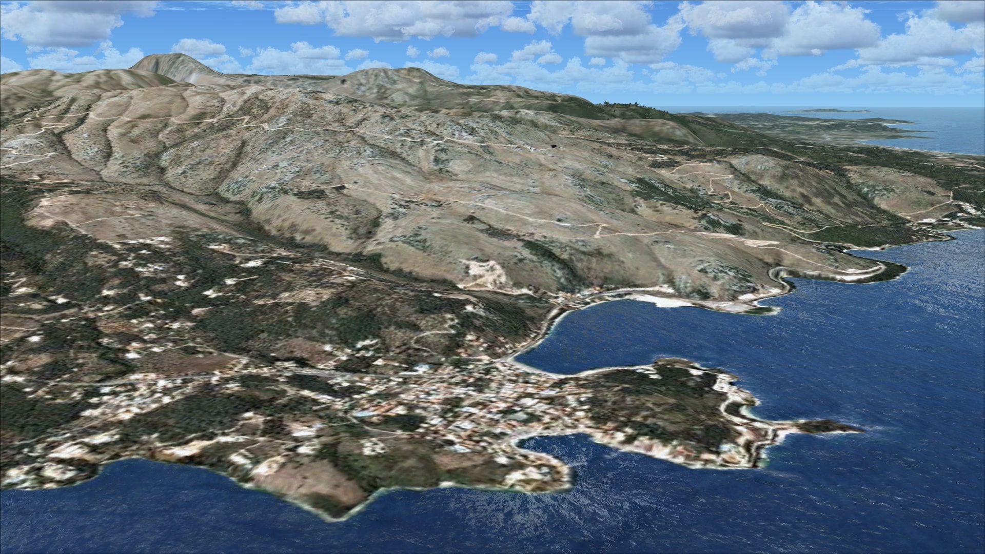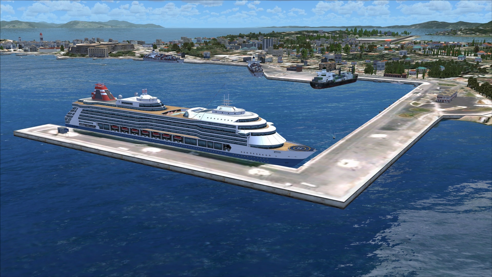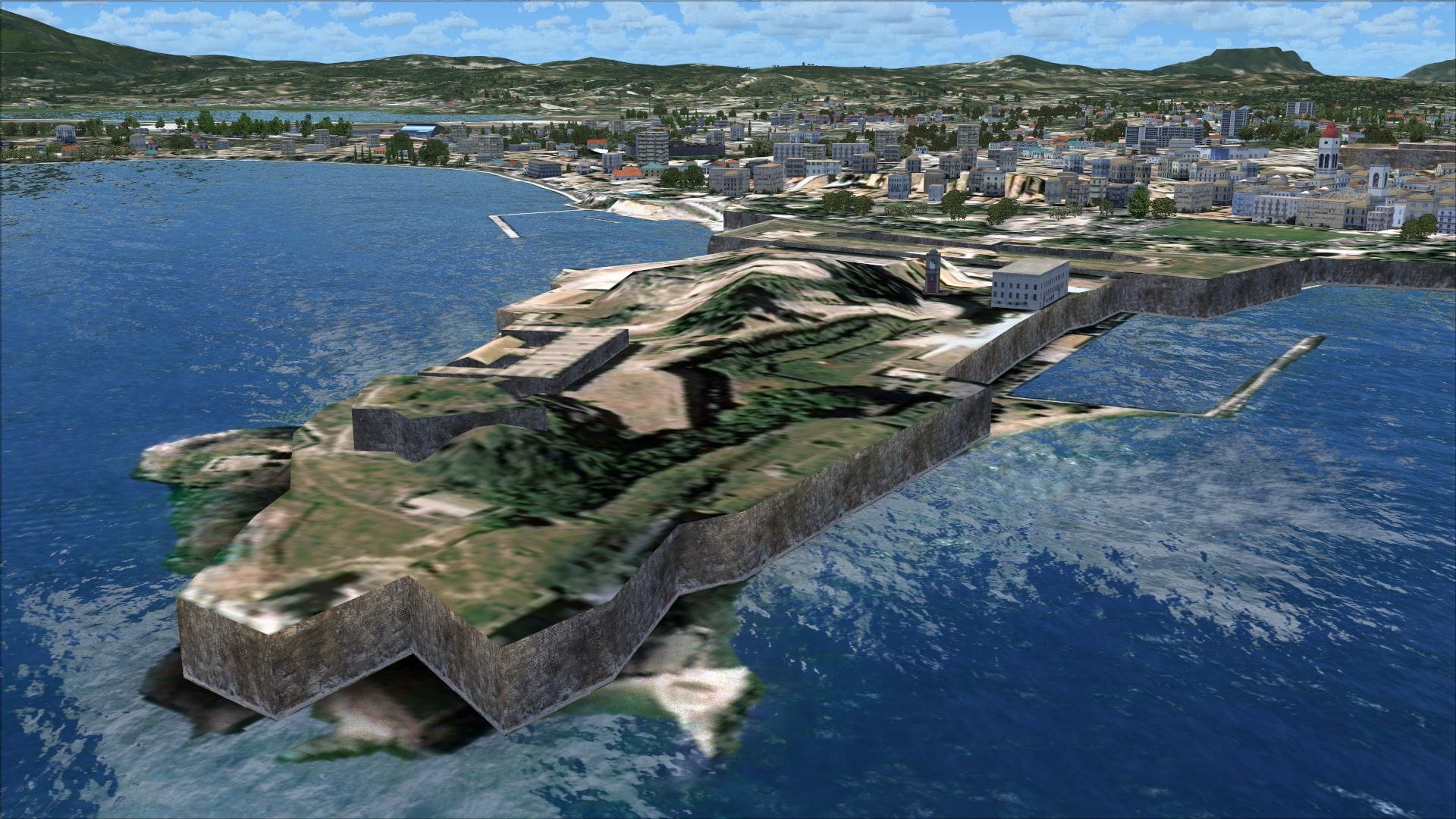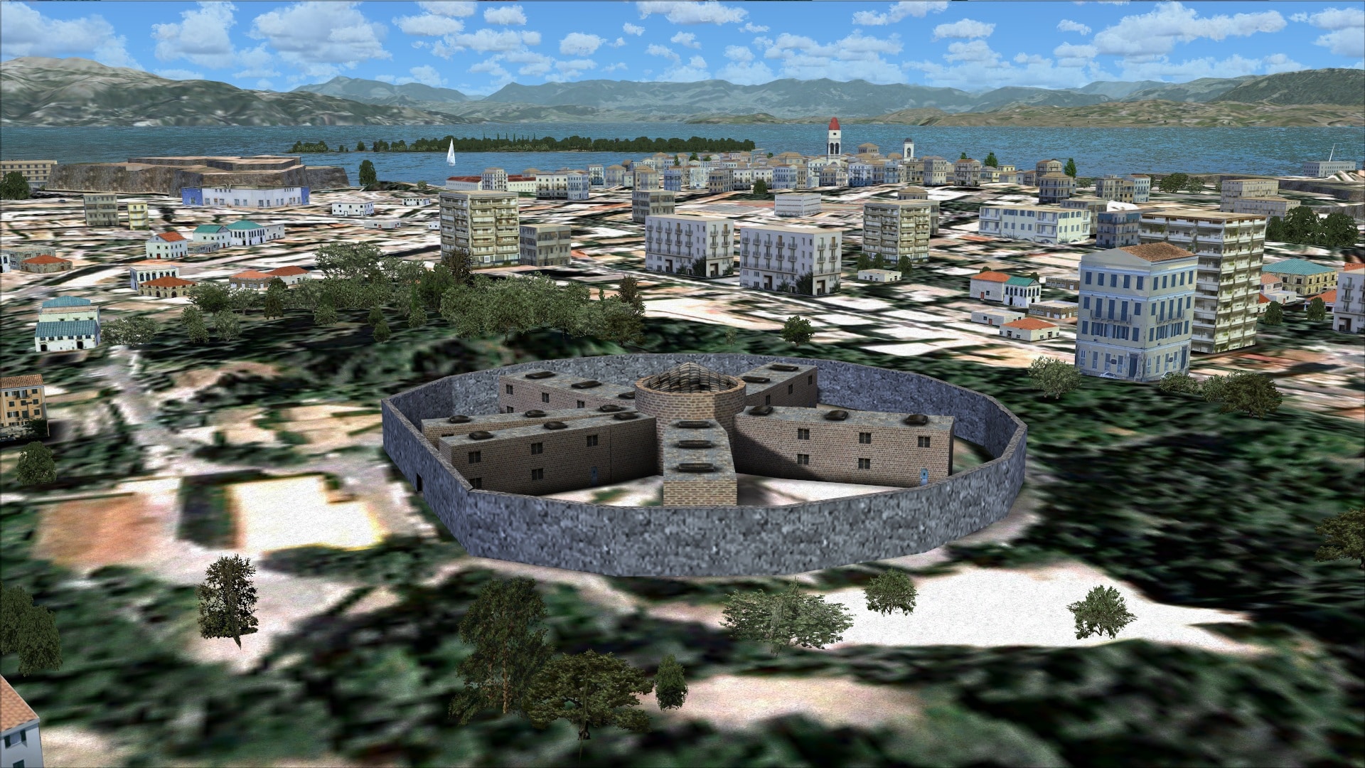 The nearby town of Corfu has been populated with autogen, mostly standard FSX type however some of it is custom so you do get to see several of the old historical structures like the Fortress of Corfu. Just to the north they include the harbour with some large ships including a cruise ship. The autogen unfortunately is confined to the city of Corfu and a small area along the approach paths to the airport.