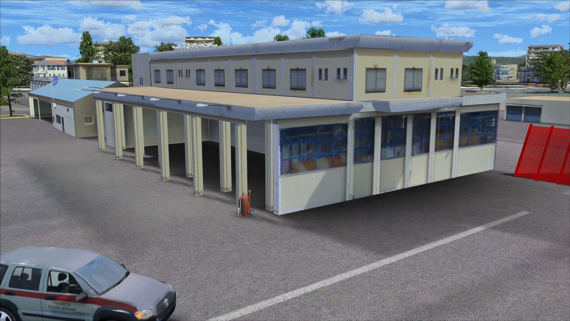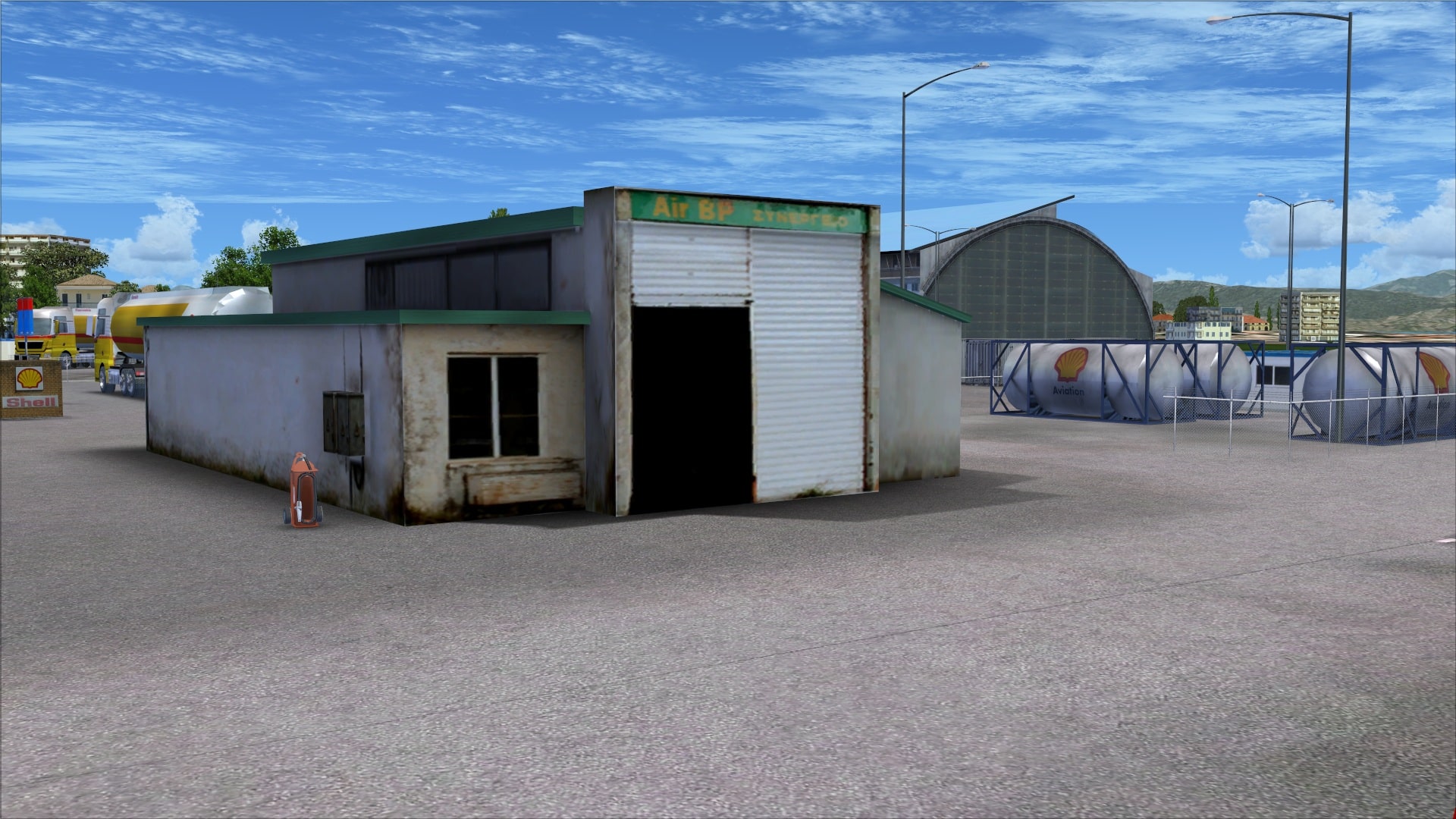 The other buildings such as the security checkpoint, fire station and fuel farm include extra bits of detailing such as exterior light fixtures and a/c units. The buildings like other parts of the airport look weathered and aged.