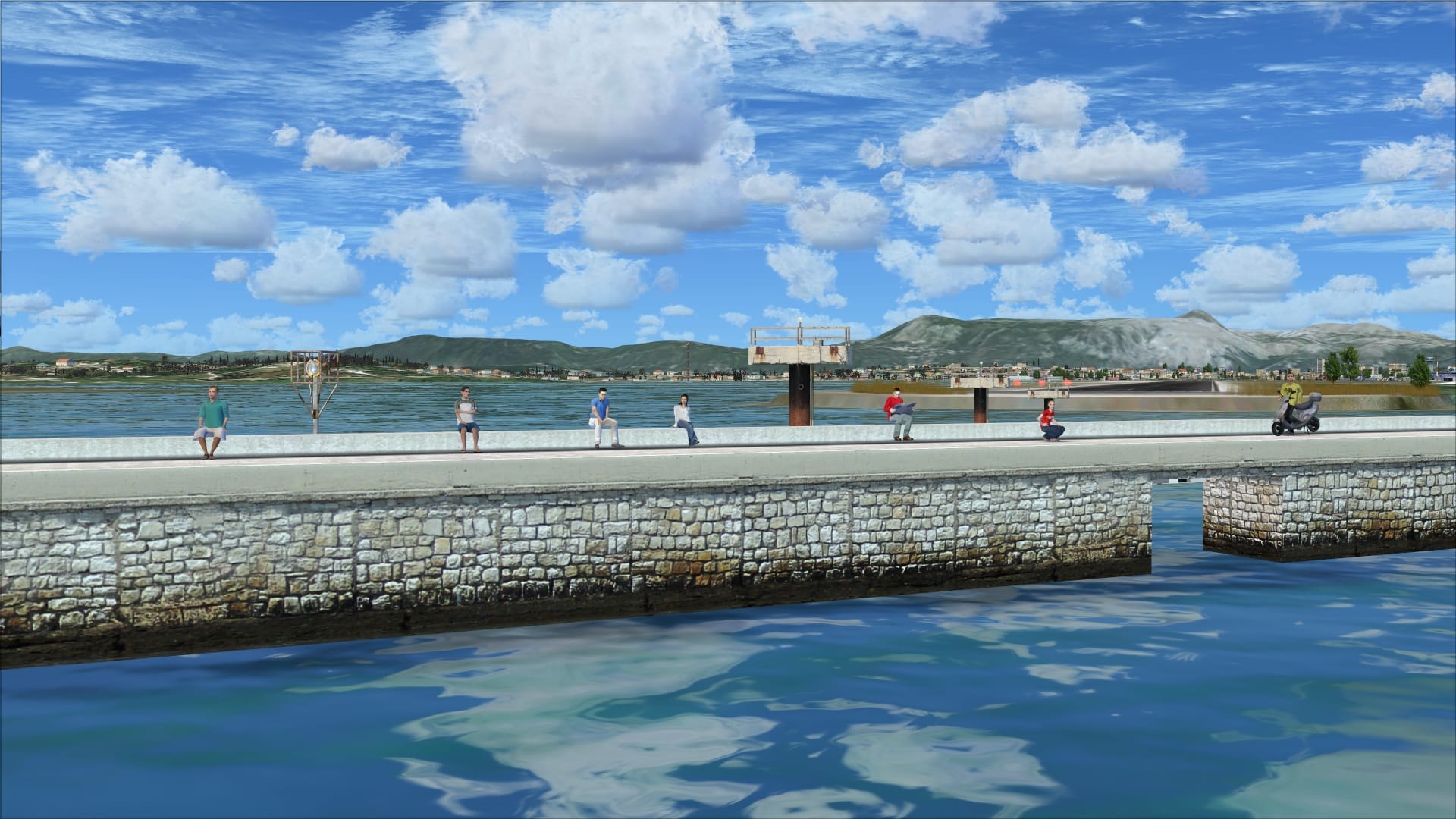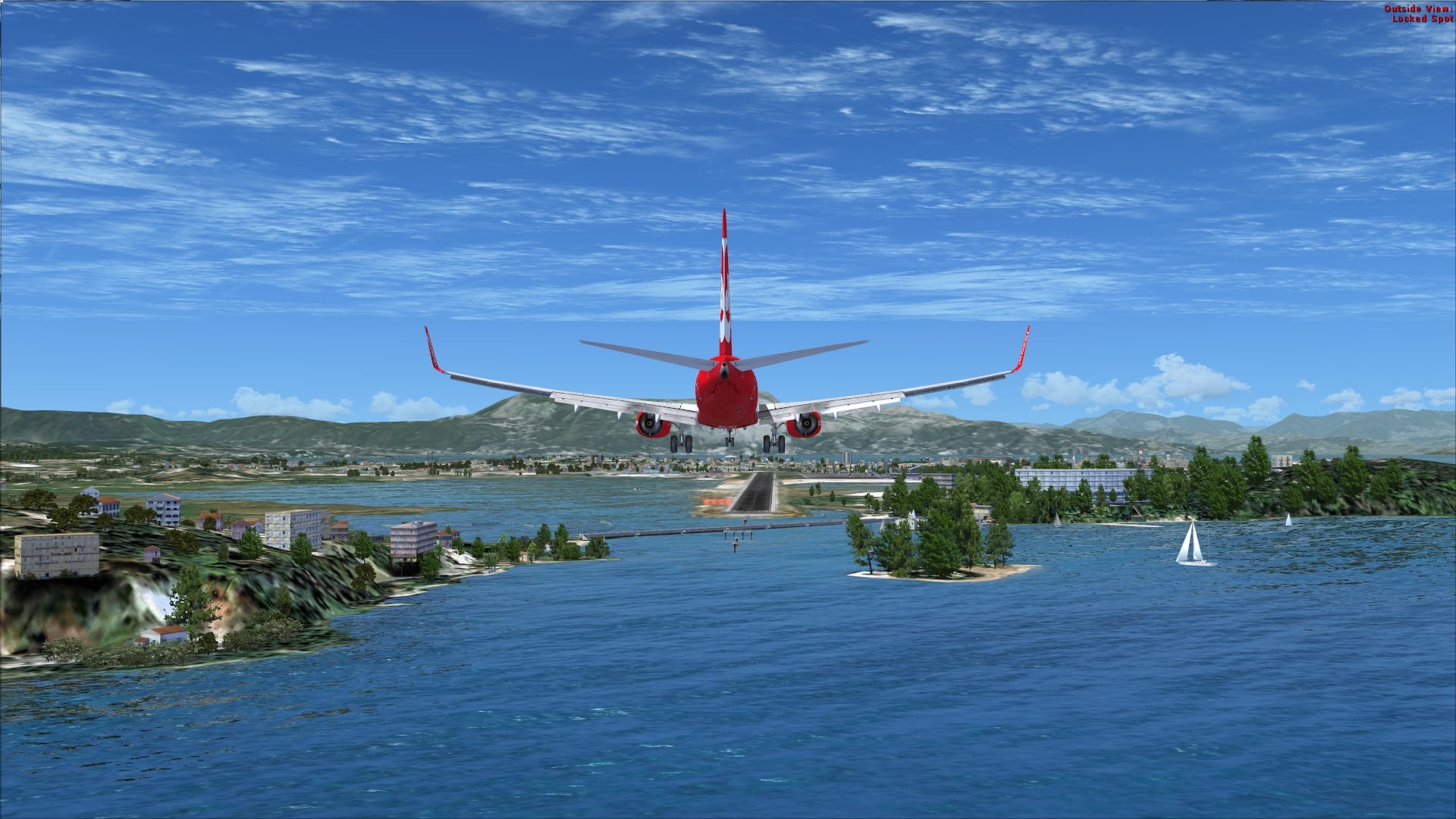 The approach to runway 35 is an interesting one that I really enjoyed. The approach path takes you past some nice scenery features like the Monastery of Vlaherna and the Corfu Holiday Palace. Also crossing these waters directly below the approach is a low concrete bridge that is ideal for plane spotters. The scenery recreates this interesting vantage point.