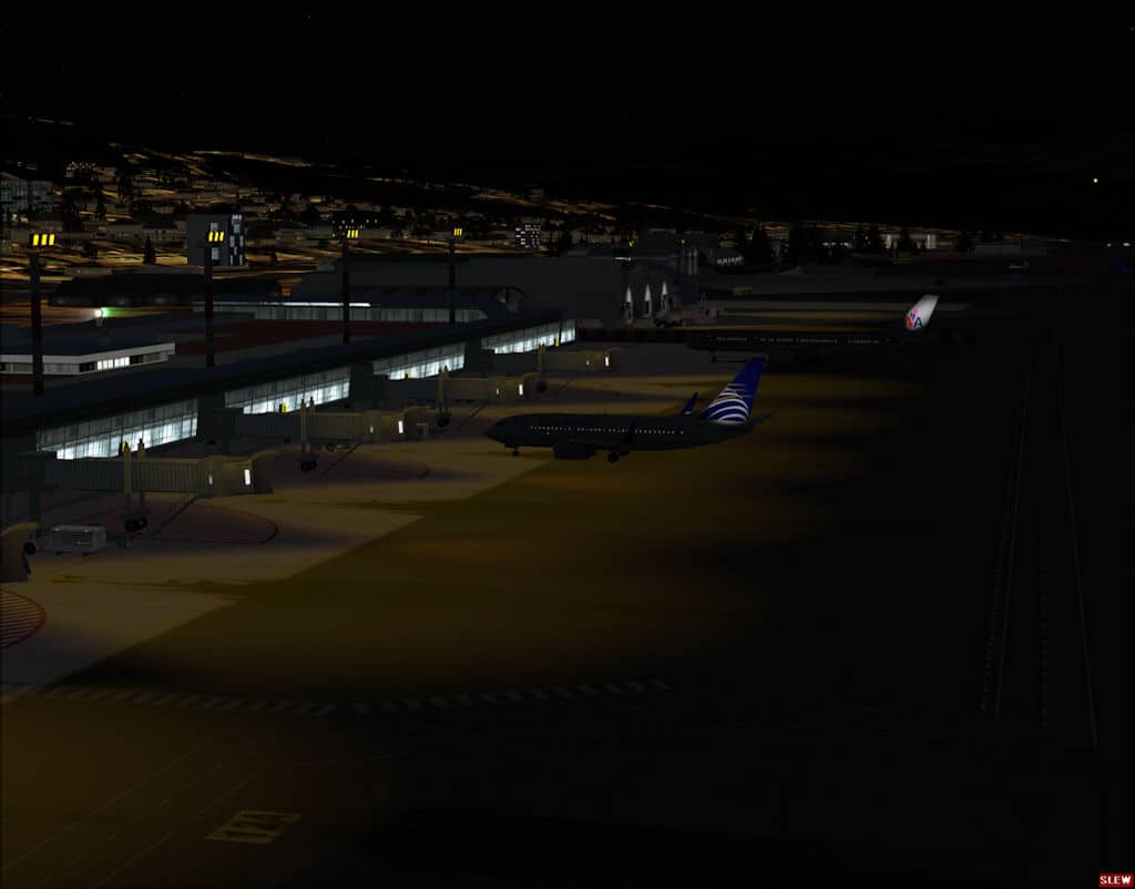 The airport at night is lit well and the taxiways and runways are easy to follow. He has included lights for the stadium’s, too.