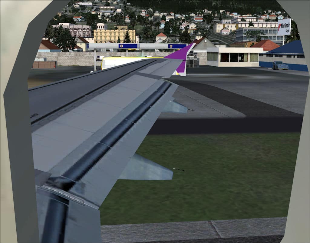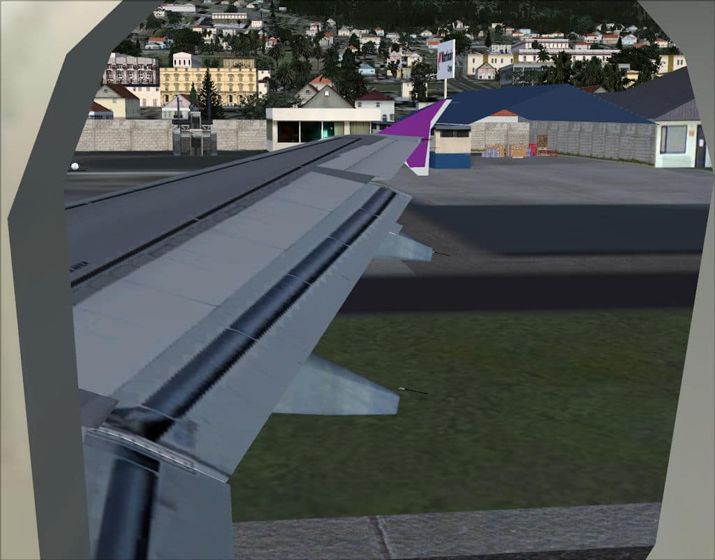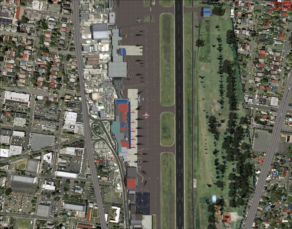 Moving ground vehicles are included with the FSX version and that includes major roads being accurately drawn with vehicles travelling on them. Here’s a shot looking down the road outside the airport.