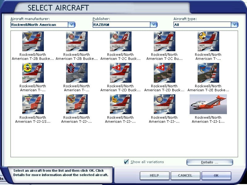 Fifteen textures are included, comprising five T-2J-1S schemes, two T-2Bs, five T-2Cs, two T-2Ds and a single T-2E. Most of the paint schemes are US Navy hi-visibility red or orange, so are fairly similar, with three aircraft wearing camouflage paint.