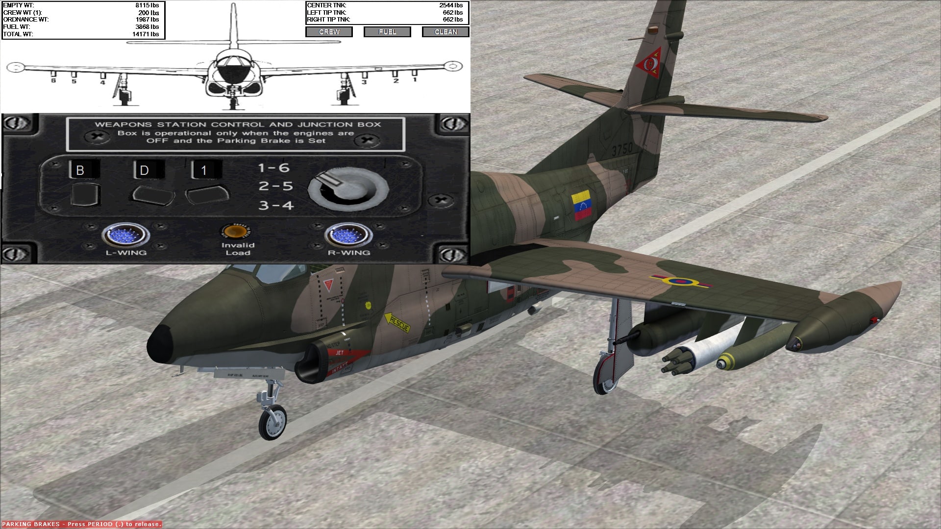 Being British (and having checked out some Venezuelan airbases, which all seem to be in craters in FSX), I decided to do what the British military do best and blow up a Scottish island to test the system out, so loading up the camo T-2D at Lossiemouth, I shut the aircraft down from its default engines running state and loaded Mk.82 BBs on stations 1 and 6, Zuni 4-packs on stations 2 and 5, settling for .50cal M2HB gun pods on the final inner hardpoints, 3 and 4. The aircraft visibly settled on its haunches as each weapon was loaded, rising and falling on its suspension as I added and removed the weight.