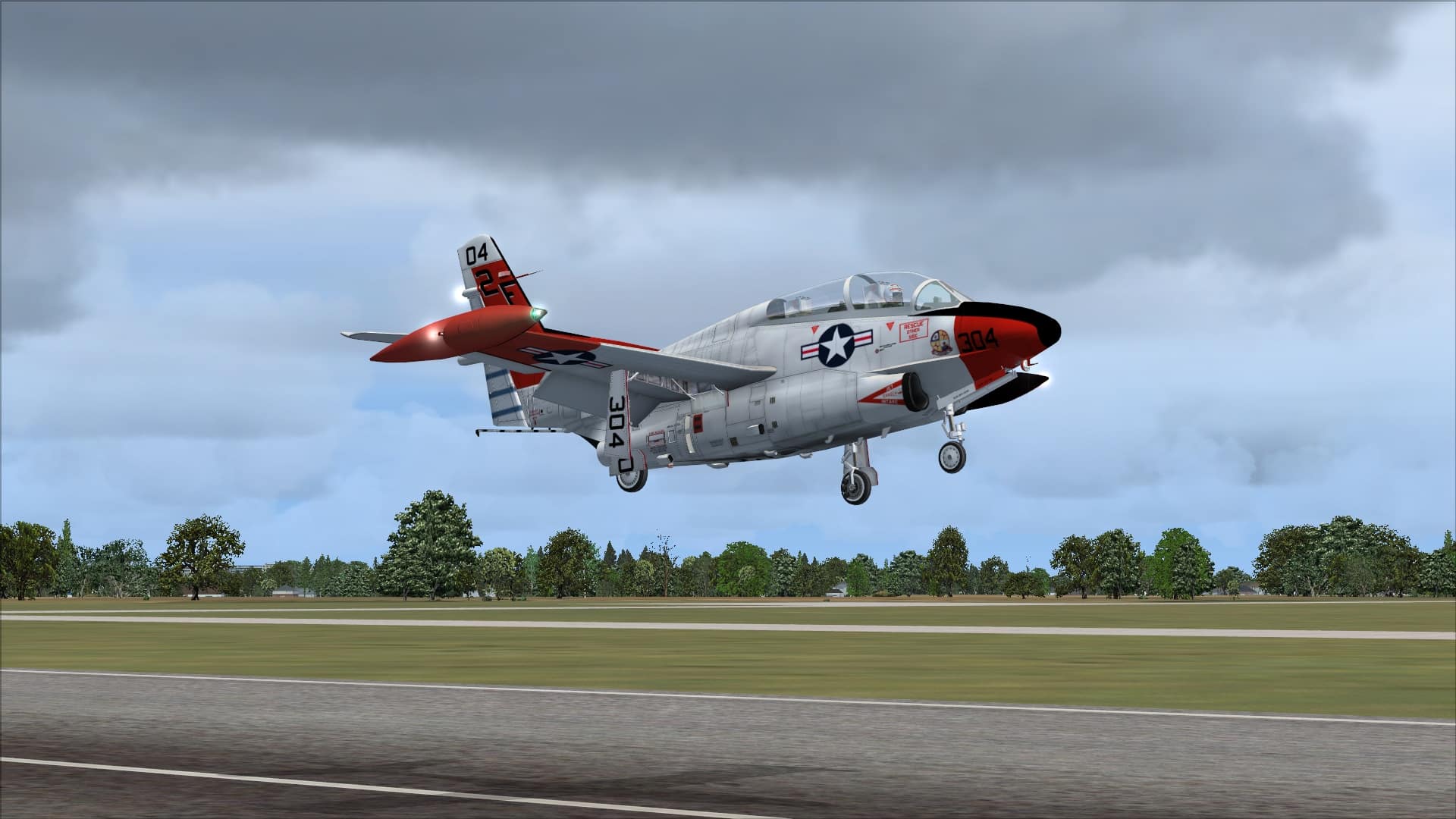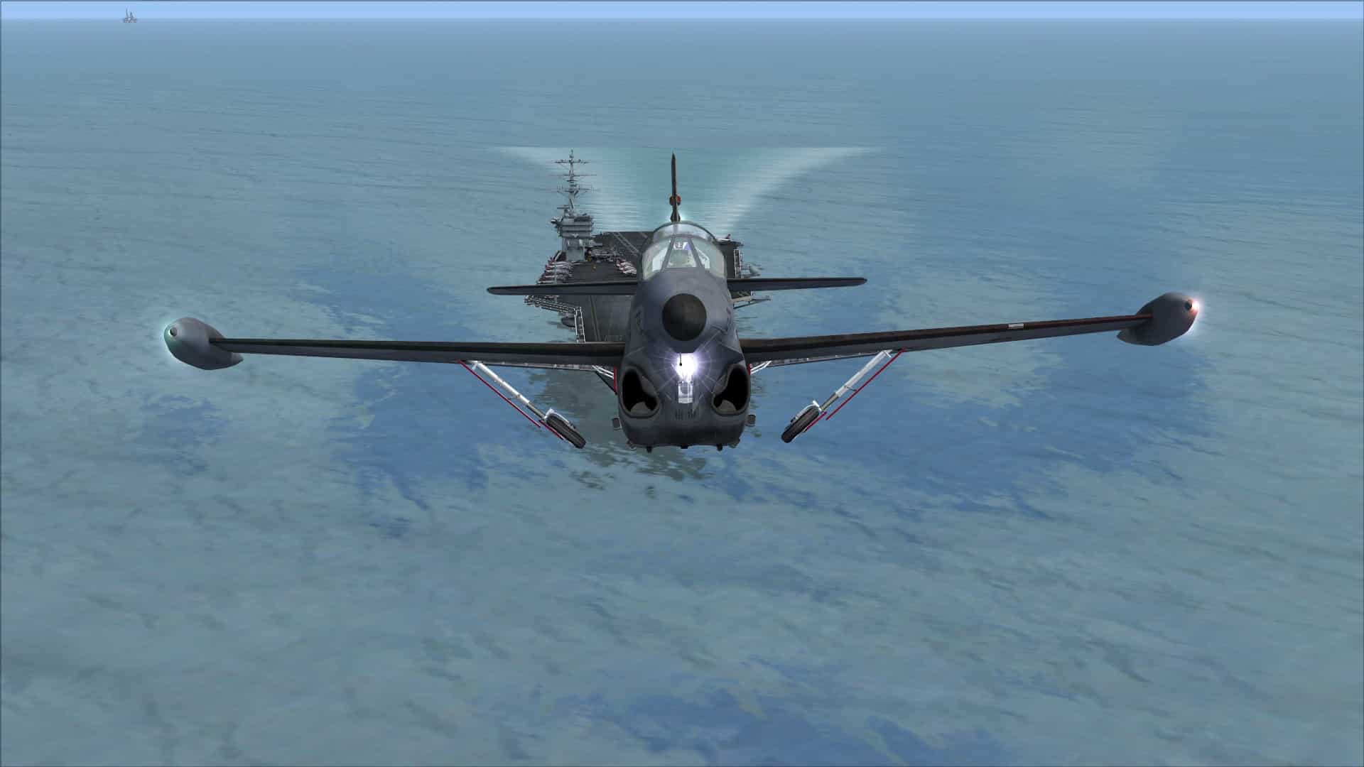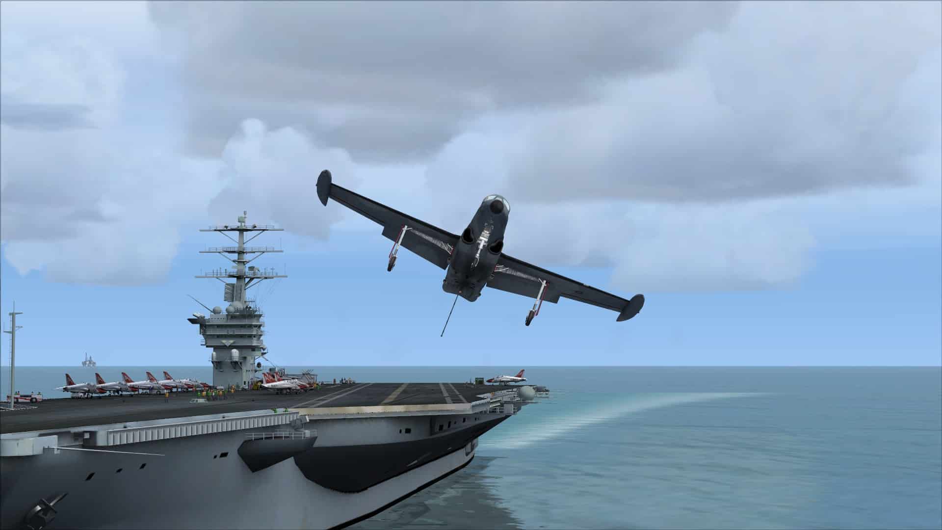 One nice thing about the aircraft’s stability and my already knowing that you need to keep power on with old turbojets was that the first approach I flew to an aircraft carrier, using AICarriers to set one up heading directly into a 12kt wind, was a success. It wasn’t perfect, I think I caught the 2 wire, but considering how long it has been since I flew a carrier approach in FSX before testing this aircraft, I had expected at least a few missed approaches, probably a few crashes, before I got it right. Nope. First time, the aircaft plomped onto the deck with minimum fuss and I was able to taxi straight across and launch again. Second approach was actually worse, but I still got it down. So, this is a good carrier landings trainer then!