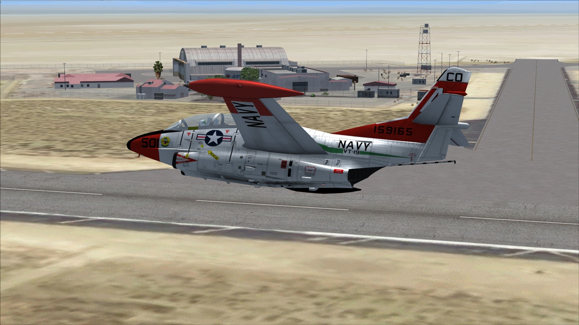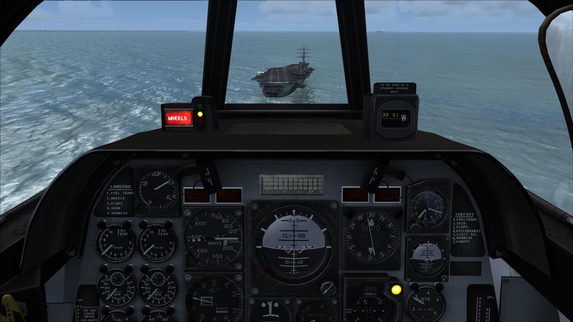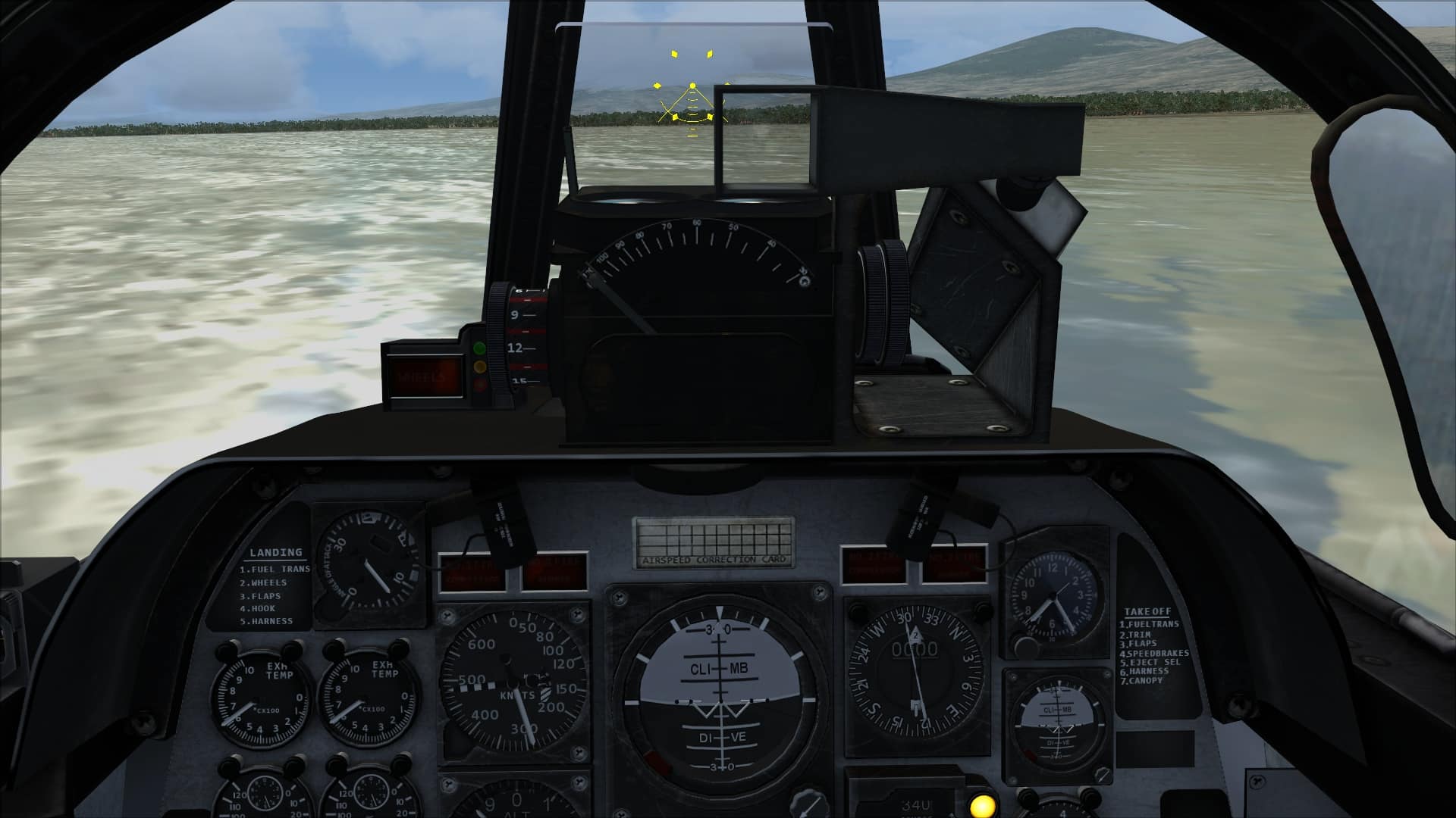 Again, due to the lack of advice on checklists or reference cards, the only information available to determine an approach airspeed are a warning on the panel that the gear should not be operated above 165 knots and the aforementioned and tested stall speeds. Thankfully, being a fast jet and a naval one at that, all the variants of the T-6 included are equipped with angle of attack indications. Provided you keep the yellow light lit to the left of the forward windscreen (green is slow and/or nose high, red is fast and/or nose low) and the meatball, ILS needles or runway where you would expect them to be, you’ll be fine. Depending on the approach configuration and angle, I usually flew approaches at between 130 and 140KIAS, which with full flap and the gear down requires a surprising amount of power to maintain a 3 degree glideslope.