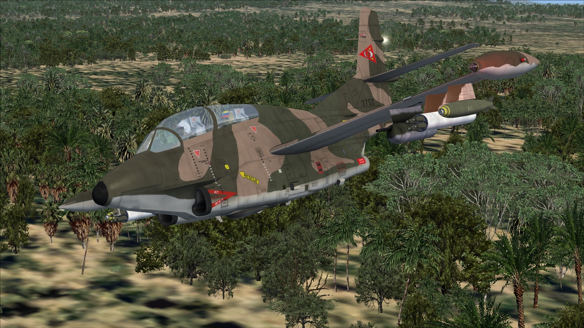 There are a number of different variants of the T-2 airframe included, from the single engined T-2J-1S (T-2A) prototype and early versions, onto twin jets with the T-2B and T-2C and finally to the weapons capable T-2D of the Venezuelan military and T-2E of the Hellenic Air Force. I’ll talk in detail about the package’s weapons fit later, but the models are “dynamic”, allowing loads to be changed inside the sim without reloading the aircraft and, when expended, ordinance leaves the aircraft and falls/flies away. There are no tie-downs, chocks or flags placed when the aircraft is shut down, but the pilot will be removed with the jet cold and dark plus the parking brake applied.