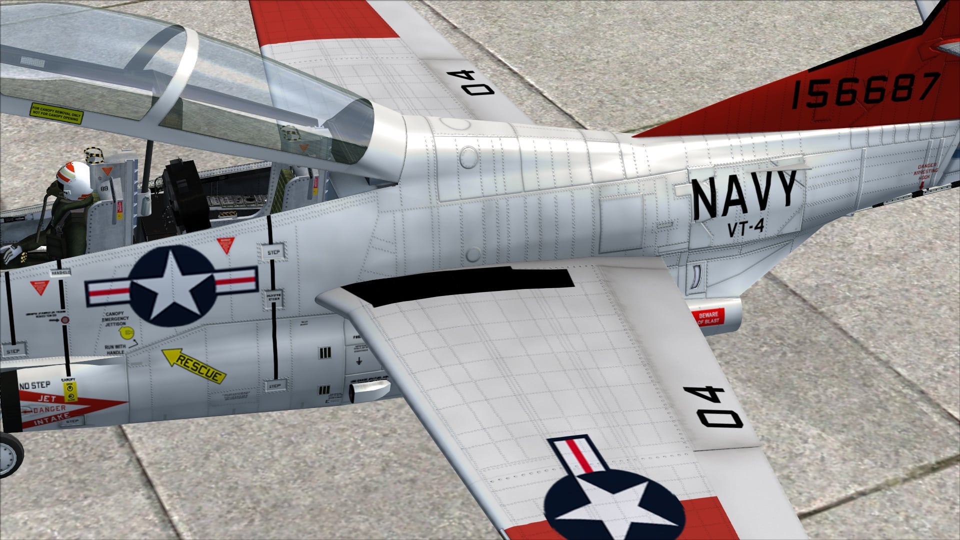 In terms of animations, the exterior model has exactly what you’d expect; the control surfaces, flaps, gear, tailhook and spoilers all move smoothly and look “connected” to the aircraft. One nice little detail is the landing light that drops down out of the nose when turned on and retracts when turned off. The turbine blades, situated deep within the aircraft, are also visible and animated. The pilot figure is animated as well.
