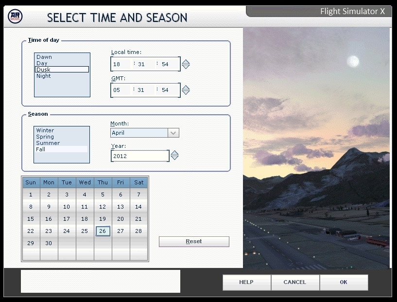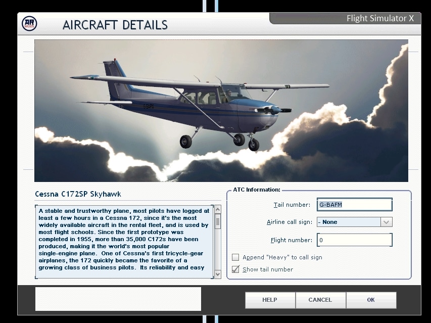 Design changes. The Creator has modified the FSX Menu layouts to reflect a more subdued overall theme – pushing back from the 3D look of the menu choices and offering a cleaner more 2D approach using a flat pale blue color scheme. Some menu areas have been left alone, such as the Briefing and ATC windows, but the three buttons to the lower portion of the menu have been squared up and made bigger. These buttons remain the same through-out the mod. They are; HELP, CANCEL and OK. There is also an inclusion of a help box that interactively shows help sentences on your choices. For old timers these are merely stating the obvious, but they do help especially if you are about to change a configuration option and canot recall the effect.