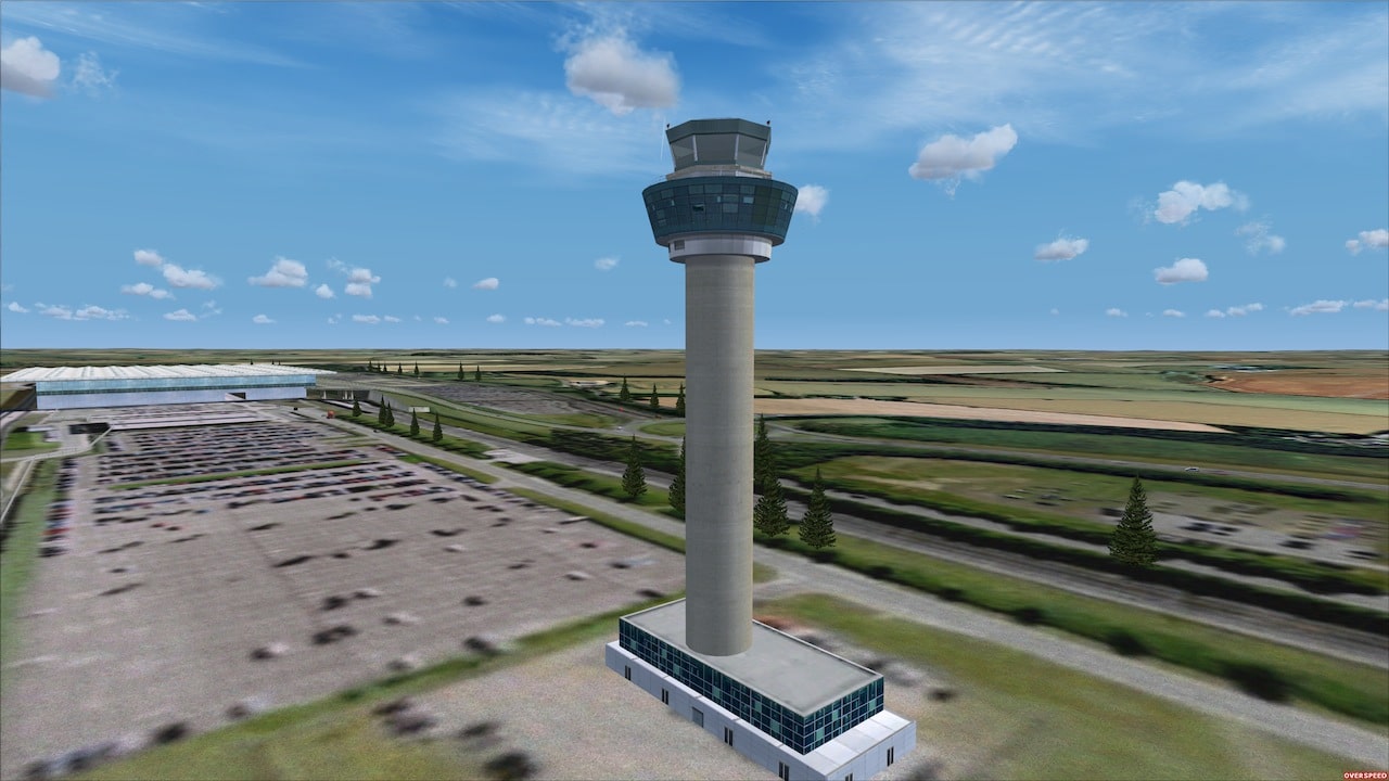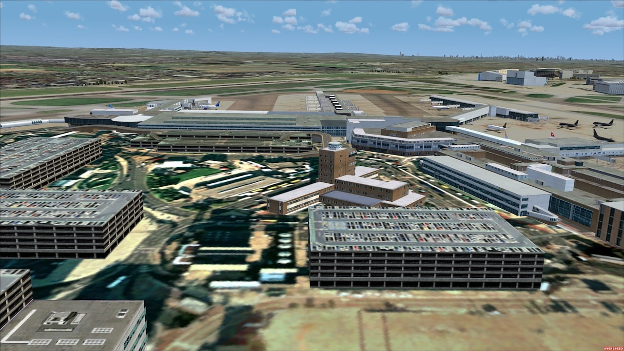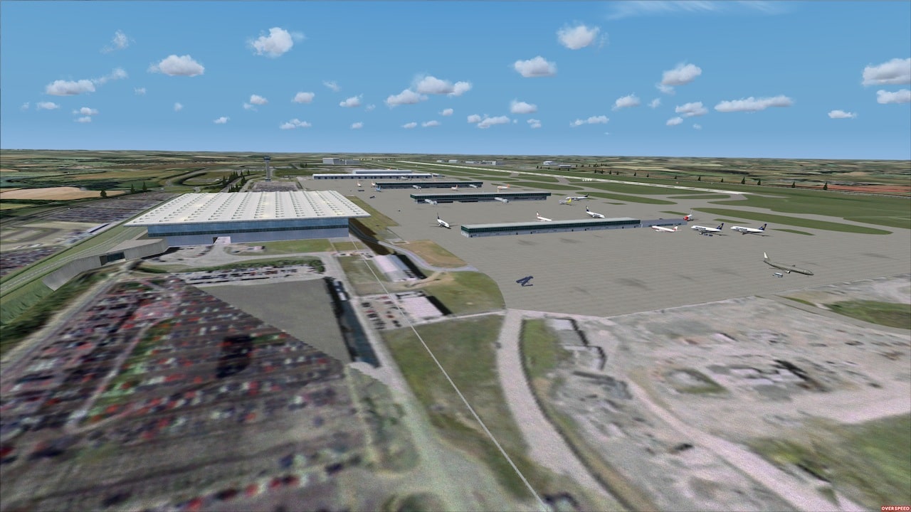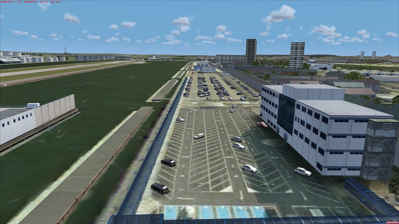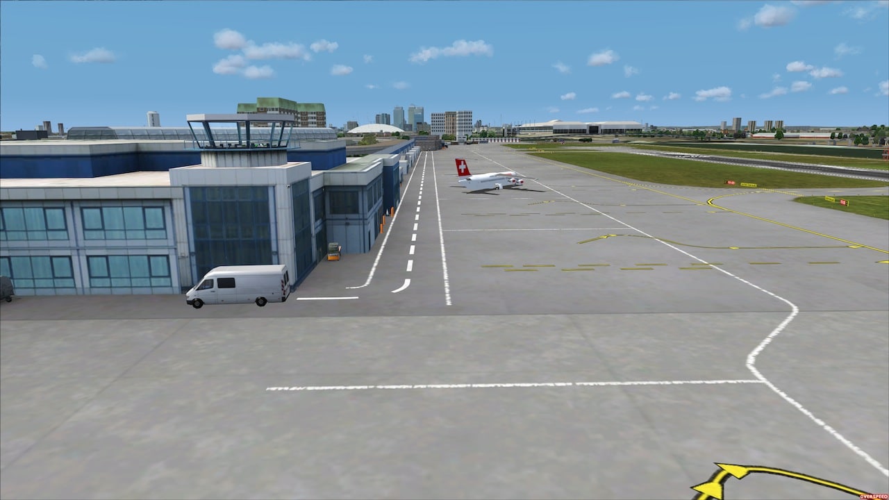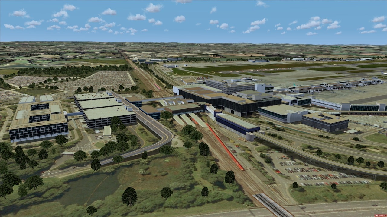 Outside of the airport we find the car park, amongst other things. Notice the nice modelling of buildings and cars. Especially the Plexiglas walkway looks really nice, but a bit of a let-down are the piers, which aren’t well aligned with the photoscenery under it.