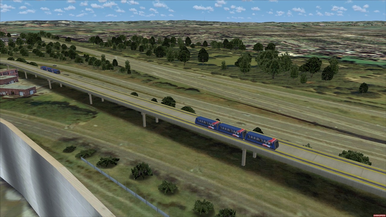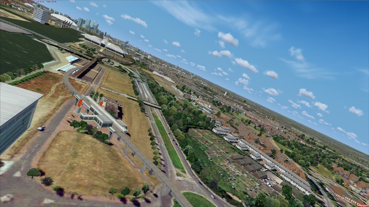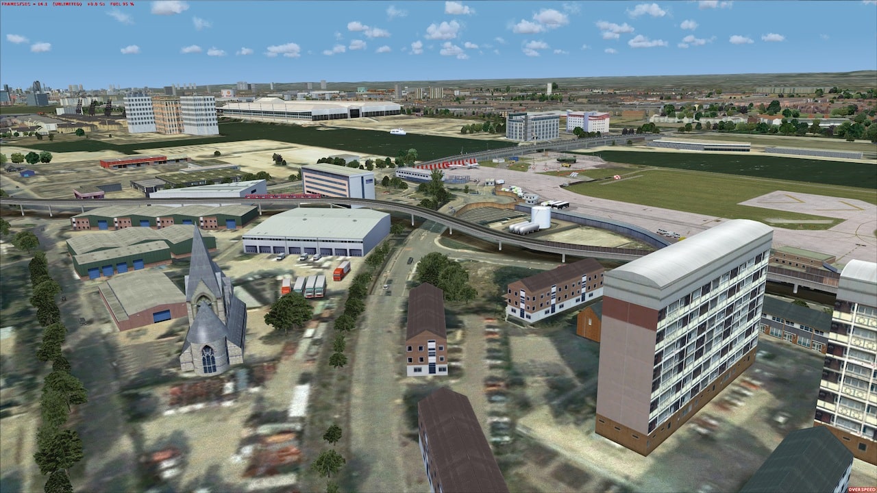 Close to the training area, we find a church and some residential buildings, amongst more industrial buildings and offices. Overall, both modelling and texturing is fine, even if it’s less good than what we saw at the airport. Then again, I personally think that surrounding scenery needn’t be as good as the airport scenery because it will not be as close to the user. As such, small details are easily lost and are better kept out of the scenery to conserve FPS. In that train of thought, it’s easy to comprehend why a layer of much more detailed ground scenery start round about those elevated tracks you can spot over the road. By the way, there’s a moving train that runs over it!