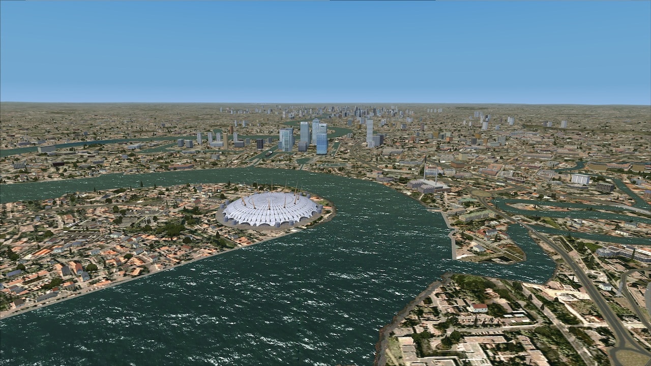 There are various comments to be made. First of all, that all default buildings have gone, including all the landmarks. This is a great pity, although we will add Aerosoft’s VFR London X in the end, which will take care of this problem. Secondly, the colours look okay. The slightly brownish look goes okay with downtown London, although I had hoped it wouldn’t be too pronounced. It doesn’t seem like a natural colour to me for a city, that being greyer, with more vibrant colours. The sport field you see for example in the upper middle shots looks a bit yellowish instead of normal green.