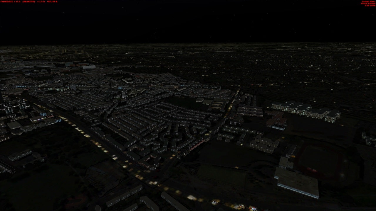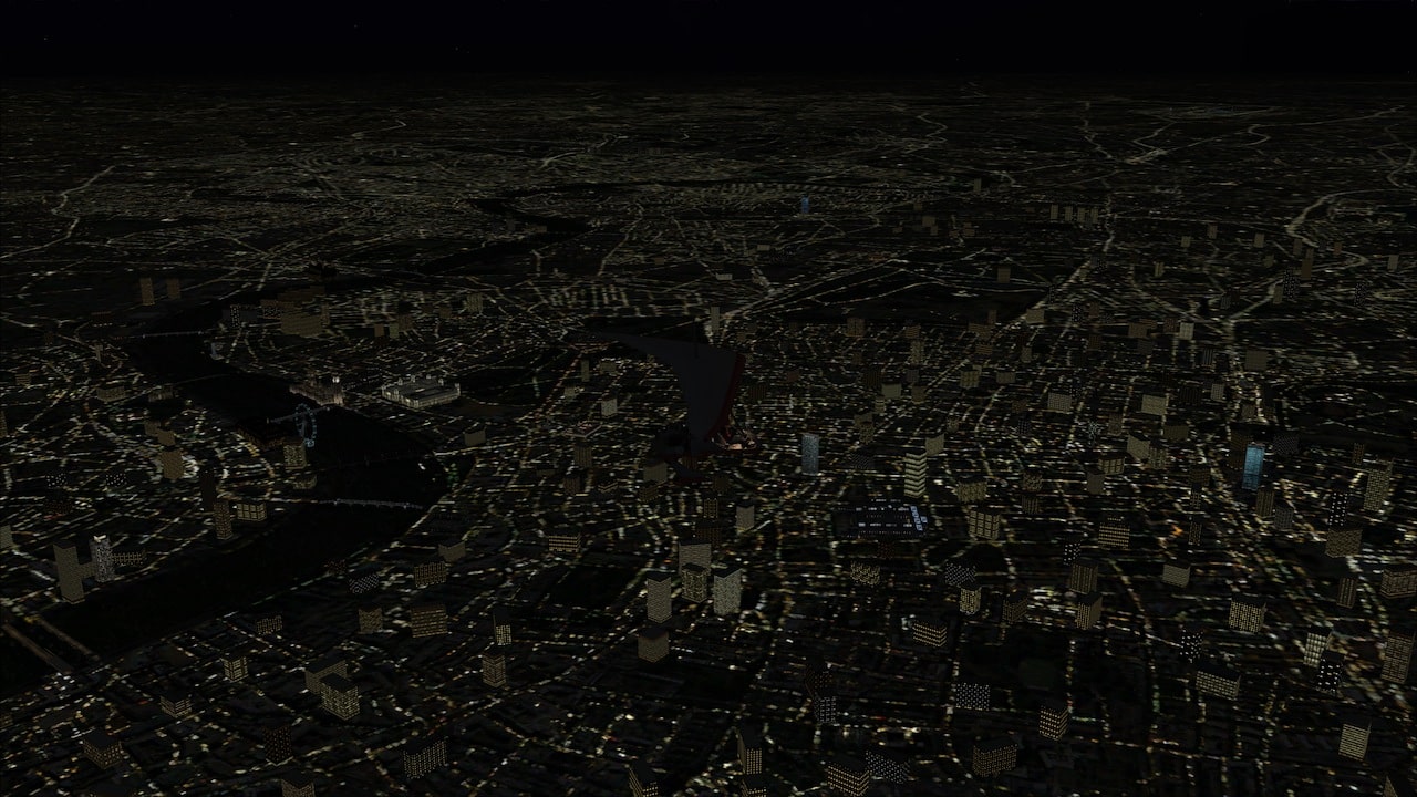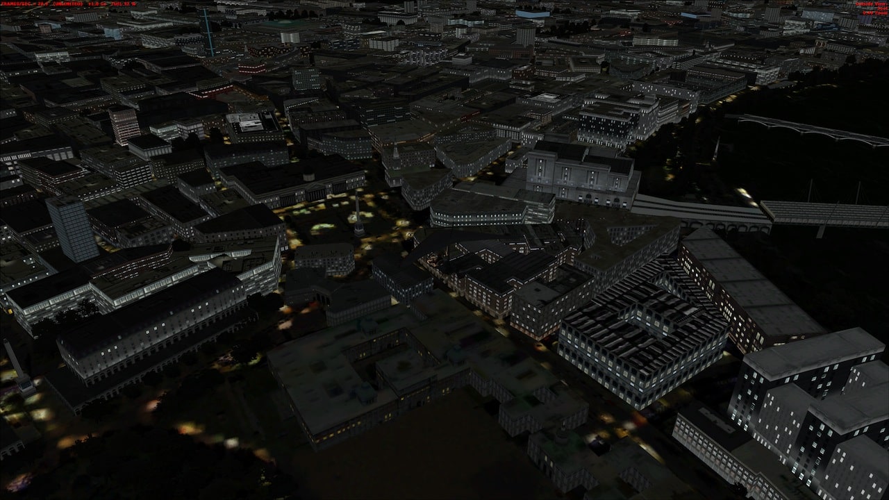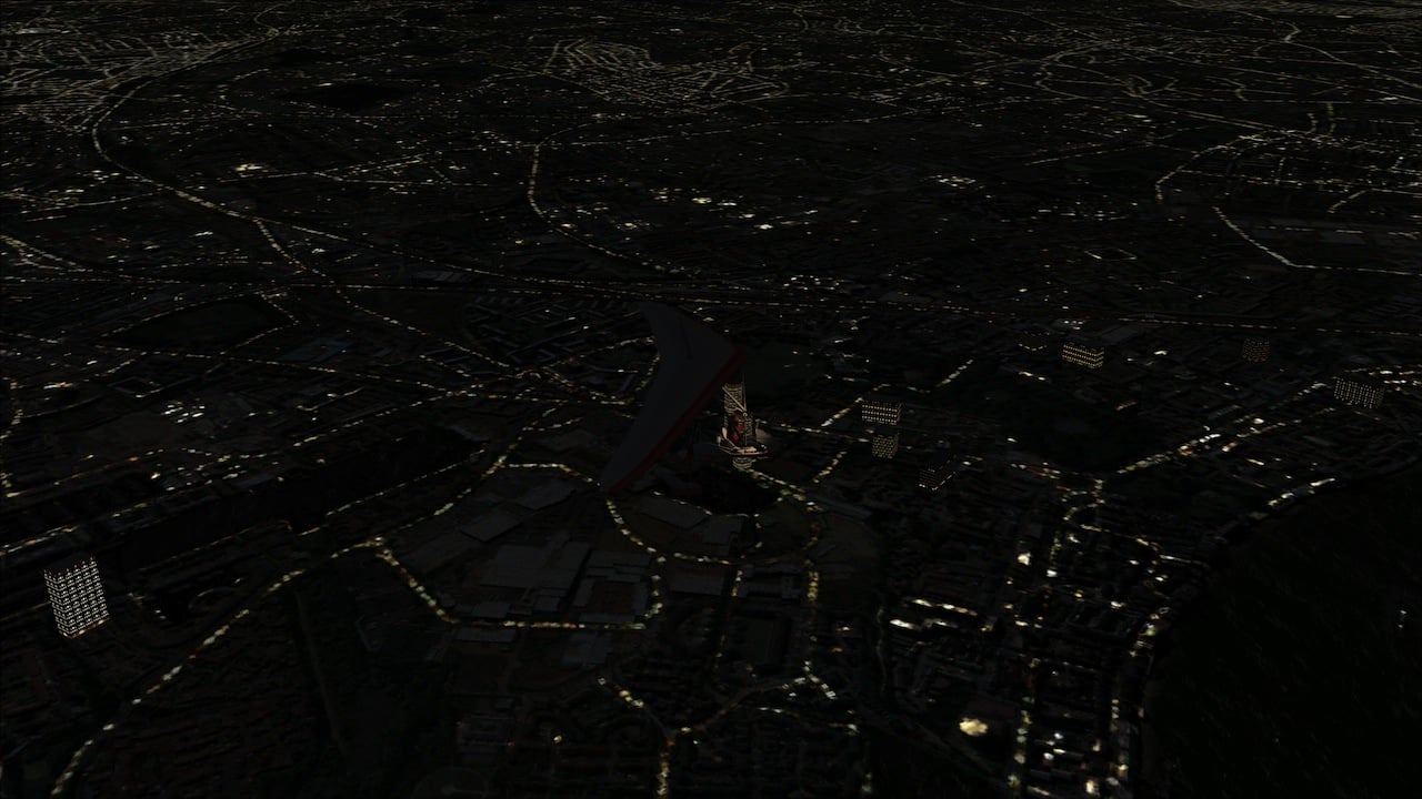 Concluding, what to say about this scenery… There are some very good things about it, such as the resolution and image quality. At all times, it’s clear what you are looking at, and small details, such as cars, are easily distinguished from the surroundings imagery. The lack of completely ground-occluding clouds is also a big plus, but on the other hand, the patchwork of colours and mesh-related problems detract. Also the night scenery, while good in itself, features rather sparse lights.