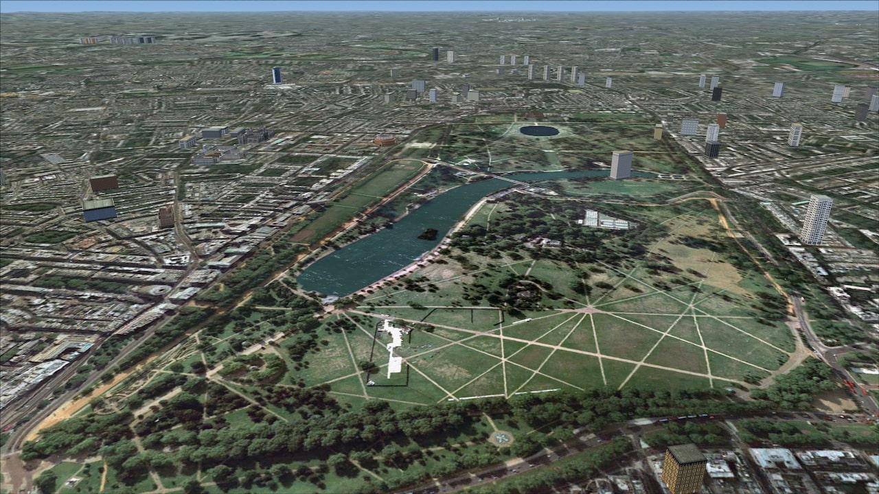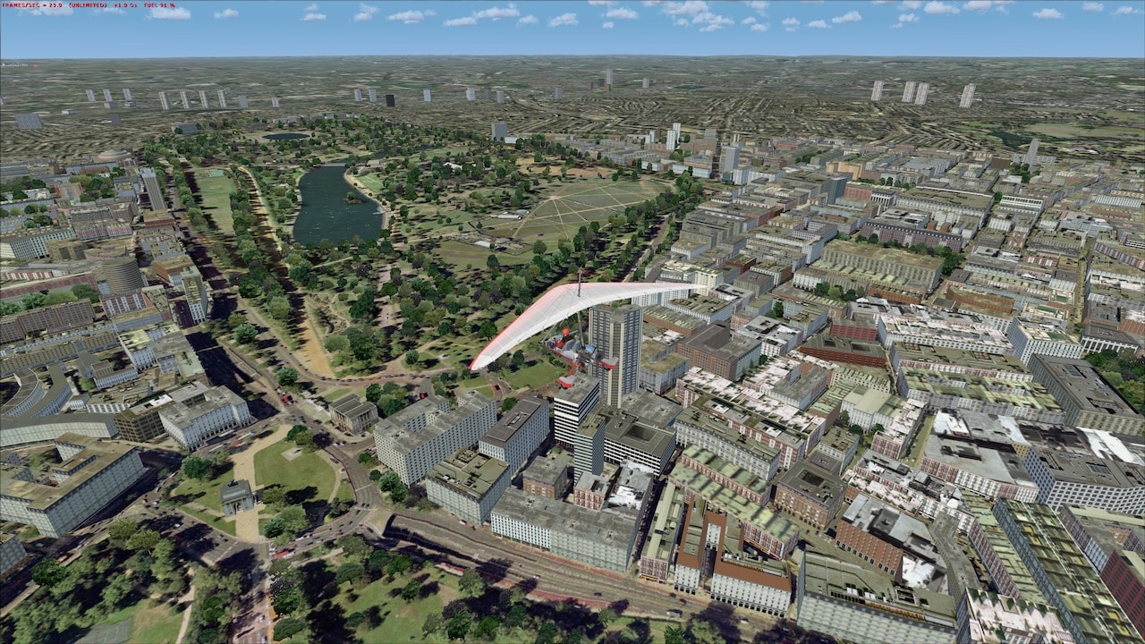 We continue our flight to Heathrow airport, and soon fly over Hyde park. While in general the surroundings of Hyde Park and most of Hyde Park looks really nice, some spots of Hyde park itself look a little strange and I’m not too sure what causes it. There are some white/green spots and some very dark trees, especially around the round pond you see at the west end of Hyde park. Overall though, another nice shot of Horizon’s scenery.