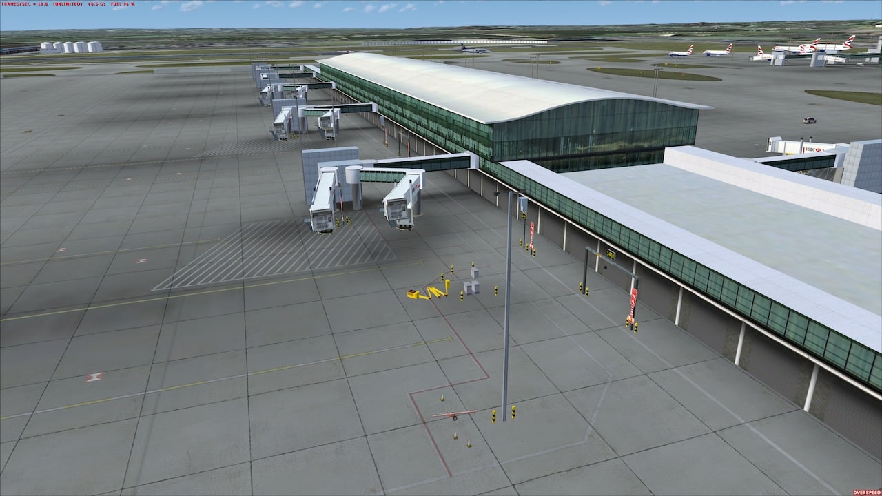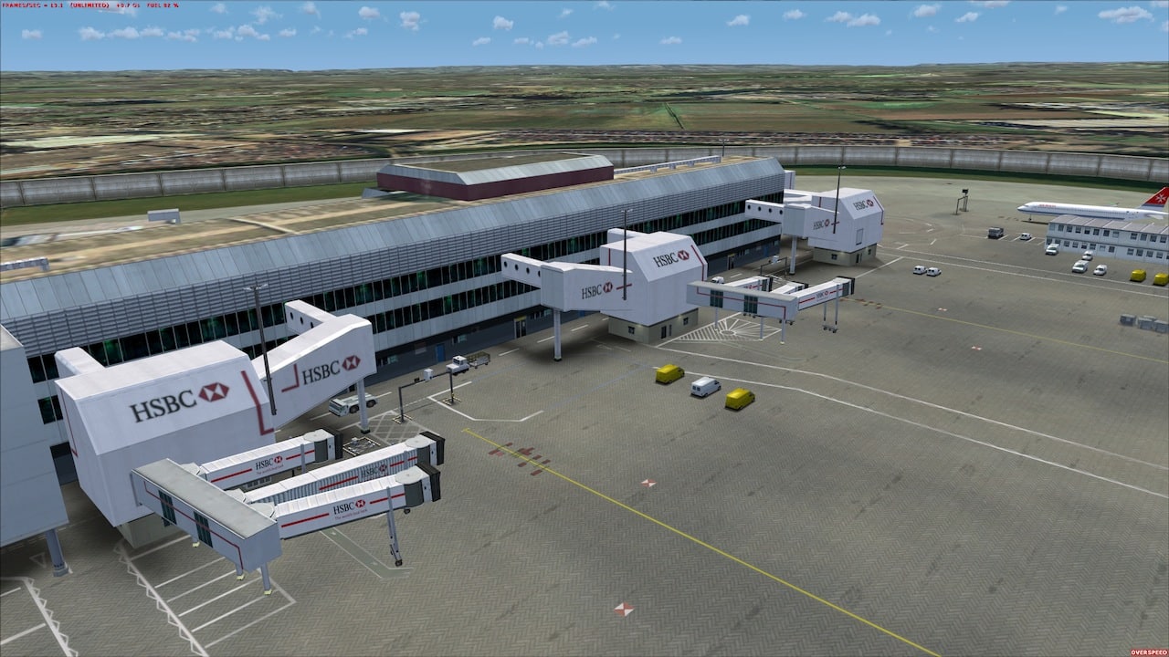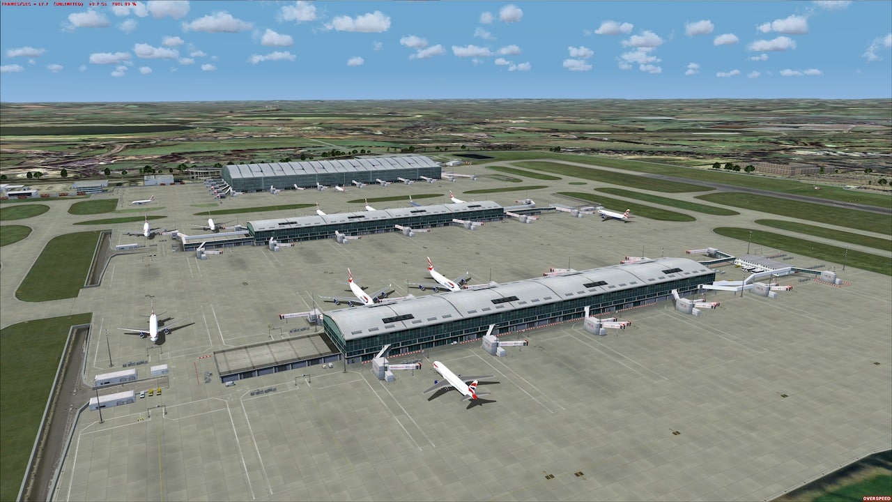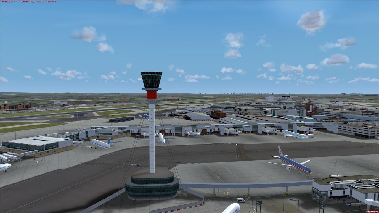 London Gatwick has two renditions in FS. One is UK2000 VFR Airfields, the other is UK2000 Gatwick Extreme. VFR Airfields is rather simplistic and, to be honest, seems to me like a dumbed down version of the Extreme Gatwick rendition. The latter looks like the former, but simply ahs much more detail, although of course the performance is, as such worse. It’s not that bad however, which is consequently one of UK2000’s selling points: FPS tend to be rather good at UK2000’s sceneries. As such it is not very hard to decide what airport to use for Ultimate London: UK2000’s Gatwick Extreme will be used for Ultimate London.