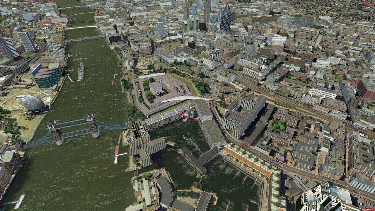 First London itself. As you can see, a wide number of buildings are present, some even sport photoreal textures and look quite all right. The vast majority, however, is default and doesn’t look too great to be honest. The most basic landmarks, such as the Buig Ben and tower bridge are of course present, and look better than the average skyscraper.
