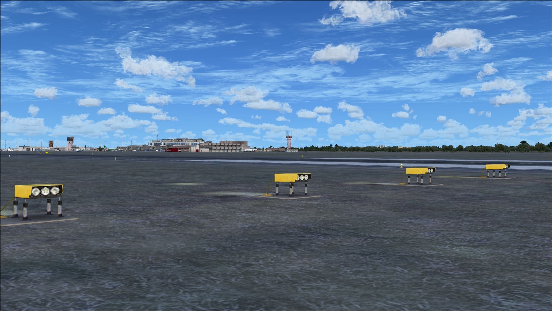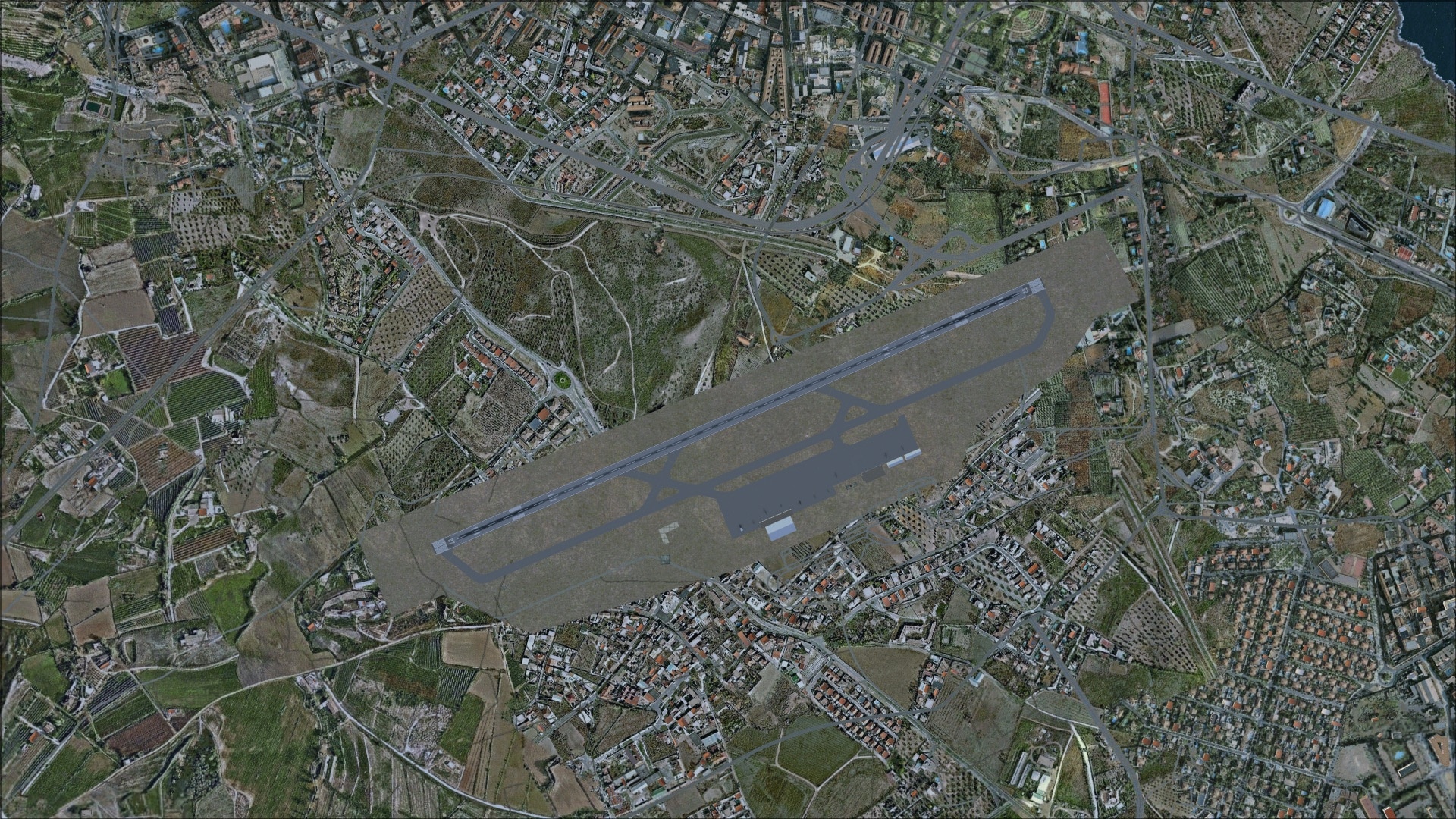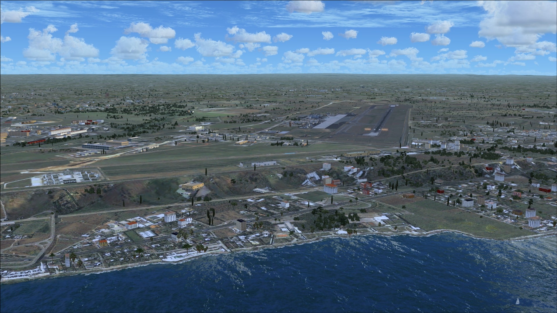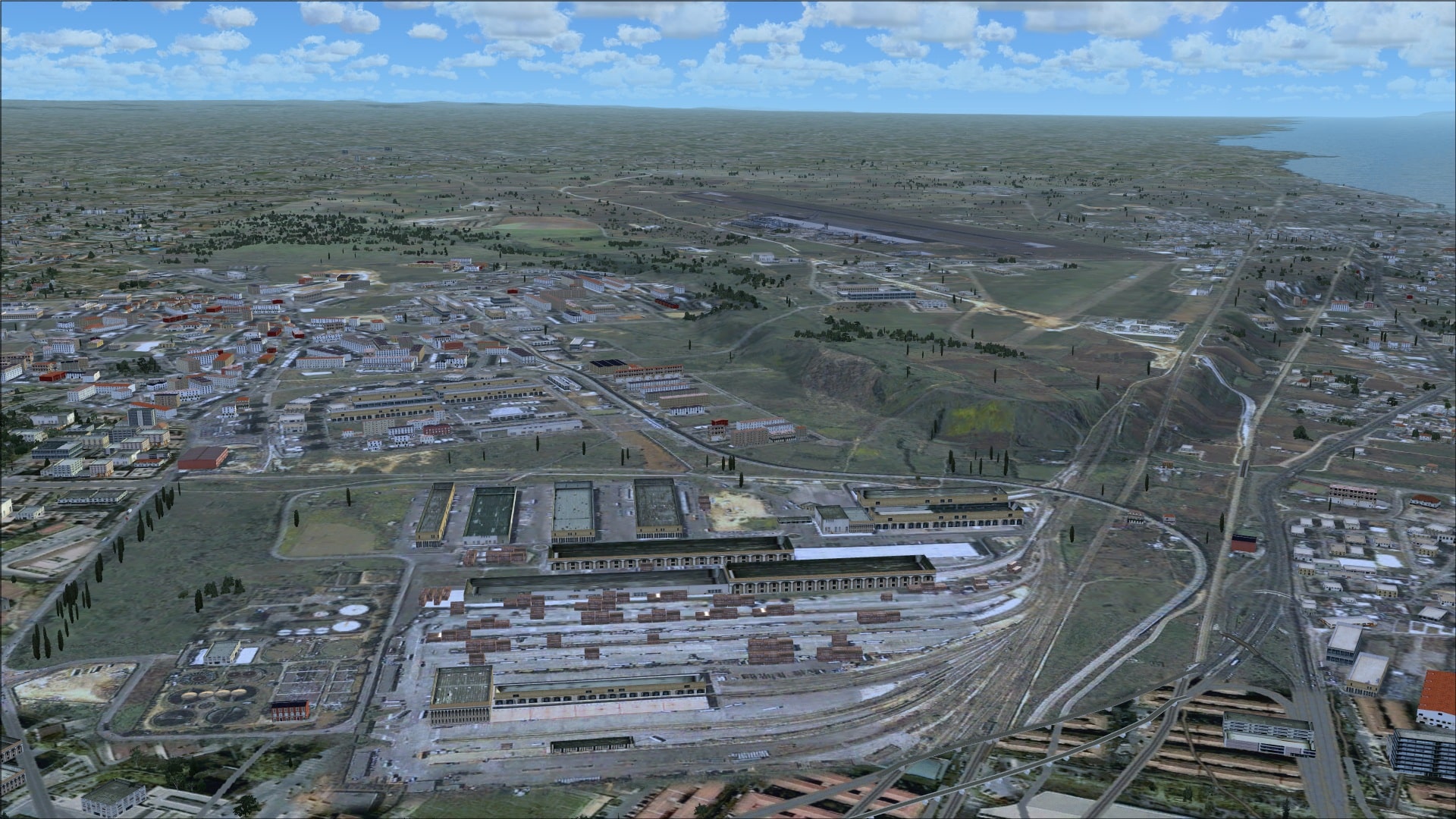 From overhead the scenery coverage area is clearly discernible. You can easily make out the old runway, the nearby railway yard, the small towns that border the airport and the accurate coastline.