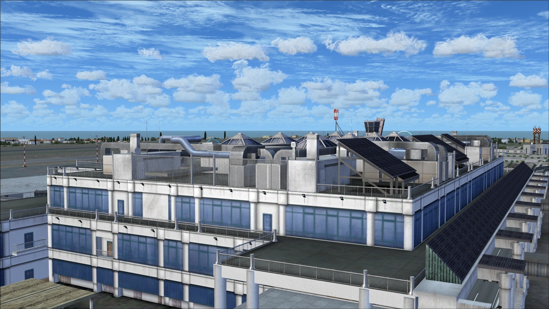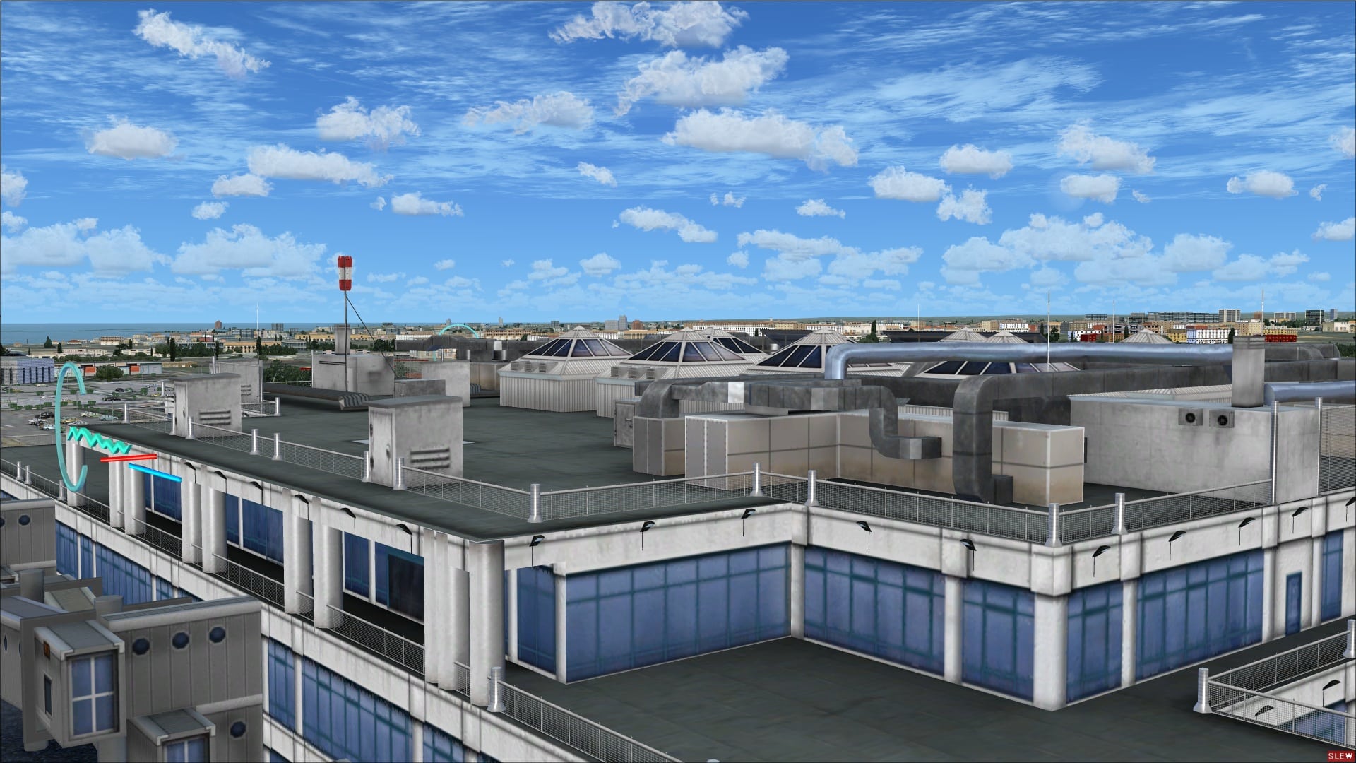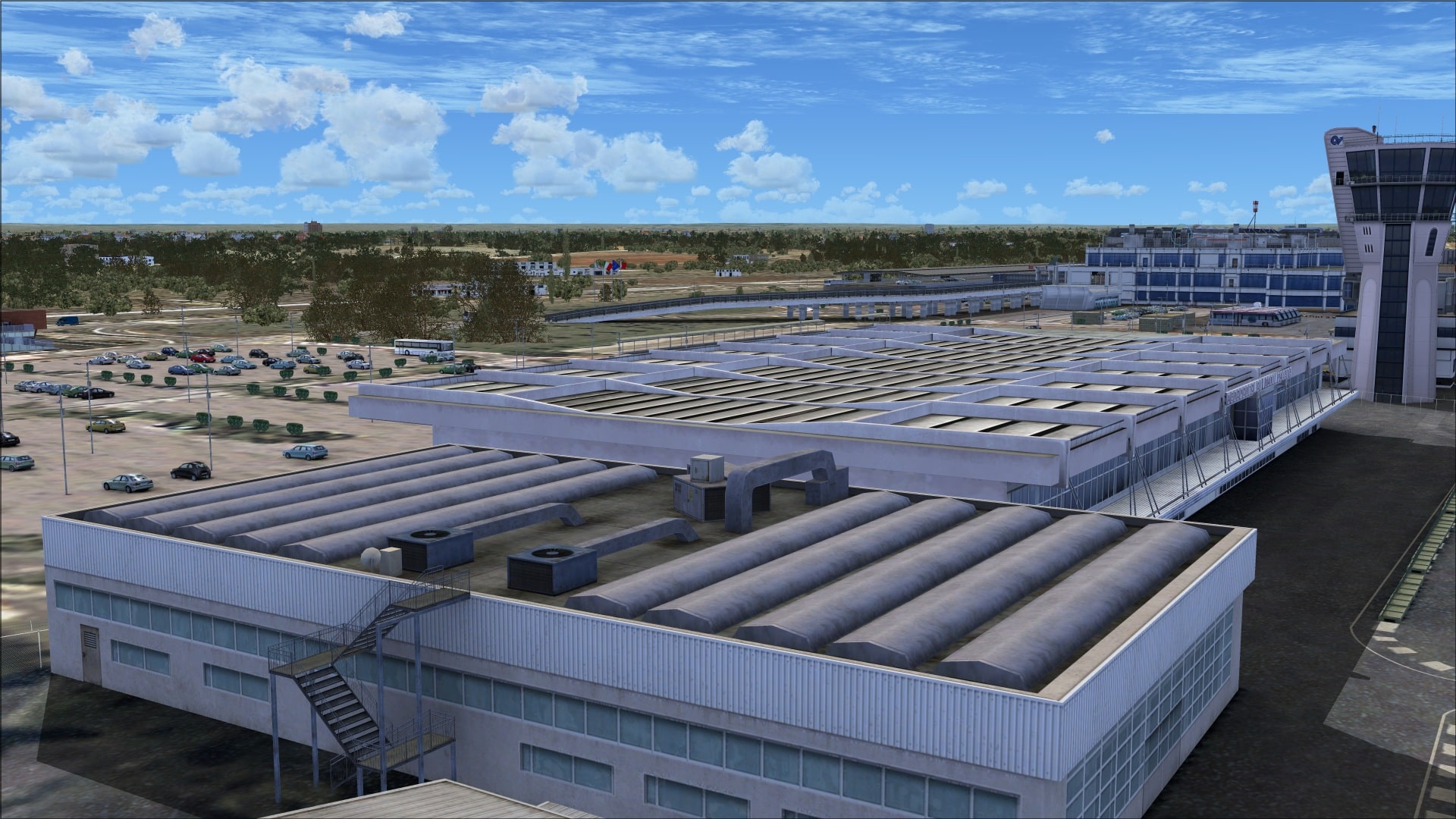 Although the added details were interesting and enhanced the realism of the structures it was what they did with the terminal’s rooftop that really got my attention. Rooftops are often taken for granted by scenery developers but with this scenery addon it is one of the highlights and the quality of their work in this regard far surpasses what I have seen in so many other airports. So why am I singling out this rooftop? There are several things that catch your eye; there is an extensive and complex network of ducting that interconnects the roof mounted HVAC units, next along the south edge is a row of solar panels and finally covering a large portion of the middle area are eight skylights. I have seen rooftops that include some level of detailing but not to this degree. This will definitely get your attention as you fly overhead.