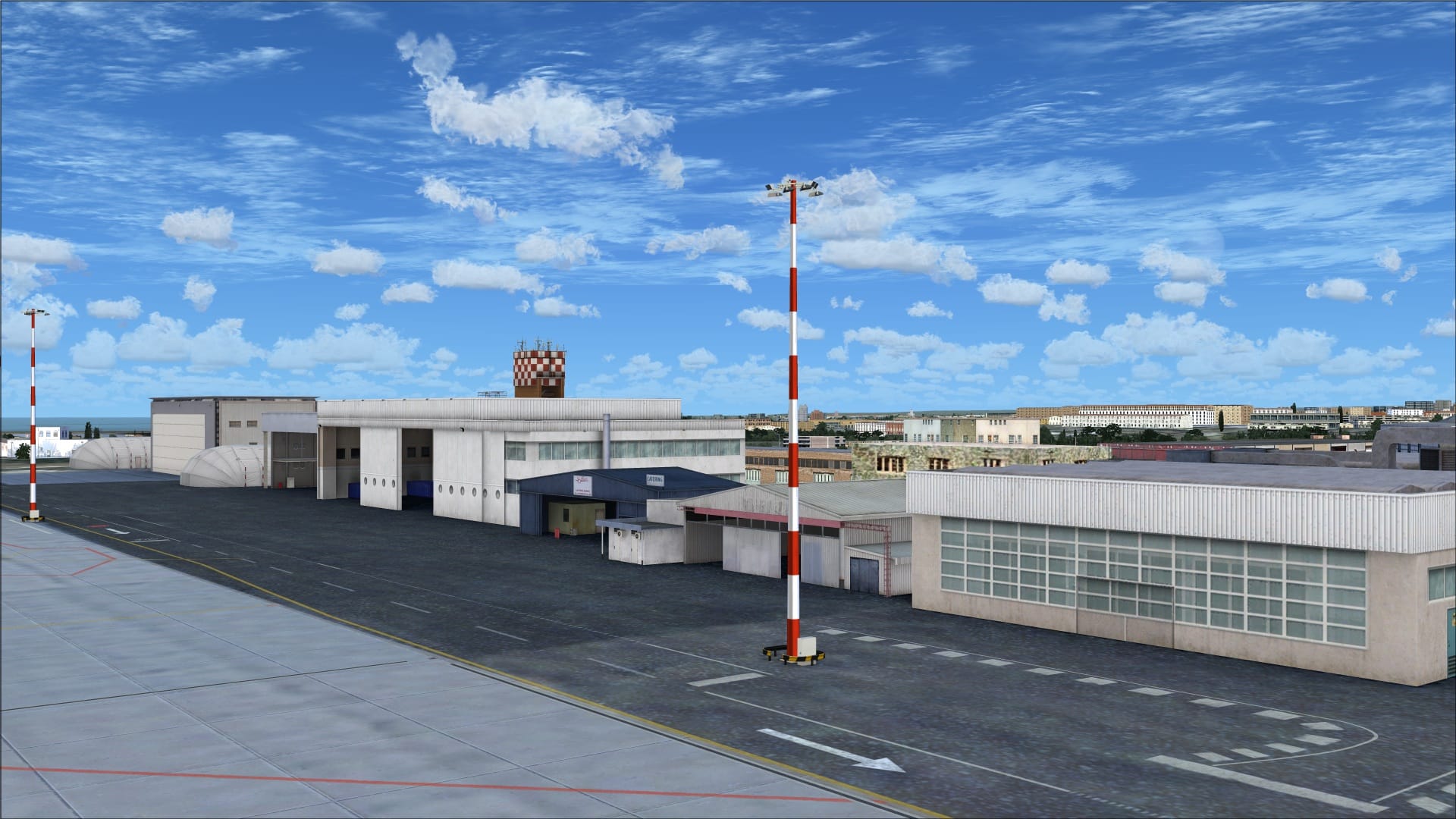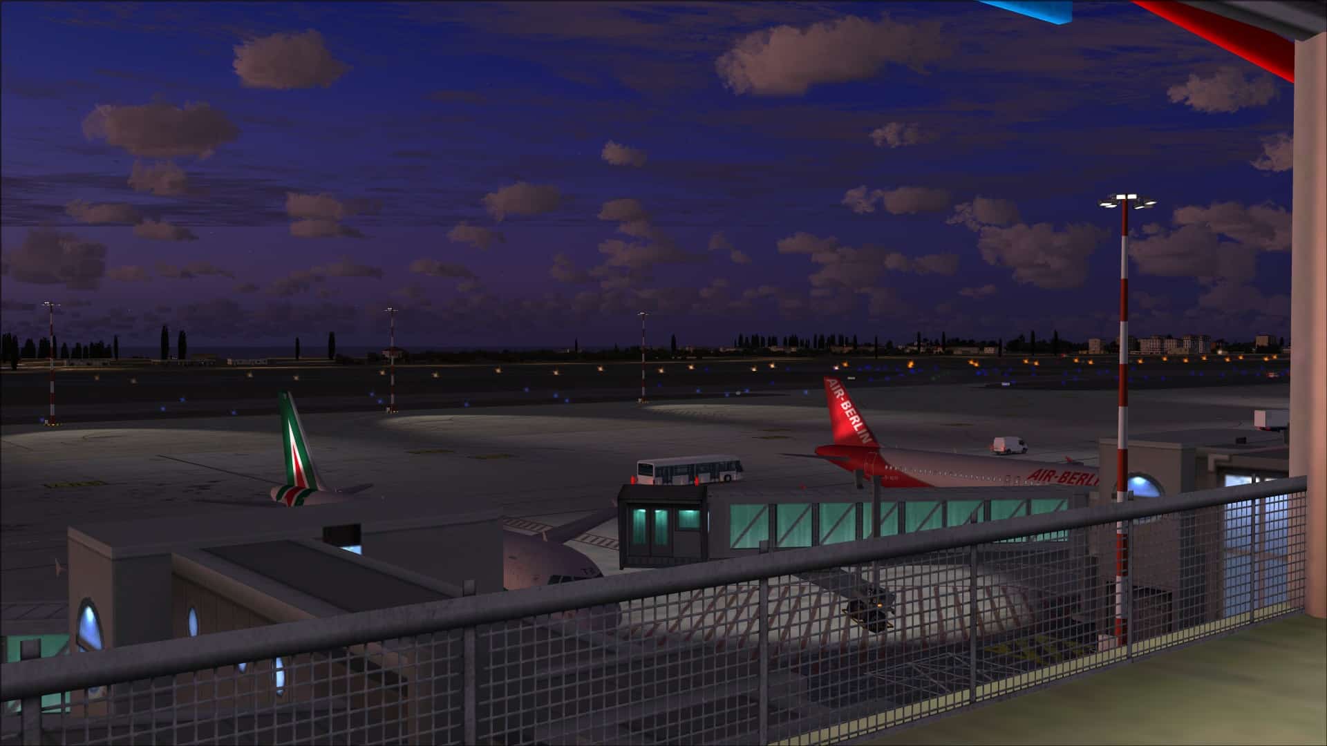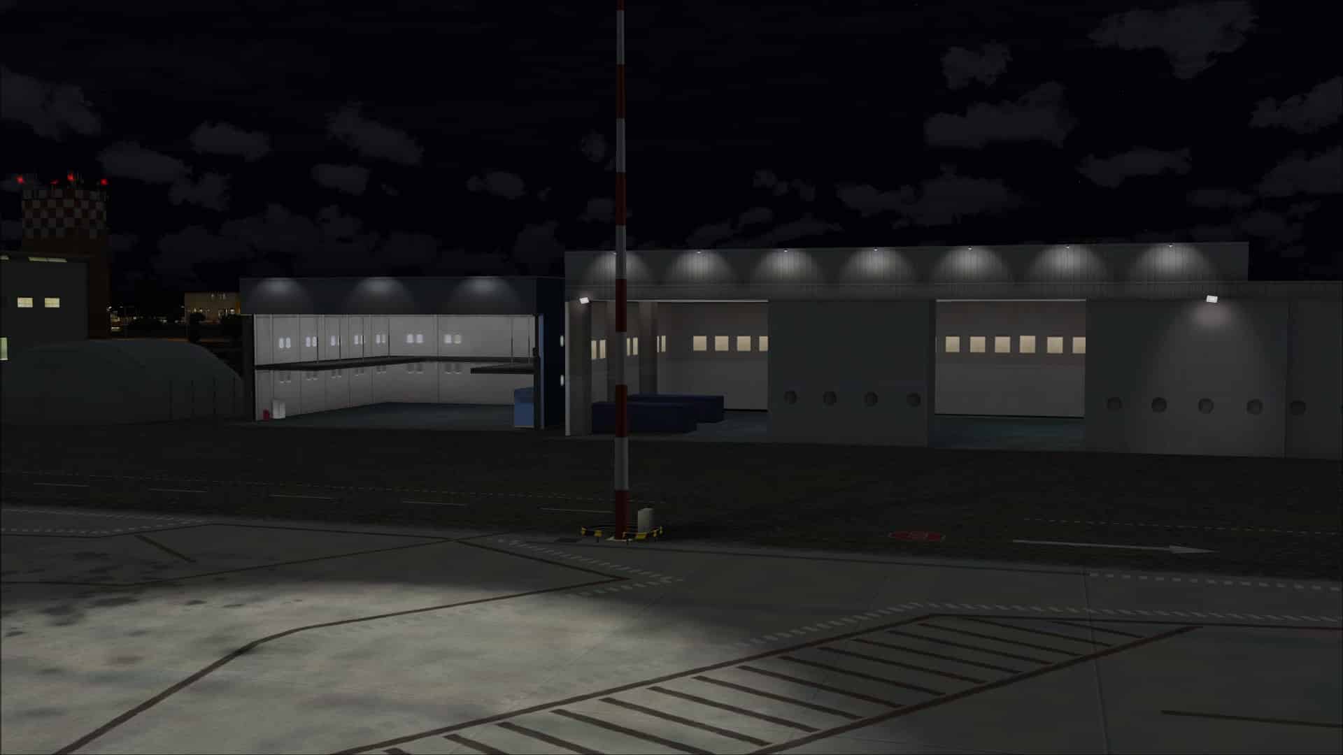 Lighting which is the big visual factor at night was very well done giving the airport a realistic look. Lighting levels were good with building interiors lit up as if there might be activities going on inside. For areas with large windowed walls such as the passenger terminal they used high resolution images so up close it was like you were seeing inside. At the airport there are several hangars with their doors open, what they’ve done here is to have the interiors lit up so you can use them at night should you choose to. Ground lighting was also good being nice and bright. Having AESLite we see the road traffic moving around at night with headlights on and signals flashing. Overall, night flying at Bari was fun and immersive.