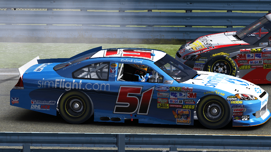 The DOM-GNL (German NASCAR League) simracing championship is still in swing, with Robert Graf‘s simFlight liveried car still in the thick of it – as is usually the case with oval racing, sometimes more in the middle of the thick of it than others!