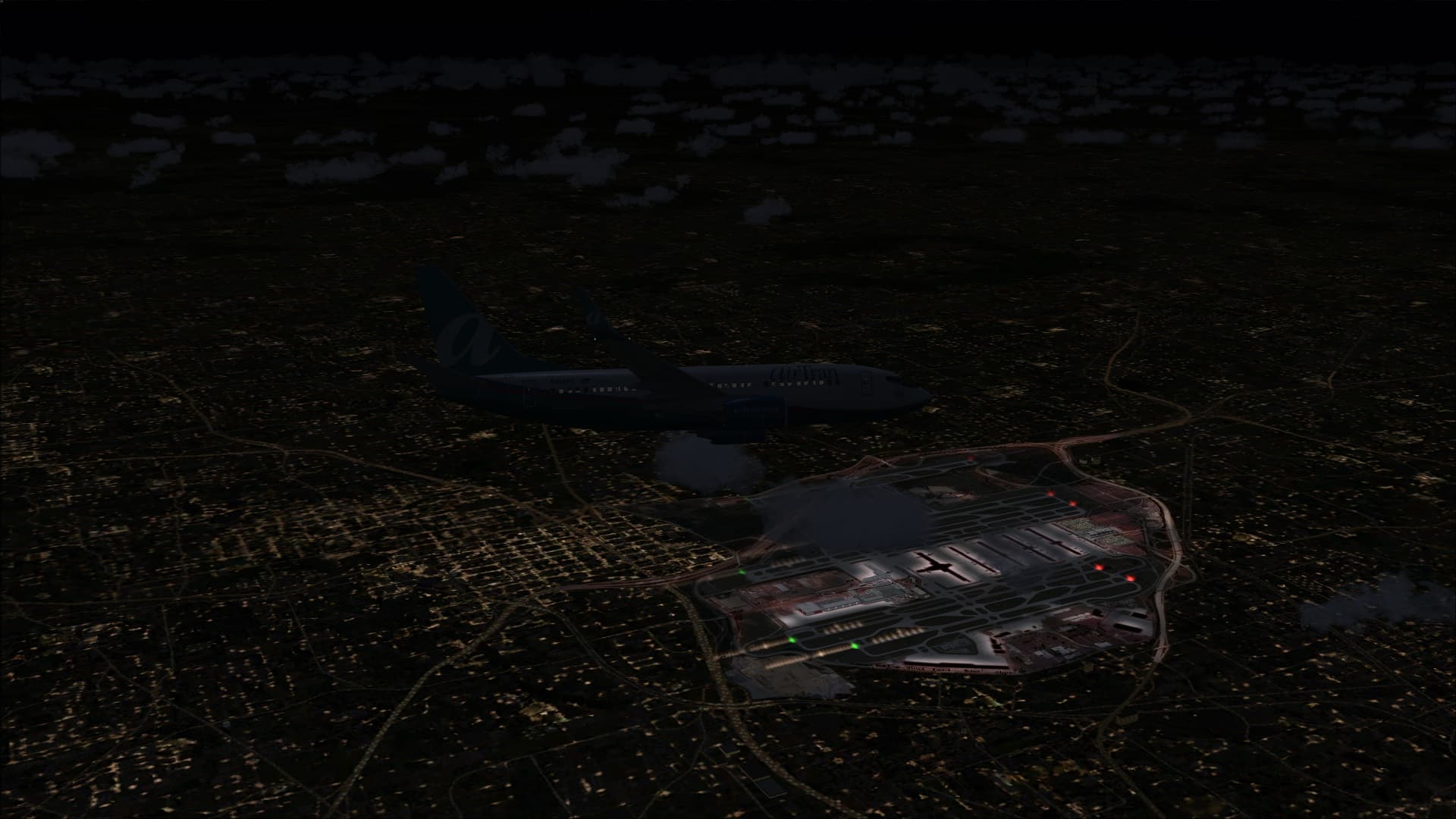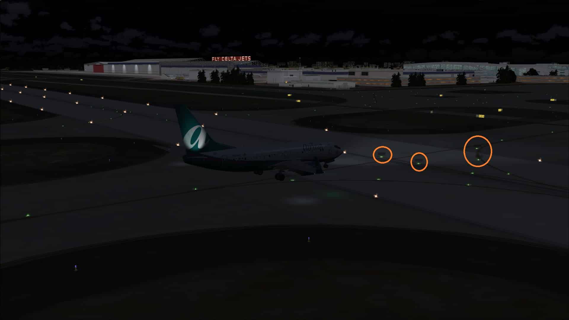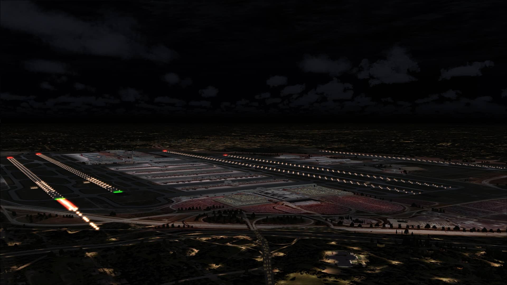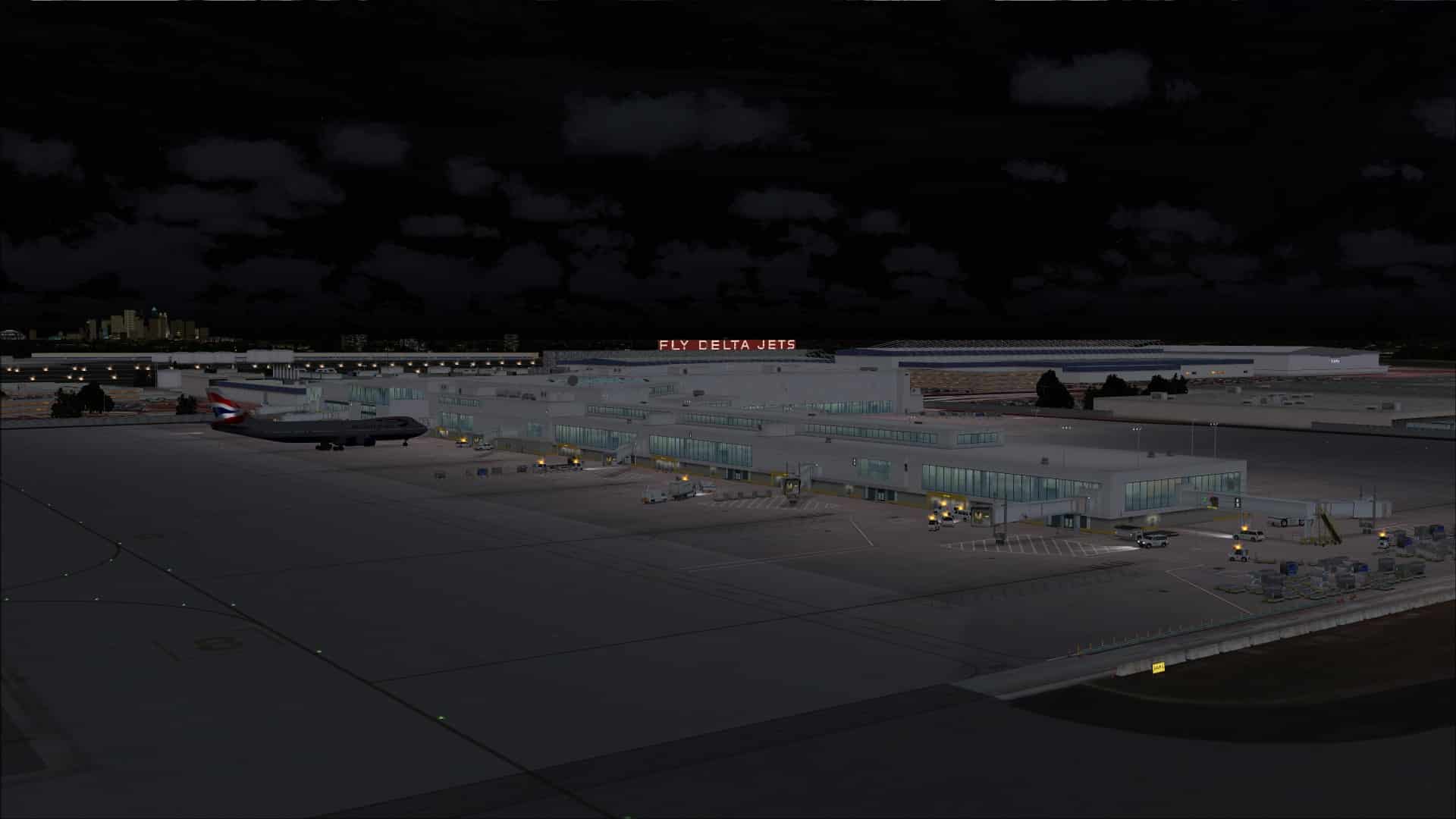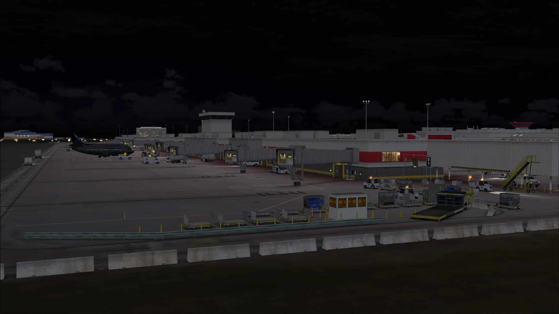 Apron lighting was such that when viewed while flying overhead the look was good and you could see variations in intensity at different parts of the airport. The problem happened when I was on the ground and parked at a gate or on an apron. The effect that you had was that the ground textures were the source of the light and it didn’t seem to be coming from overhead lighting fixtures. There was little in the way of contrast between dark or light.