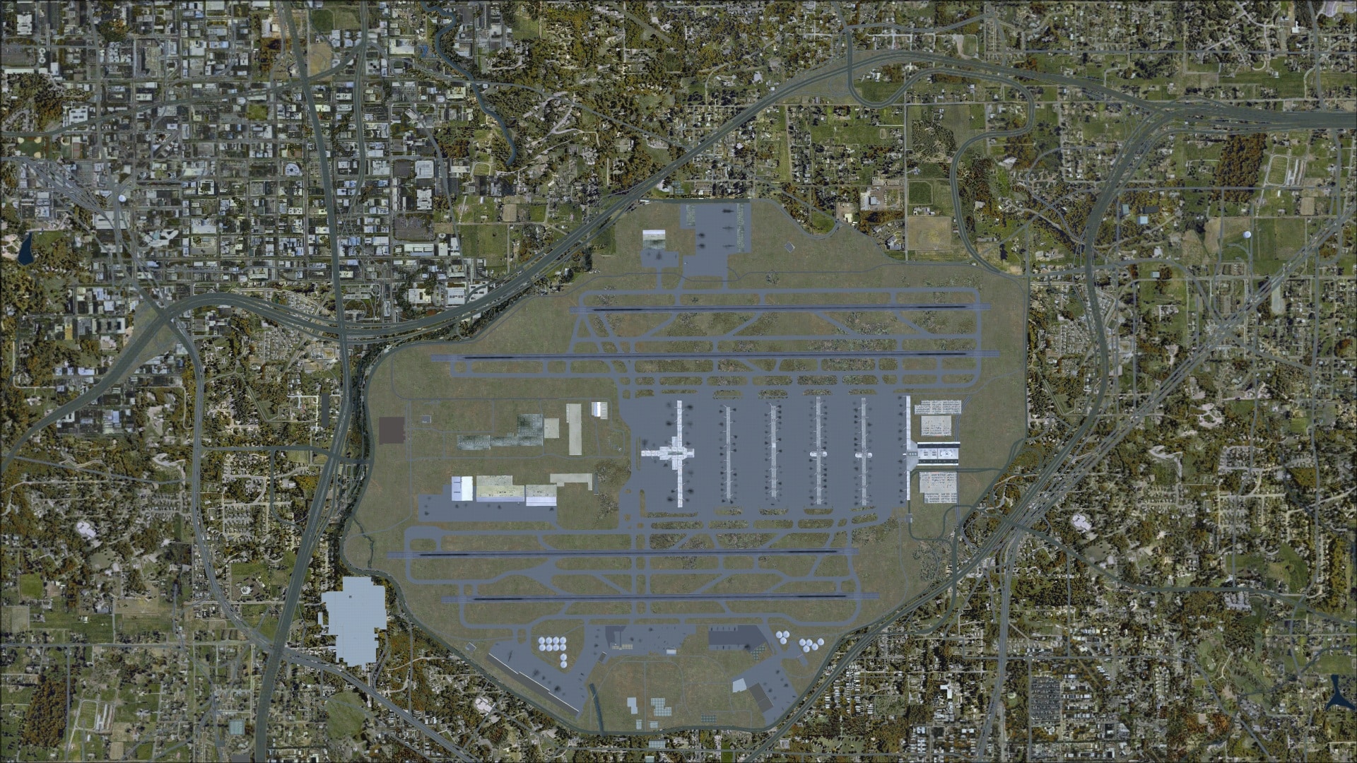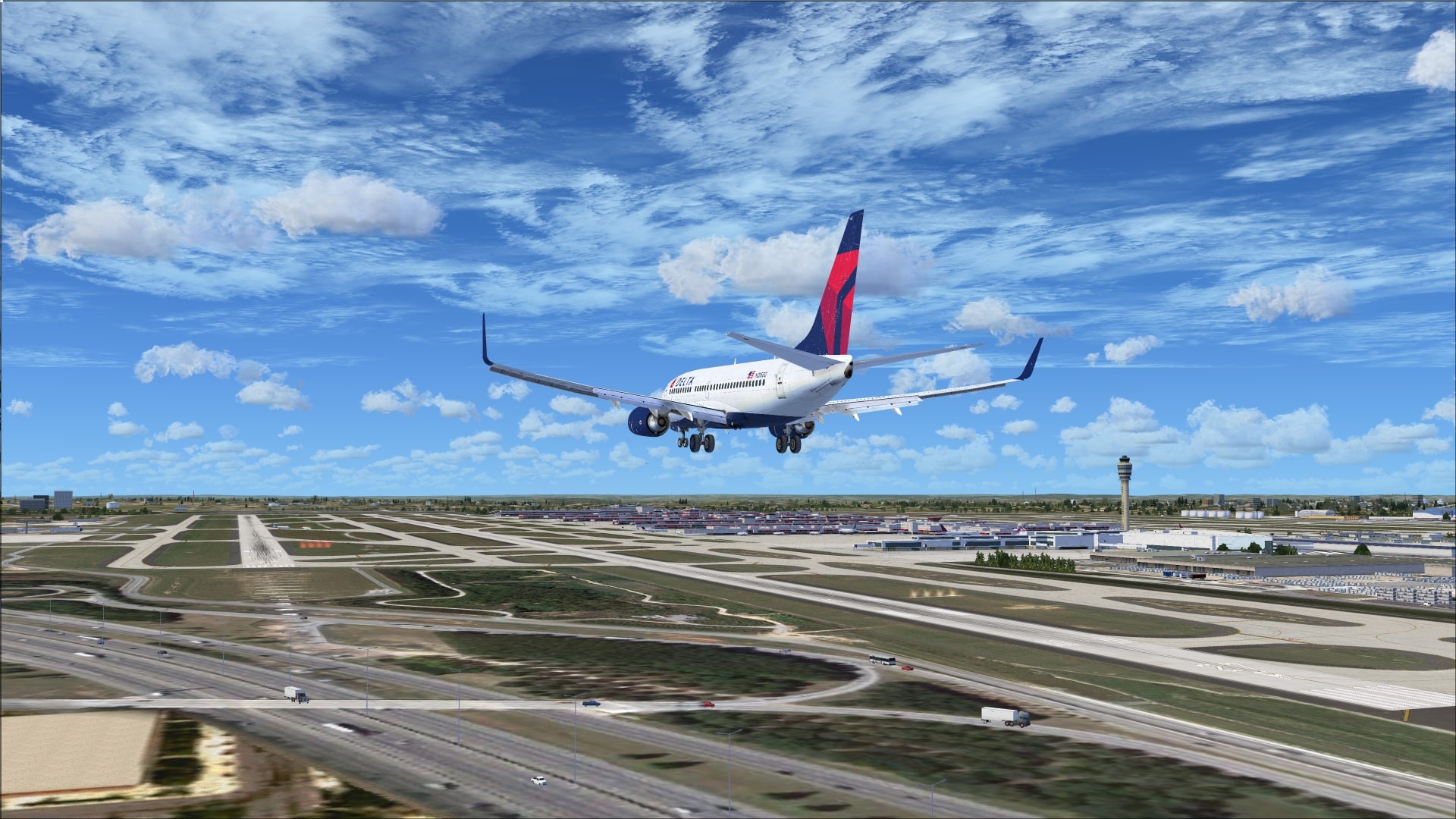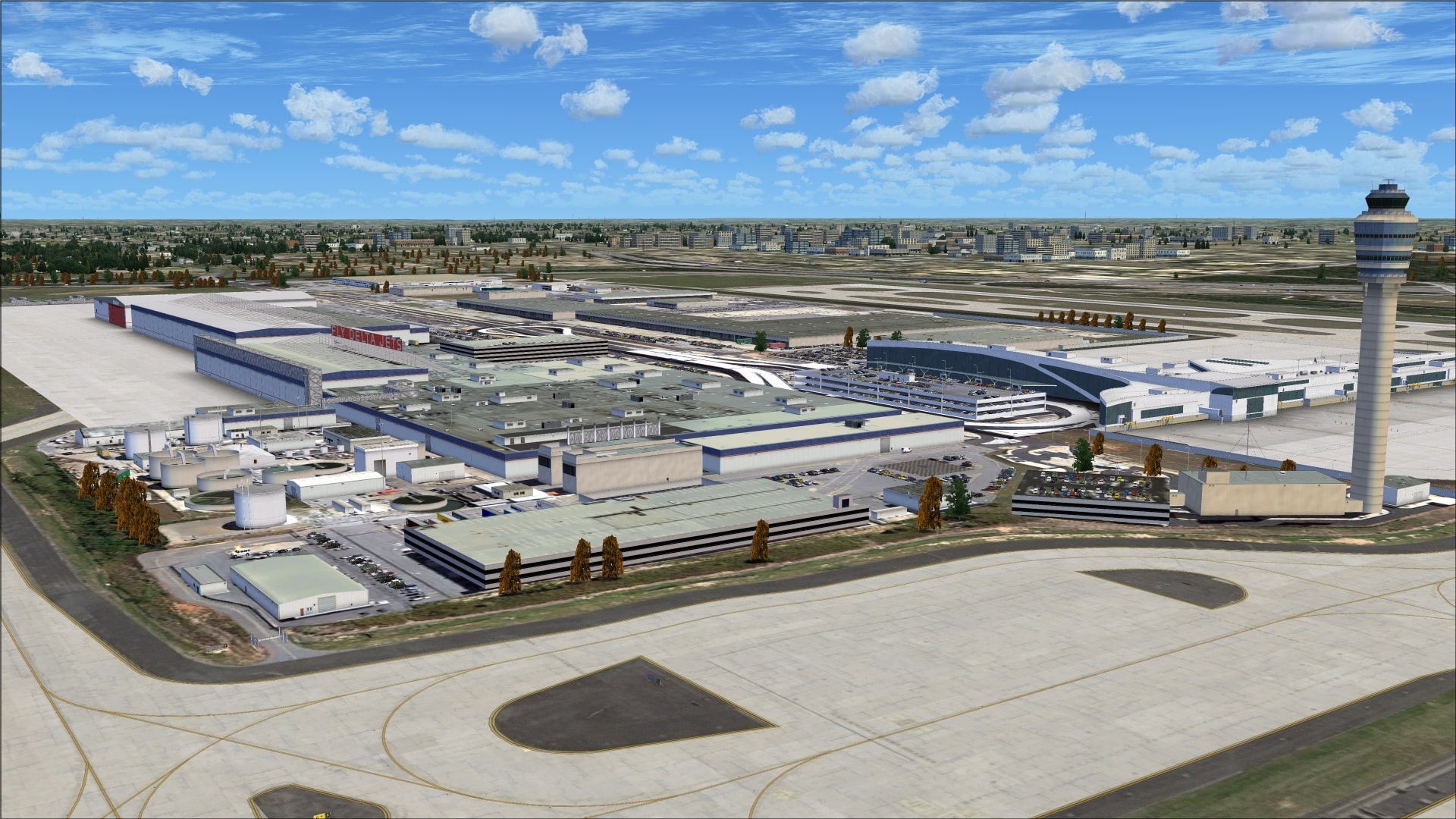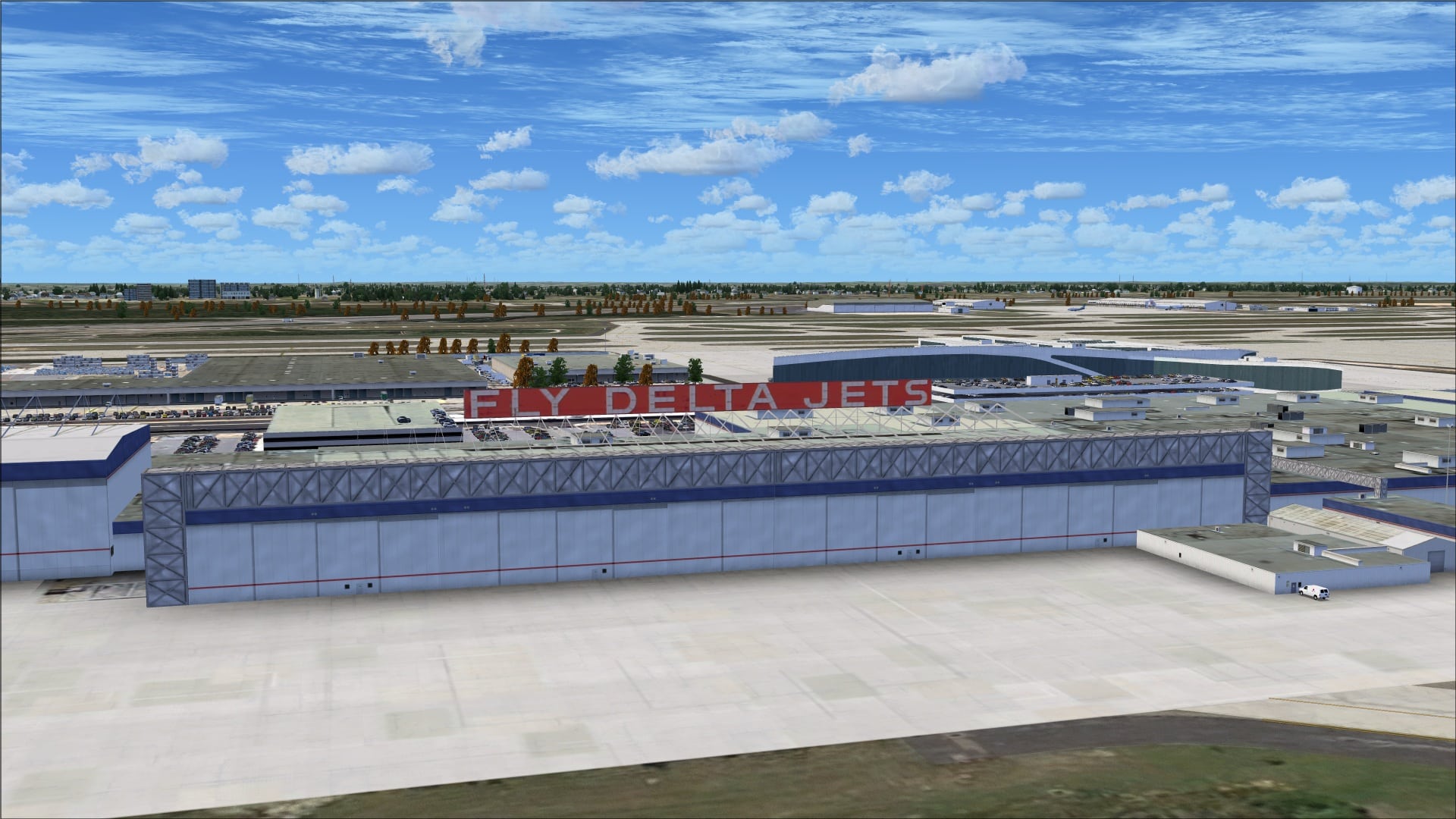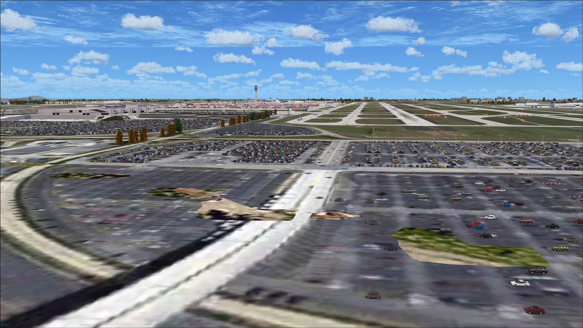 Photo textures were used as the base for this scenery. In areas where the ground cover is mostly grass everything looks fine it is where we see roadways and parking lots that the problem of blurry ground textures becomes apparent. Flying in and out of Atlanta I was not really aware of the problem as I was focused on the runways. It’s when I took the time to explore the scenery much more closely did this come to light. With all of the parking lots and roadways that surround the airport the scenery would have definitely benefitted from higher resolution photo ground textures.