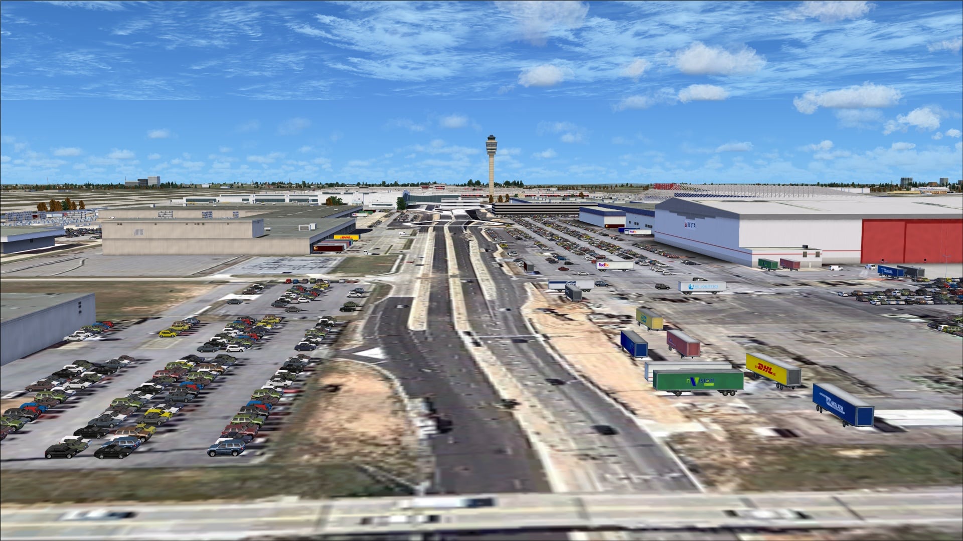 Besides what I have just described there is so much more to see everywhere else in this very large airport. All of the major buildings and important areas include ancillary objects that match their purpose. As an example, the Delta North apron near the AirTran and City hangars that I am showing in the following screenshot has a whole host of different objects and vehicles including freight containers that range from small baggage trailers to large sea containers. The name of the game is realism and I think that in this respect they did a very good job. This same type of thing can be seen throughout the entire airport.