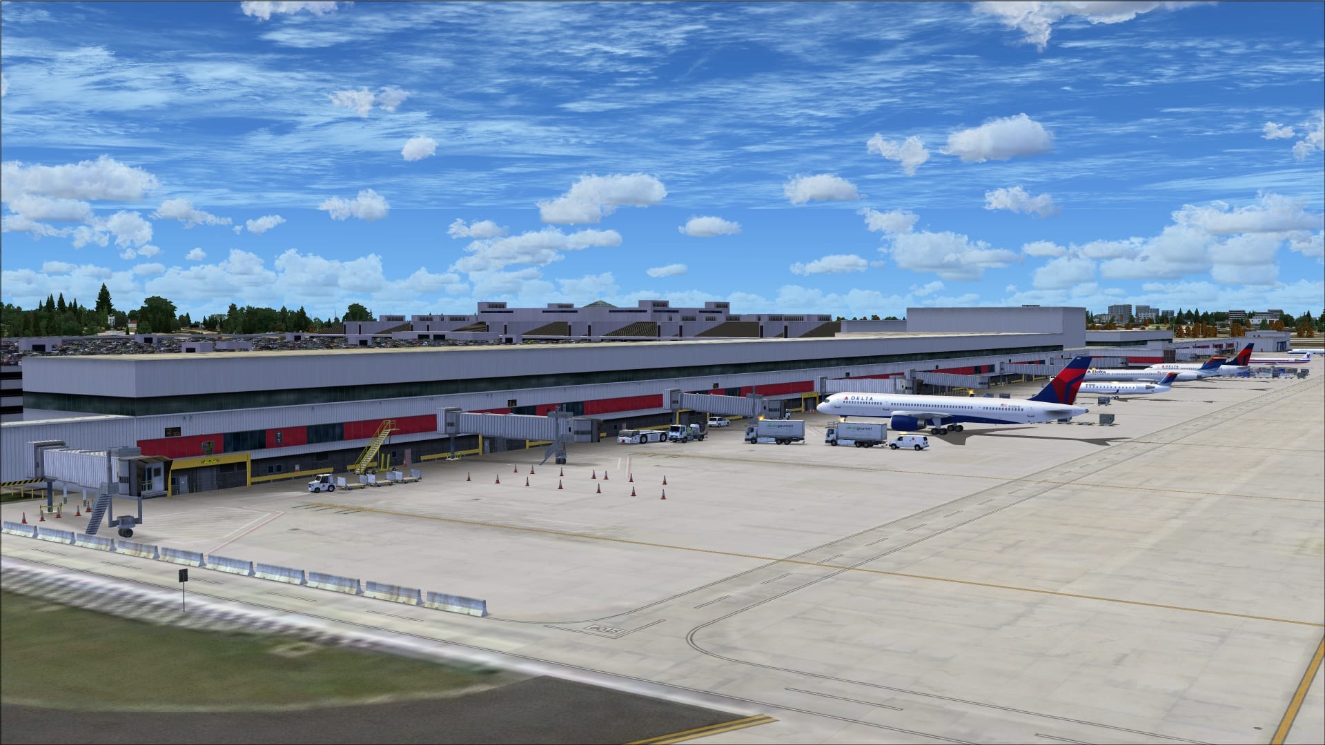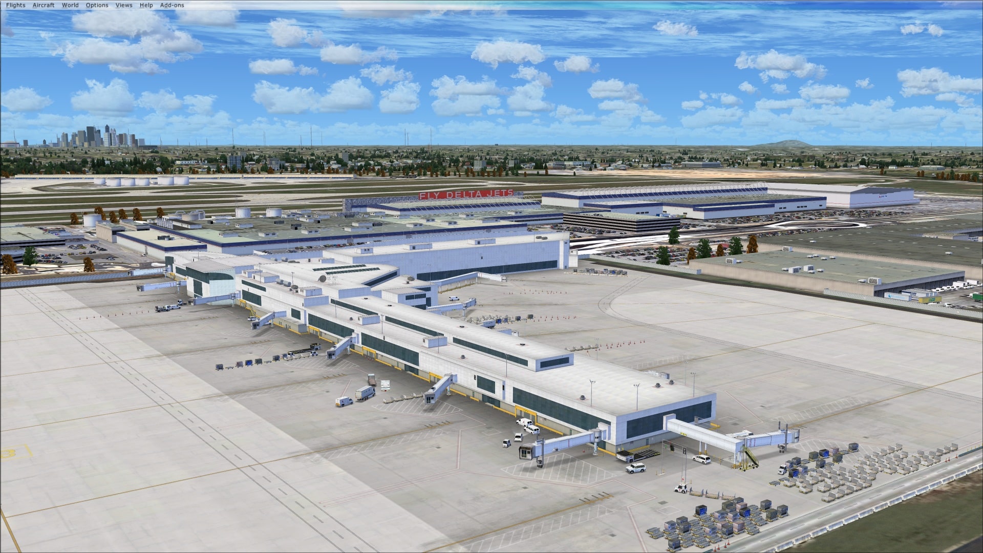 The aprons at Atlanta are extremely busy and cluttered. I don’t have the chance to do much real world flying however I have flown in and out of KATL several times over the past year and was amazed at how well this scenery portrays the hectic pace for this part of the airport. In amongst the parked aircraft are baggage carts and tugs, pushback tugs, catering trucks, refueling vehicles and a host of other vehicles mixed in.