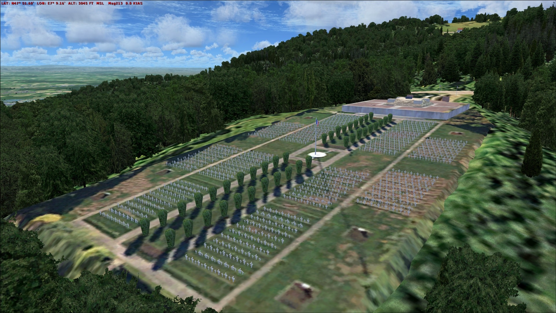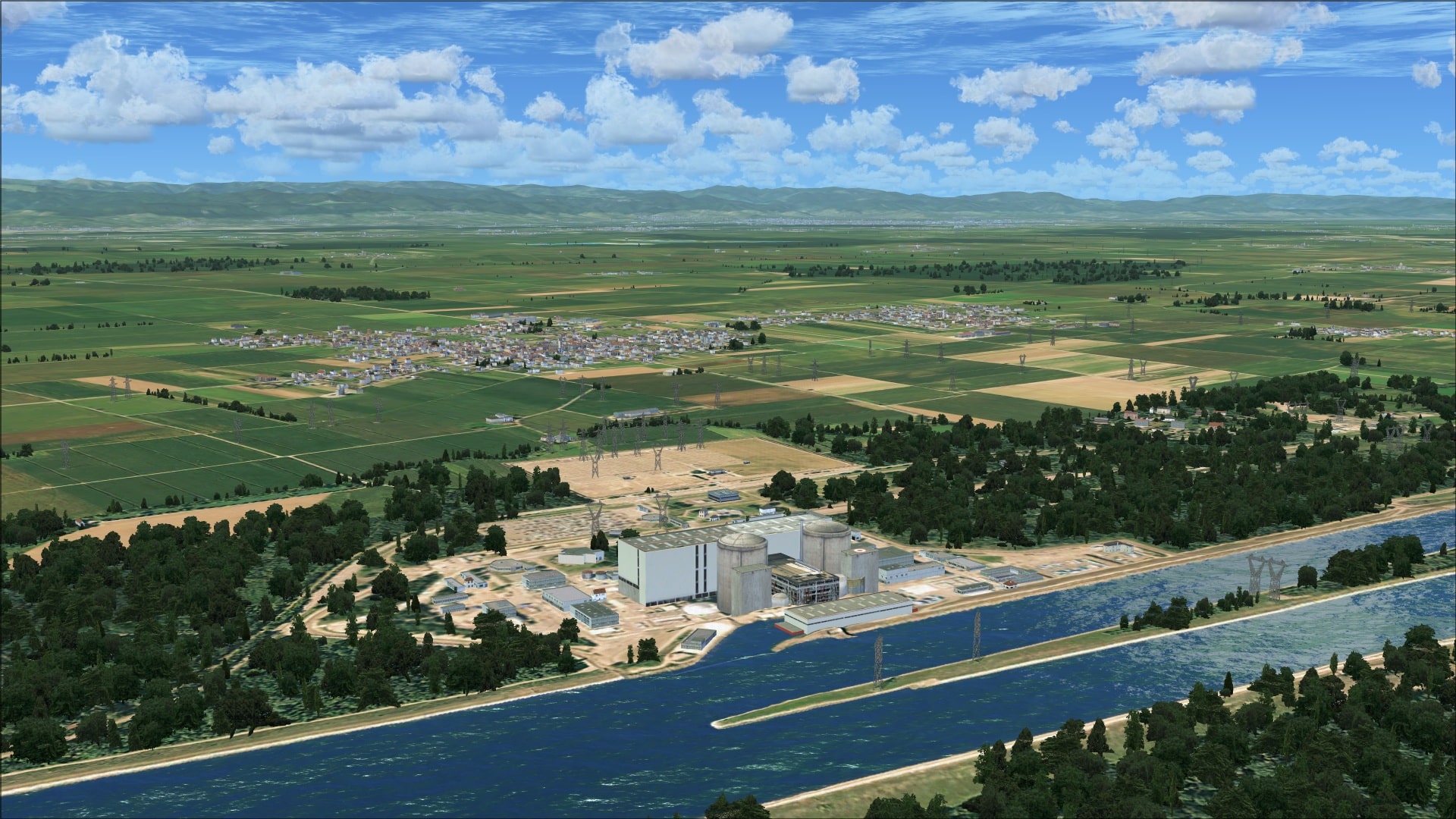 To simply show features on the ground textures isn’t enough. That may work at higher altitudes but as a VFR product you want to have what you see on the textures replicated with discrete 3d objects. In this scenery addon there is definitely no shortage in that respect; the number of objects and diversity in object types is another of the scenery’s distinguishing features. Visible throughout the scenery are the customary building types such as houses, apartment buildings, churches and warehouses, farm silos and water towers. This is just a short list of the more common types but they have included some that are more unique such as castles and power plants. Also in the scenery we see transmission towers, satellite dishes, cemeteries, road signs, etc.