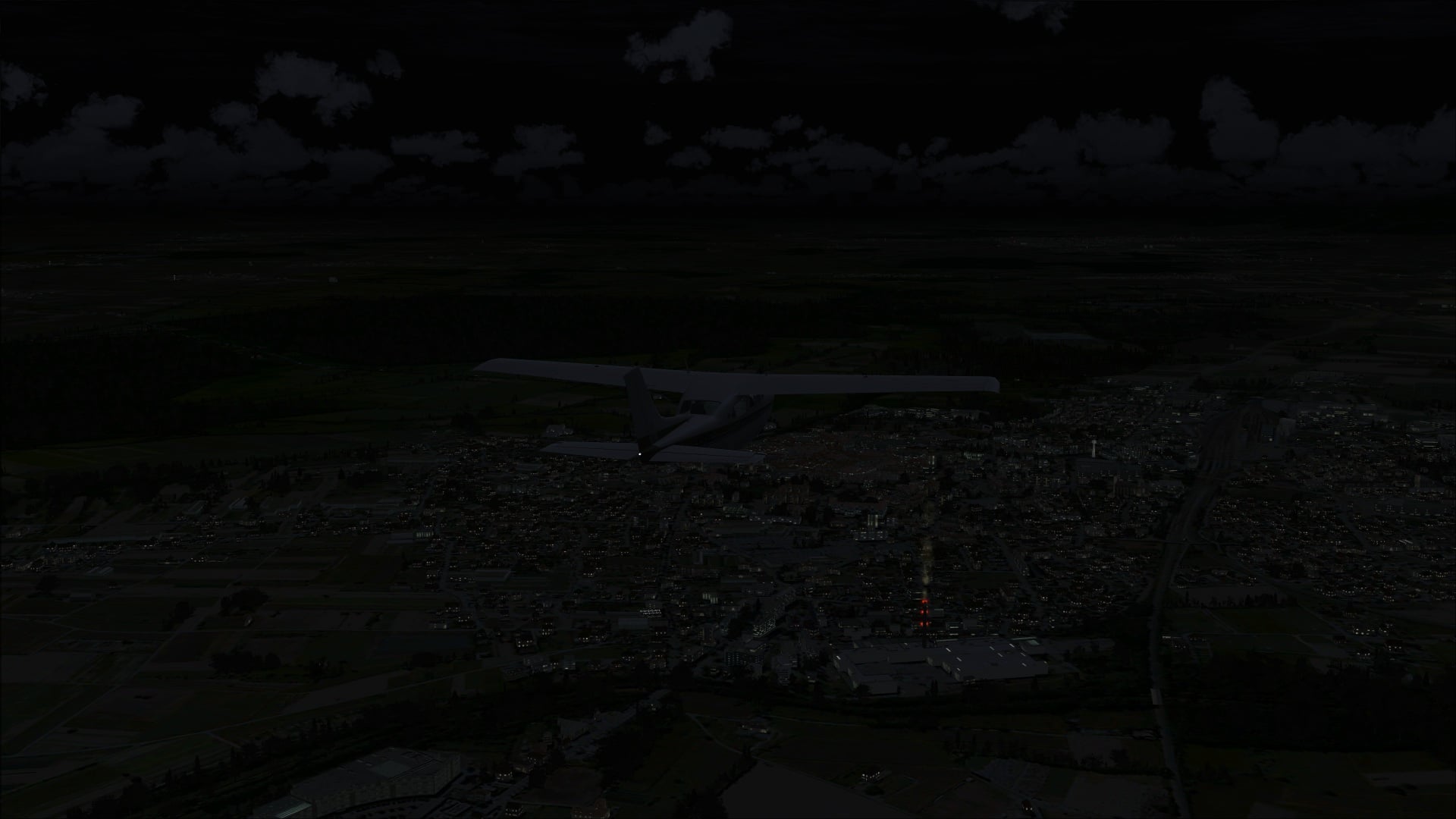 Alsace at night looked just as I was hoping it would, realistic. The built up areas were filled with the lights from houses and other buildings and the lights of vehicles could be seen moving along the major roadways. In between was the blackness of the countryside. As I flew around certain night time features did stand out; for instance the contrasting brightness of airport runway lights against the darkness of night made them quite visible and then there was the bright red lights seen on higher structures like transmission towers and industrial smoke stacks. All of these factors combined made for a night time environment that was very close to what you’d see if you were actually flying in the region.
