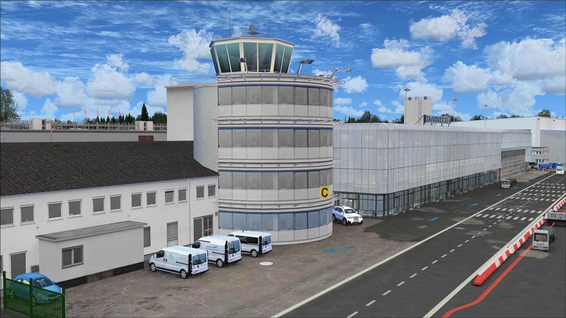 Quite often with photo scenery textures the lines on the roads and parking lots appear blurry and in my opinion draws attention to that blurriness. Here at Saarbruecken they’ve added these lines so they appear crisp and clear. Doing this seems to diffuse that blurriness and make them look that much better.