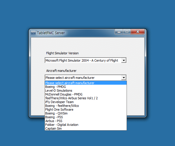 The first thing you need to do when activating TabletFMC is to run the server software. After the first slightly confusing moment as mentioned above, this is not a difficult task at all. There are three drop-down selection boxes to set – the first detailing the sim to be connected, the second an aircraft add-on developer and the third the exact package to be loaded. So, for instance, when running the PMDG B737NGX, you select Microsoft Flight Simulator X in the top box, Boeing – PMDG in the second and 737 (Left) or (Right) as you prefer, in the bottom box. That’s all you need to do with the server tool – after choosing your options simply start FSX, select the setup you want as usual and launch the flight.