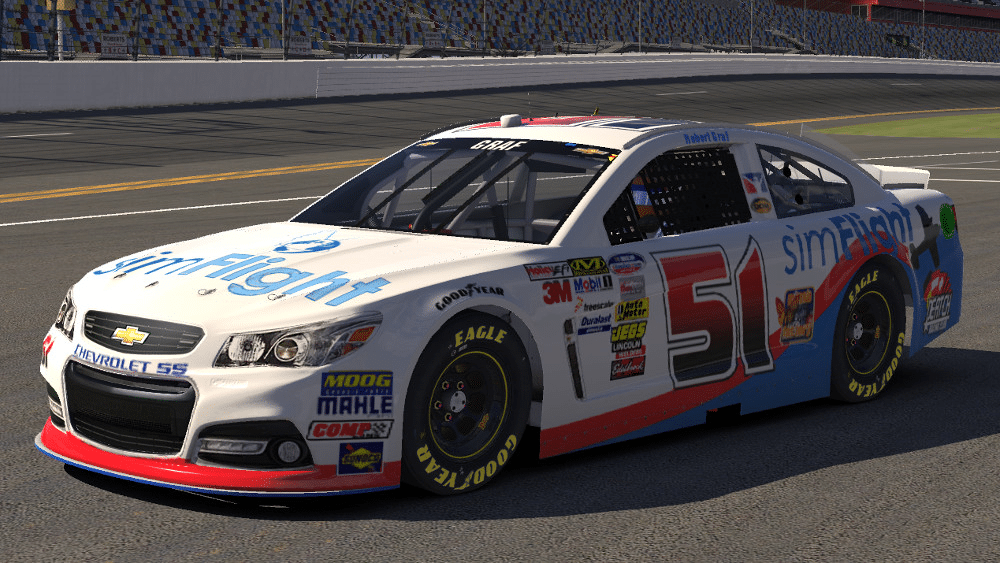 As mentioned at the beginning of his first race report for the season, the outing last week at Daytona was the last for the ‘current’ iRacing Chevrolet stock car as it is being replaced by a new model. Well, for those who are following Robert’s progress, he has forwarded the attached images of the new car in a new, updated, simFlight livery which I think you’ll agree looks pretty good!