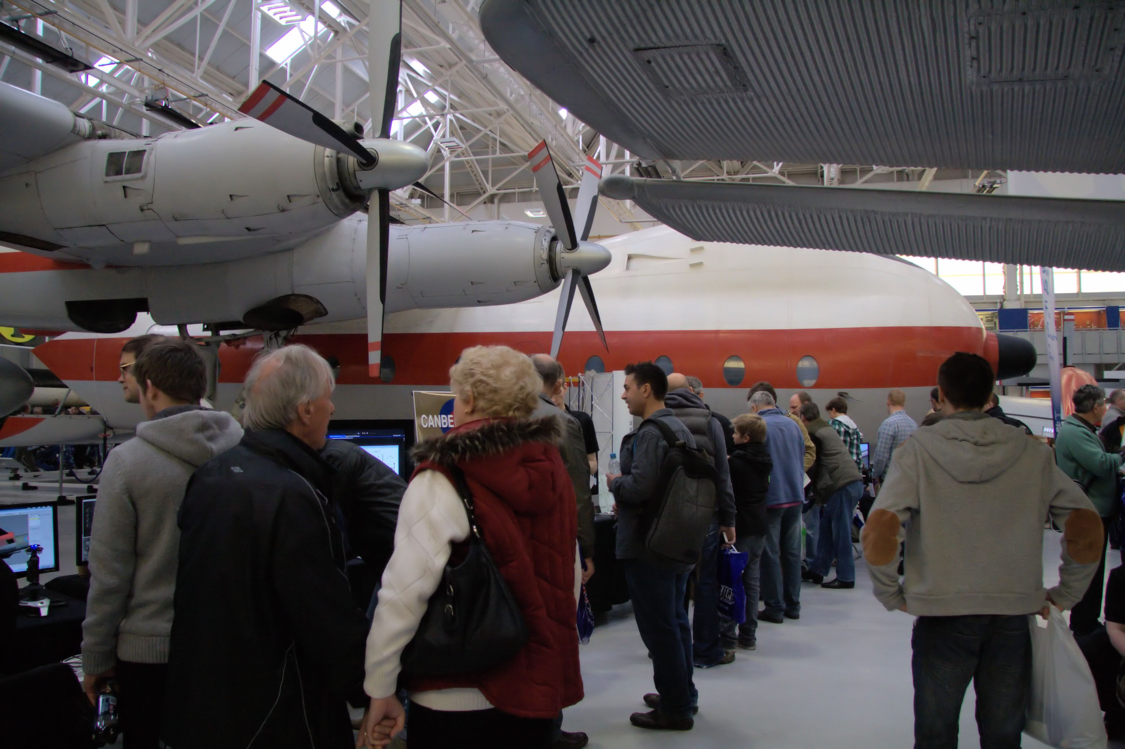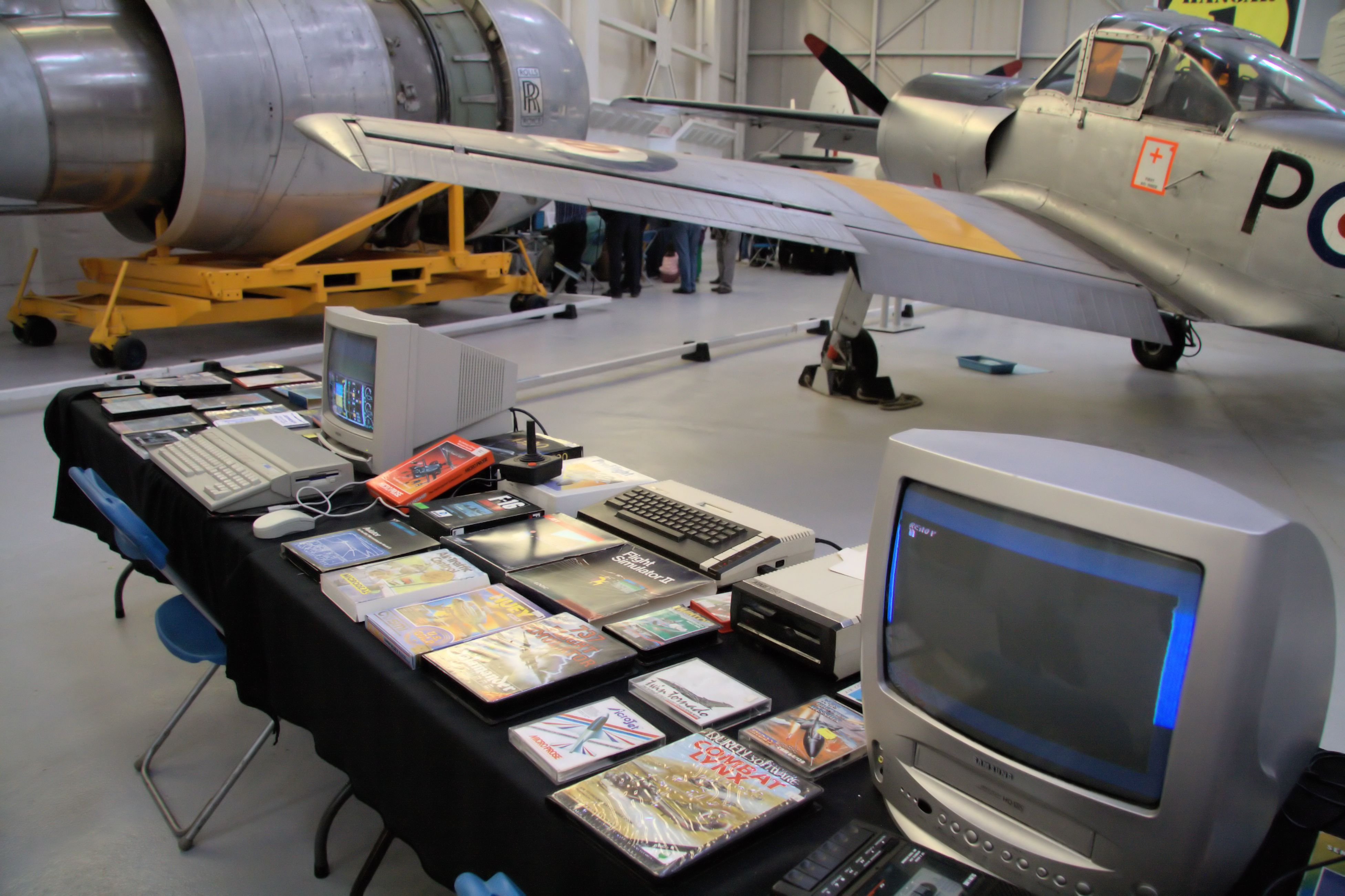 Bob Sidwick, of RC Simulations, whose Birmingham based shows were a mainstay of the British FS community for many years, had set up shop alongside the German V weapons display and was getting significant interest in his own designed and built hardware, at the opposite end of the hangar, while the Argosy transport and CASA 352L (Ju52/3M) provided the closest backdrops to a row of stands including a demonstration of JustFlight’s upcoming Canberra, the landing competition (which also spent some time demonstrating A2A Simulations’ Accu-Sim C172 Trainer) and Alex Ford’s collection of flight sim memorabilia, which had large numbers of visitors exclaiming ‘Good grief! I’d forgotten I ever had that! Brilliant!” and similar words. VFR Poland were also present in this area, providing visitors with codes for some of their products… if you need more, of course, you can get them here. 😉