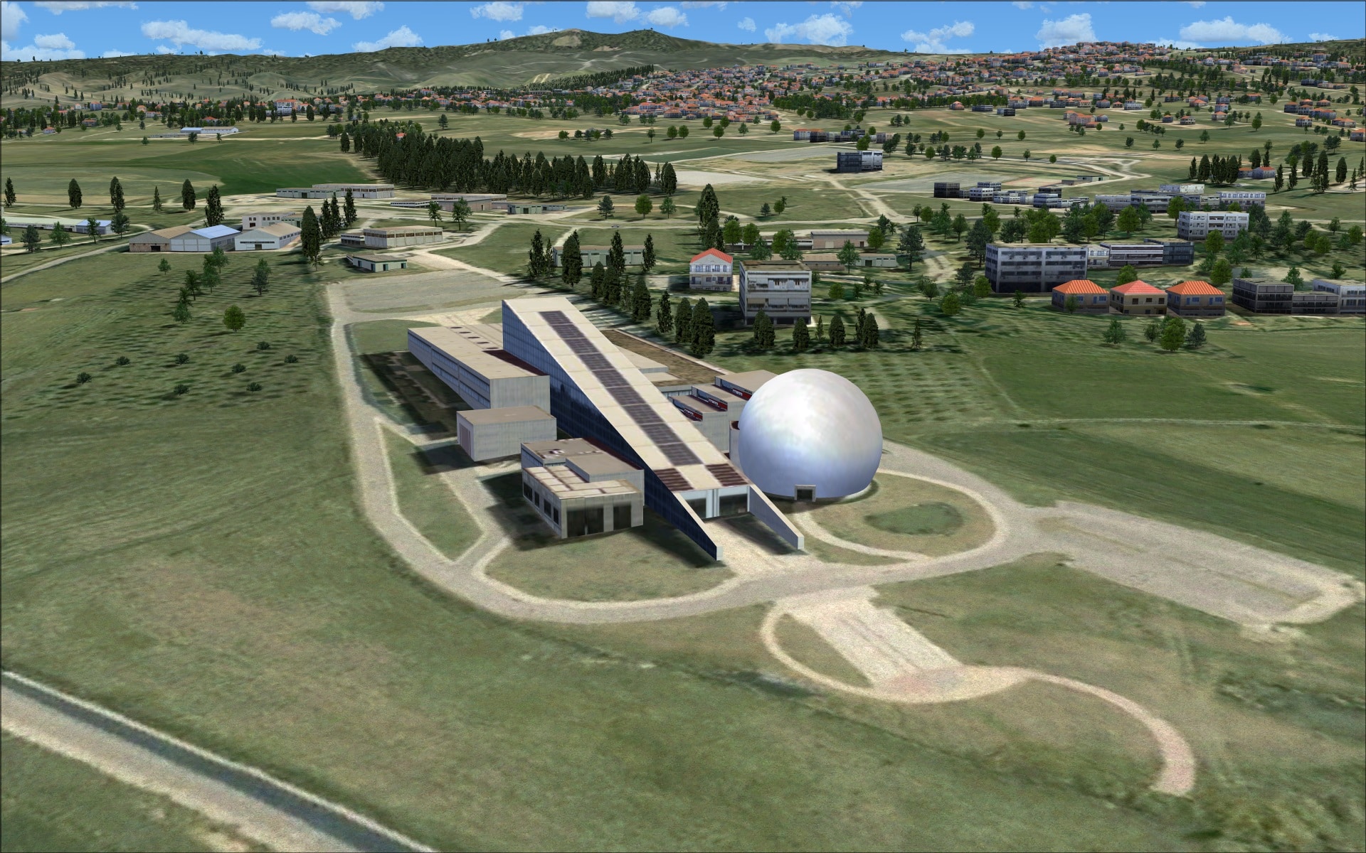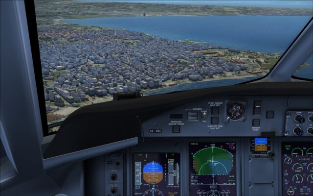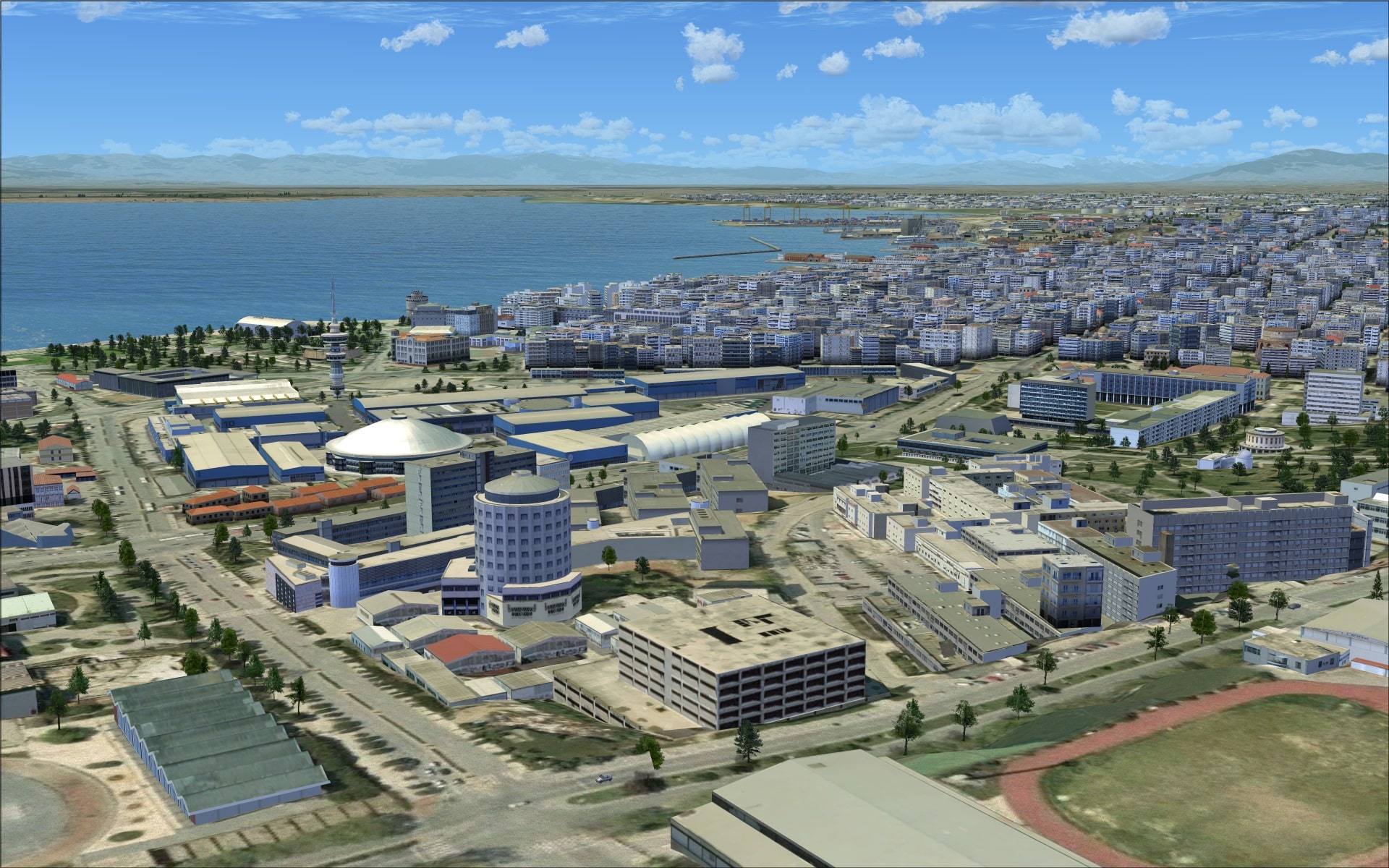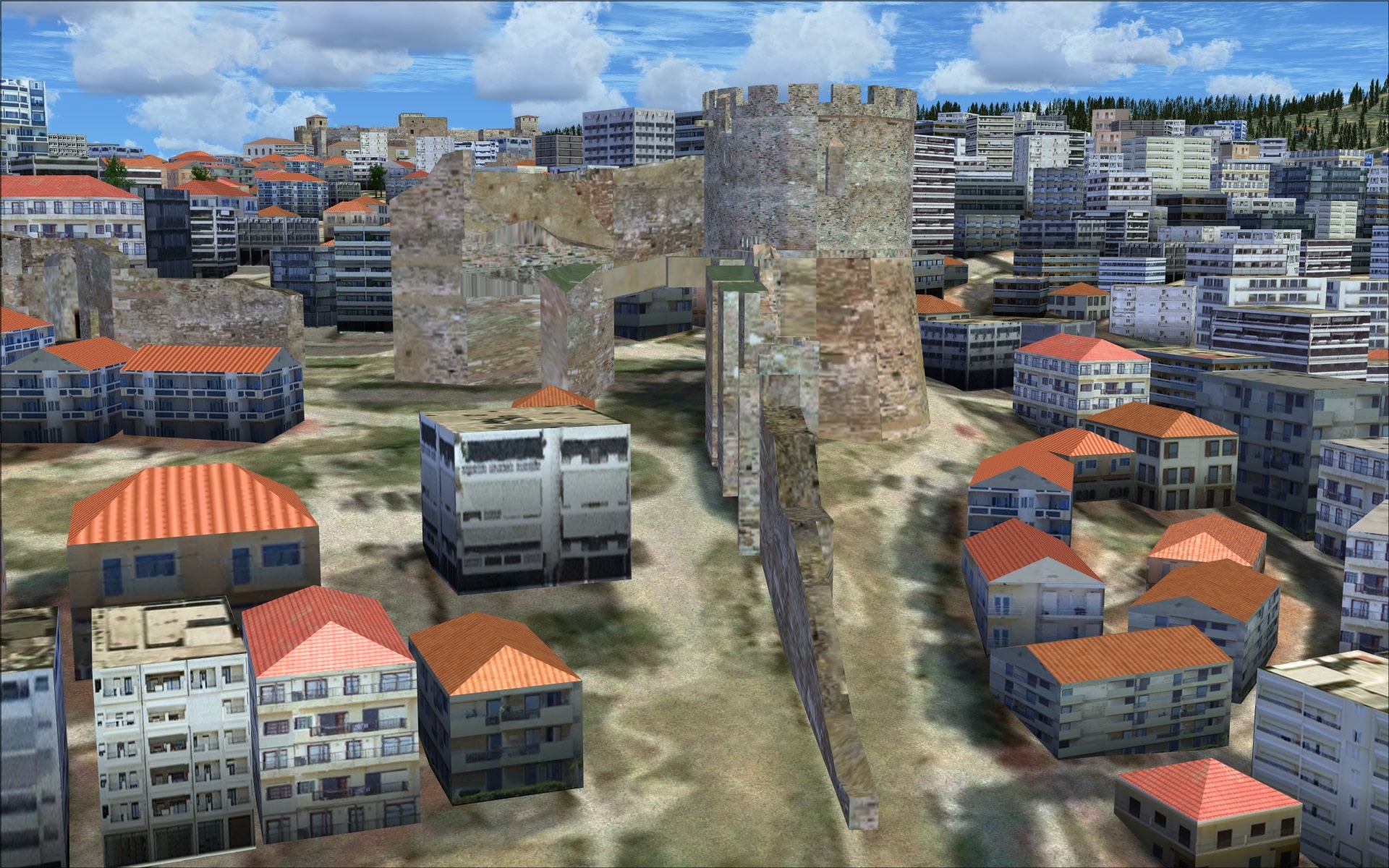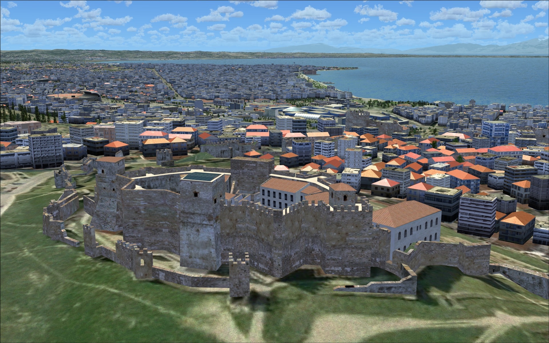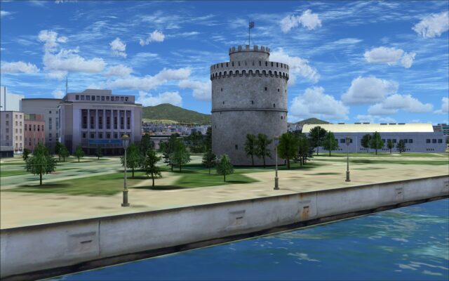 Often times developers will include an area near the airport to up the visual experience while on approach or departure. They might include photo ground textures and then populate the area with buildings. This group has done that and more. What they’ve done is model the area bordering the Thermaic Gulf to include the city of Thessaloniki of course and the neighbouring suburbs of Kalamaria, Evosmos and Kalochon. The entire area is covered in high resolution photo ground textures and populated with thousands of objects, many of them being custom; the results are stunning. Custom structures are everywhere and they are detailed. They include sports facilities, shopping centers, historical sites, the university, Thessaloniki Observatory, an amusement park, the Port of Thessaloniki and the OTE Tower and on and on. Flying over the city and surroundings just doesn’t get old. Coming in for final approach to runway 16 was amazing.