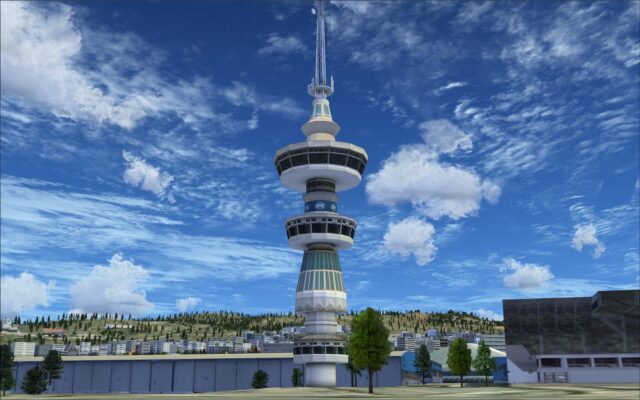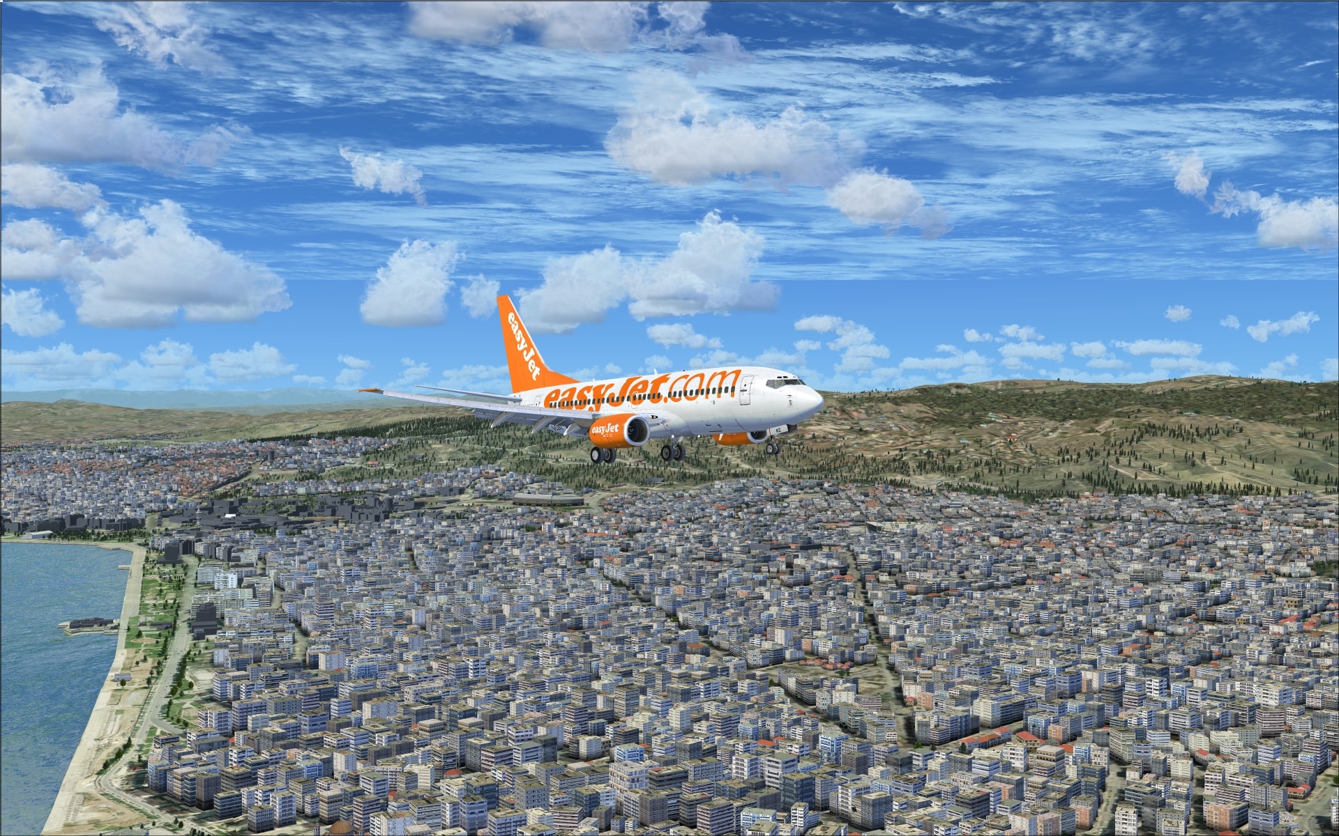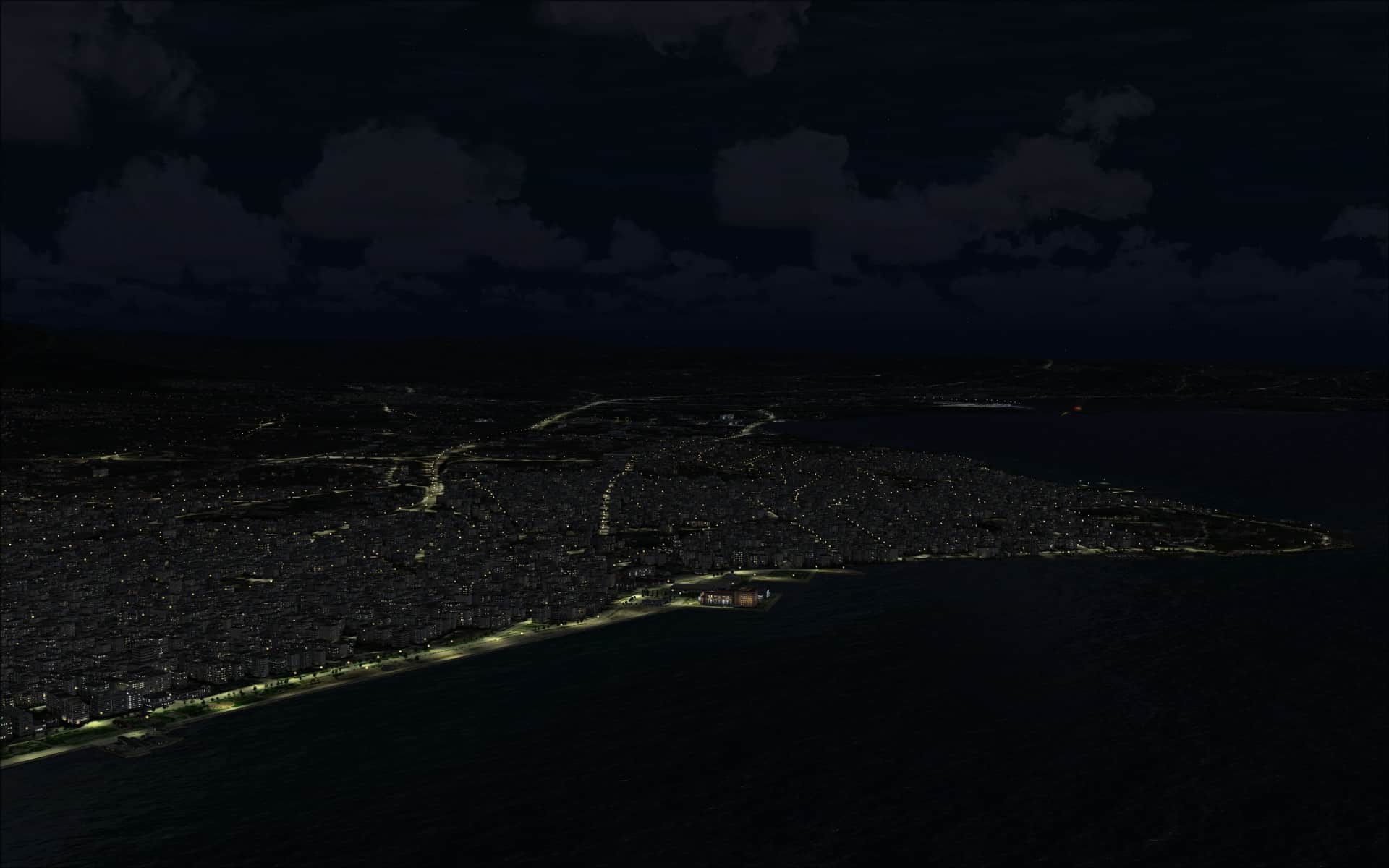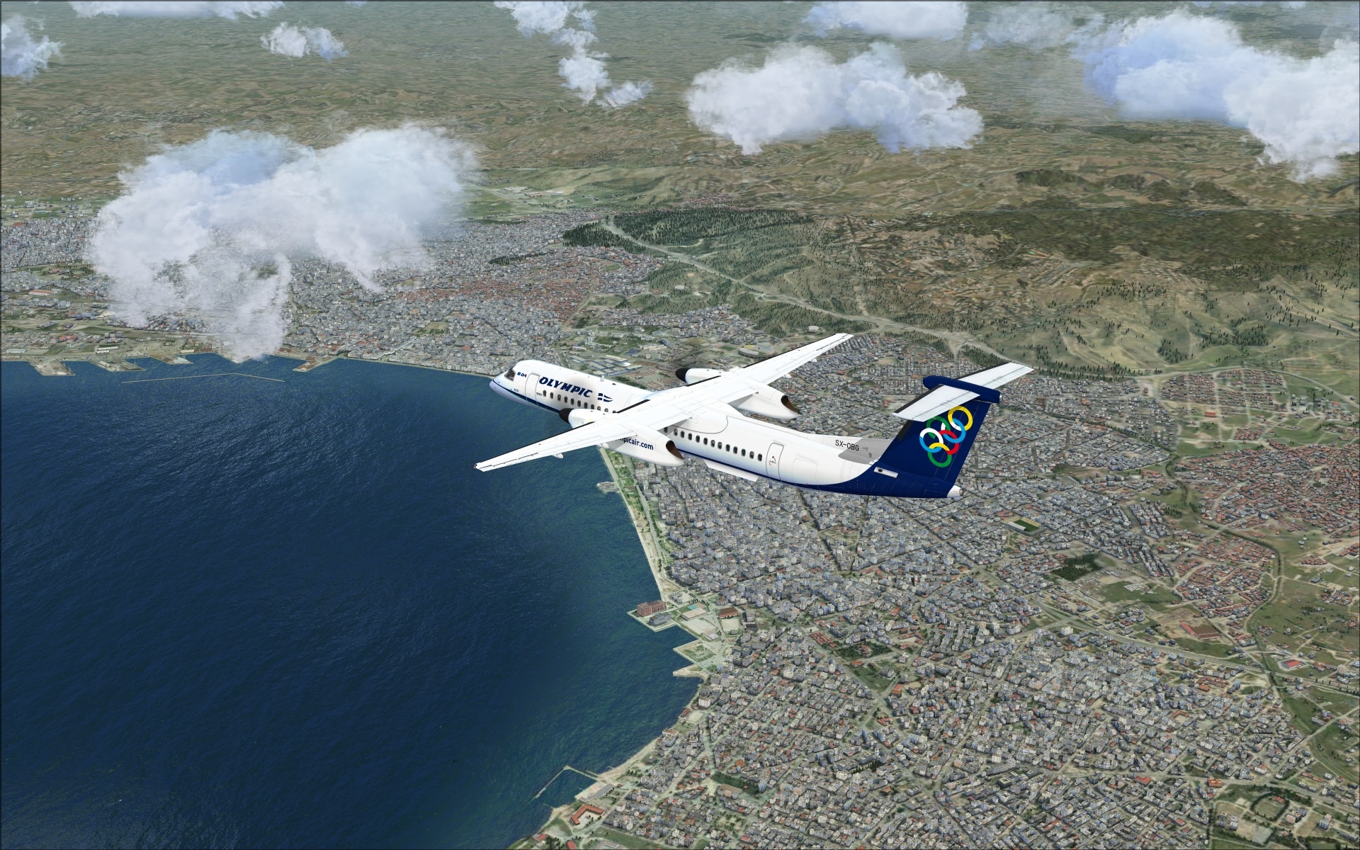 Often times developers will include an area near the airport to up the visual experience while on approach or departure. They might include photo ground textures and then populate the area with buildings. This group has done that and more. What they’ve done is model the area bordering the Thermaic Gulf to include the city of Thessaloniki of course and the neighbouring suburbs of Kalamaria, Evosmos and Kalochon. The entire area is covered in high resolution photo ground textures and populated with thousands of objects, many of them being custom; the results are stunning. Custom structures are everywhere and they are detailed. They include sports facilities, shopping centers, historical sites, the university, Thessaloniki Observatory, an amusement park, the Port of Thessaloniki and the OTE Tower and on and on. Flying over the city and surroundings just doesn’t get old. Coming in for final approach to runway 16 was amazing.