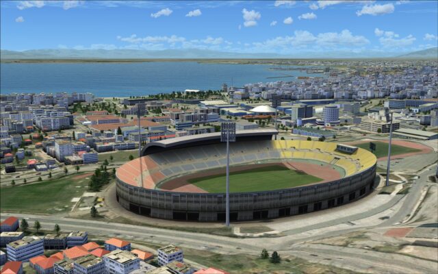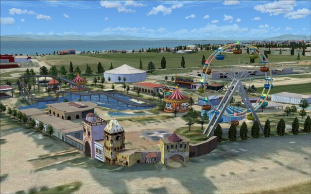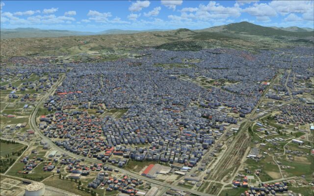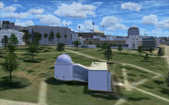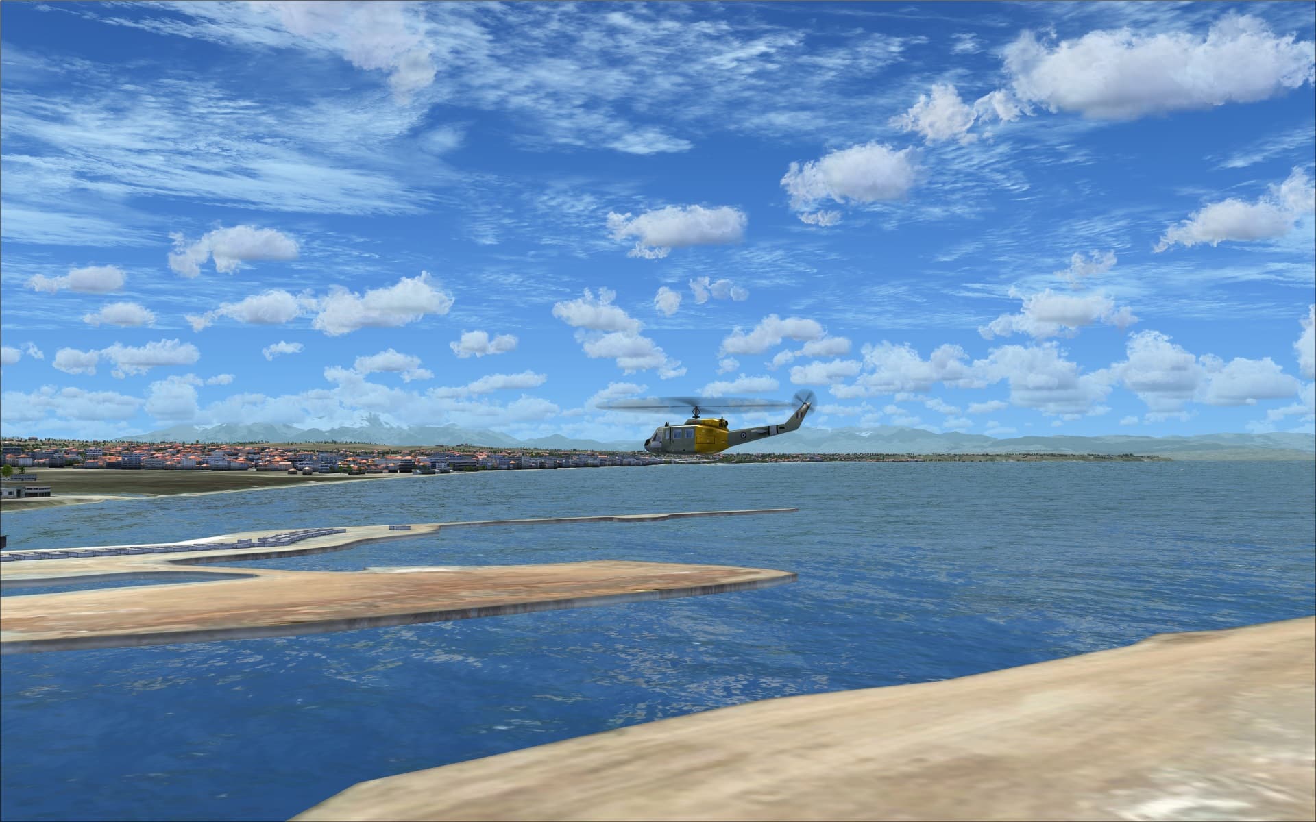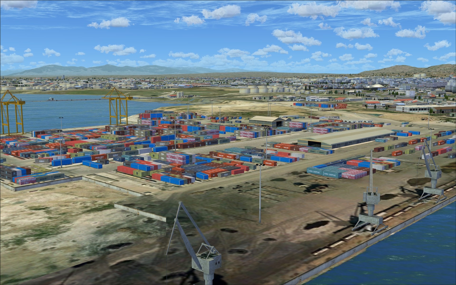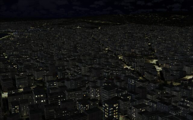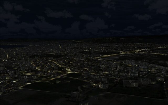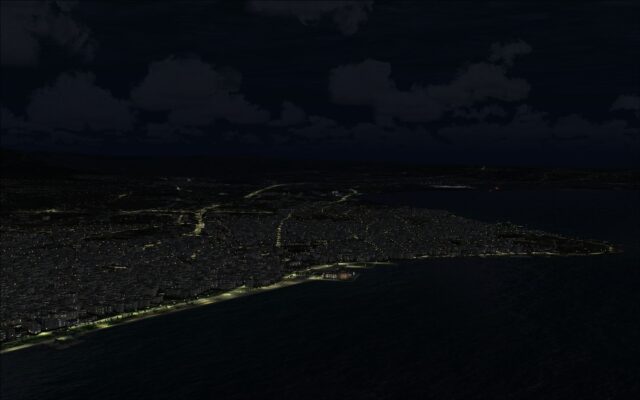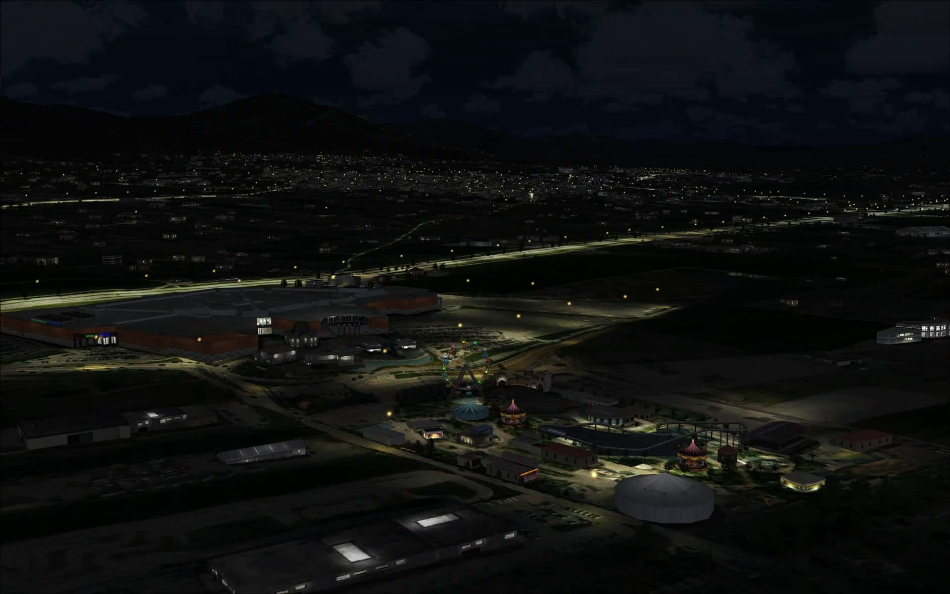 Often times developers will include an area near the airport to up the visual experience while on approach or departure. They might include photo ground textures and then populate the area with buildings. This group has done that and more. What they’ve done is model the area bordering the Thermaic Gulf to include the city of Thessaloniki of course and the neighbouring suburbs of Kalamaria, Evosmos and Kalochon. The entire area is covered in high resolution photo ground textures and populated with thousands of objects, many of them being custom; the results are stunning. Custom structures are everywhere and they are detailed. They include sports facilities, shopping centers, historical sites, the university, Thessaloniki Observatory, an amusement park, the Port of Thessaloniki and the OTE Tower and on and on. Flying over the city and surroundings just doesn’t get old. Coming in for final approach to runway 16 was amazing.
